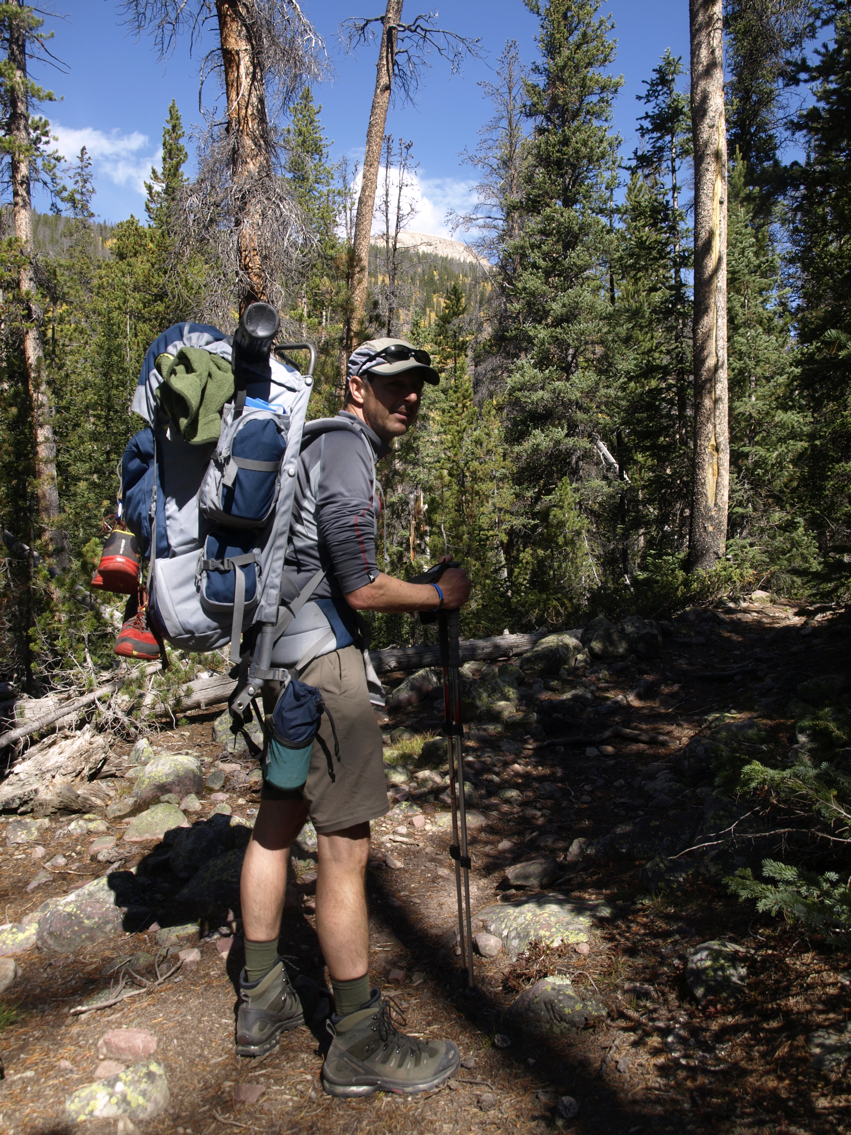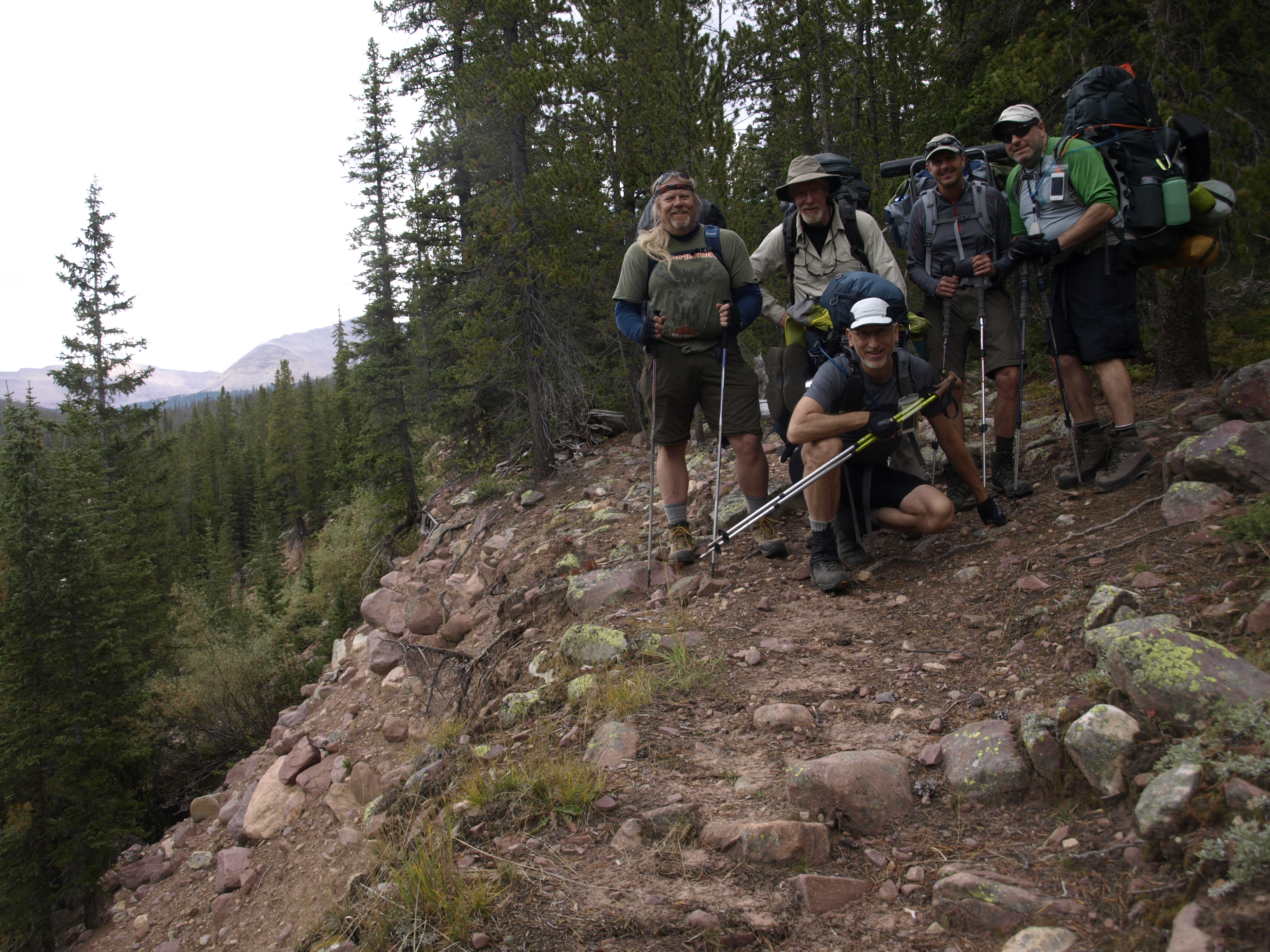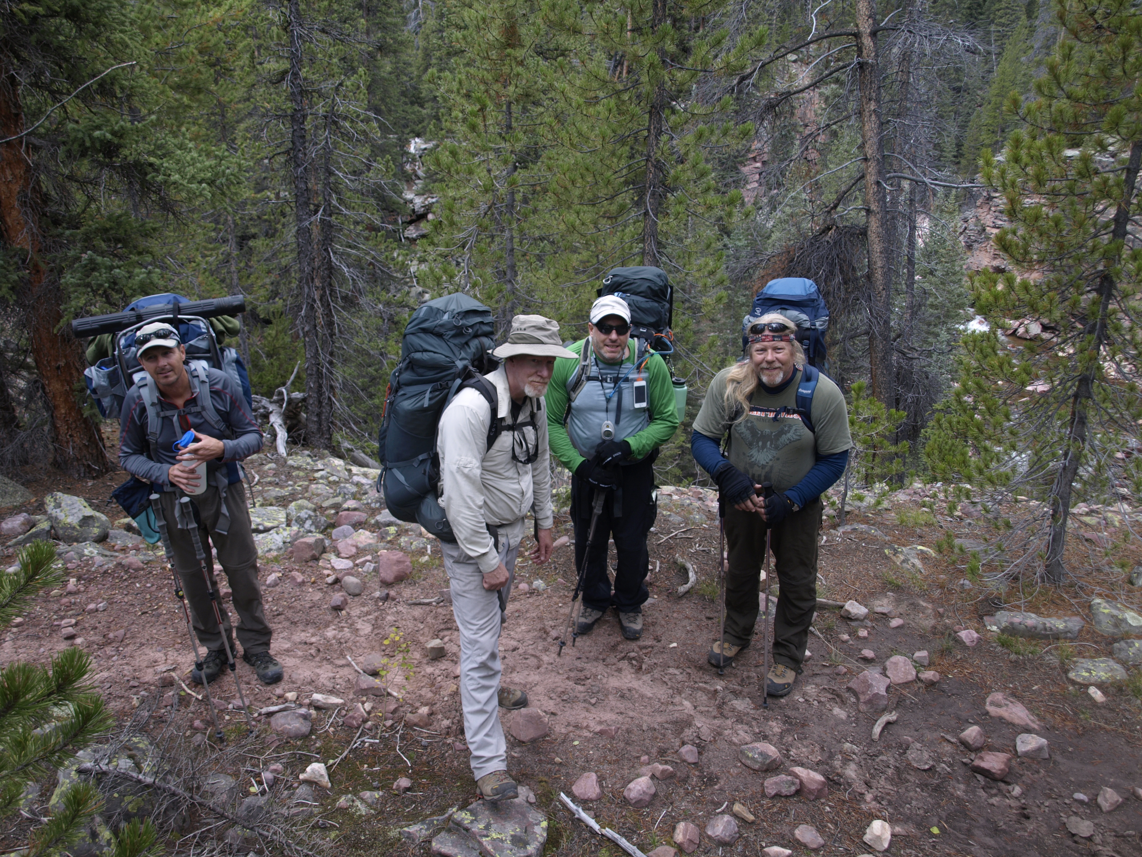 We did encounter the horse folks before we made it to the next trail junction. Walt may have been in the lead and called back to us that horses were approaching, and we all made our way off the trail to give the horses the full path. Turns out it was three men on 4 horses, one being a pack horse and the other three bearing their human burdens. We chatted a bit, but we didn’t chat long. Whether they were hunters, or a guide and two people being guided, we didn’t find out. One guy did have a rifle in a saddle holster but it didn’t look like a hunting rifle. It looked like a “If we need something, we have this rifle” kind of rifle. We parted ways exchanging supportive travel wishes to each other and we continued. We didn’t see anyone else until Anderson Pass the next day.