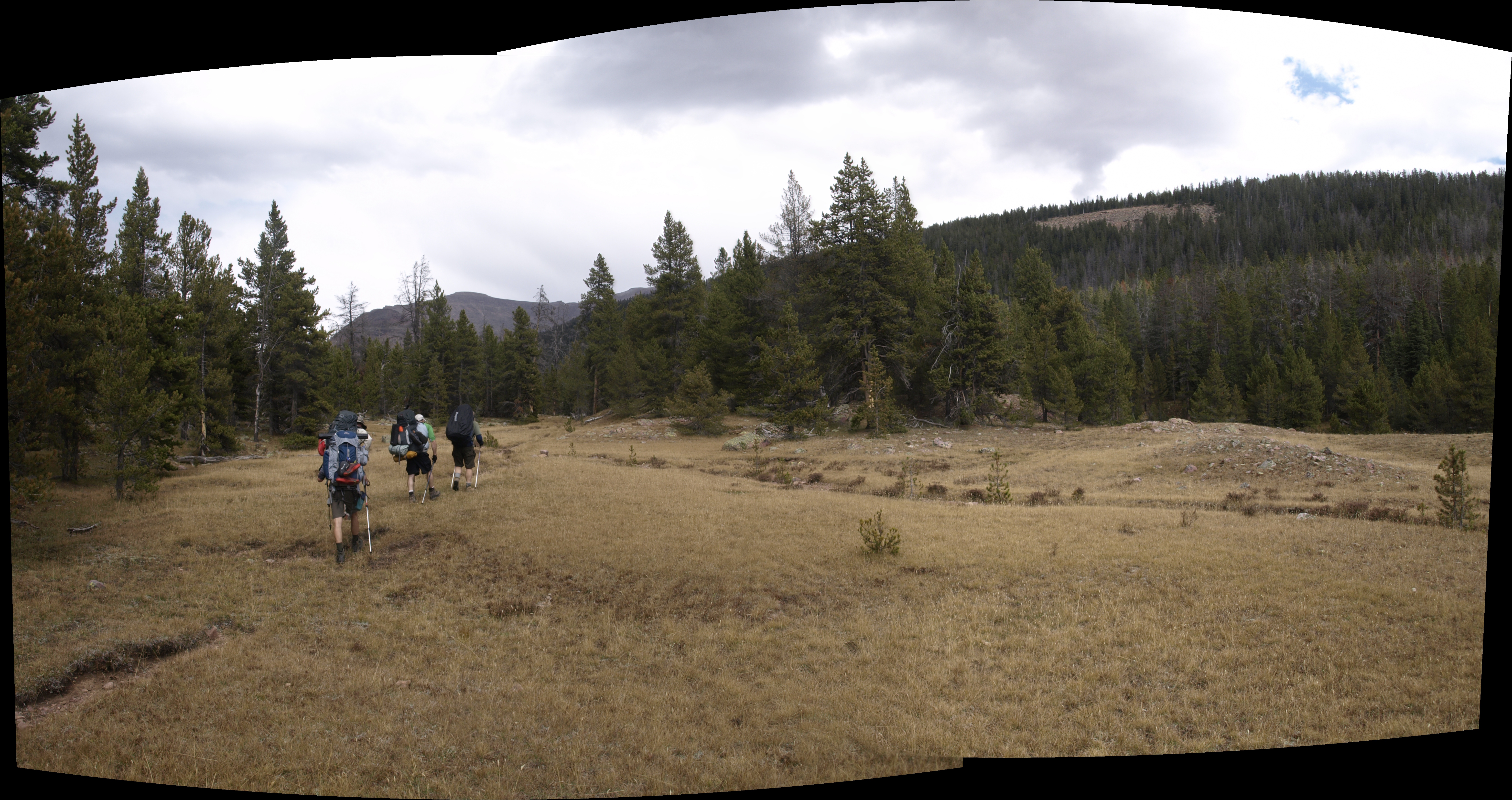 As with the previous day, as the day worked its way into mid to late afternoon people started to think about the next camp site. Tungsten Lake was out, and now we were heading for a side creek crossing coming in from the W, after which the trail bears NW and moves away from the Yellowstone. The map showed flatter ground, and perhaps we could find an existing fire ring. So onwards we pushed.