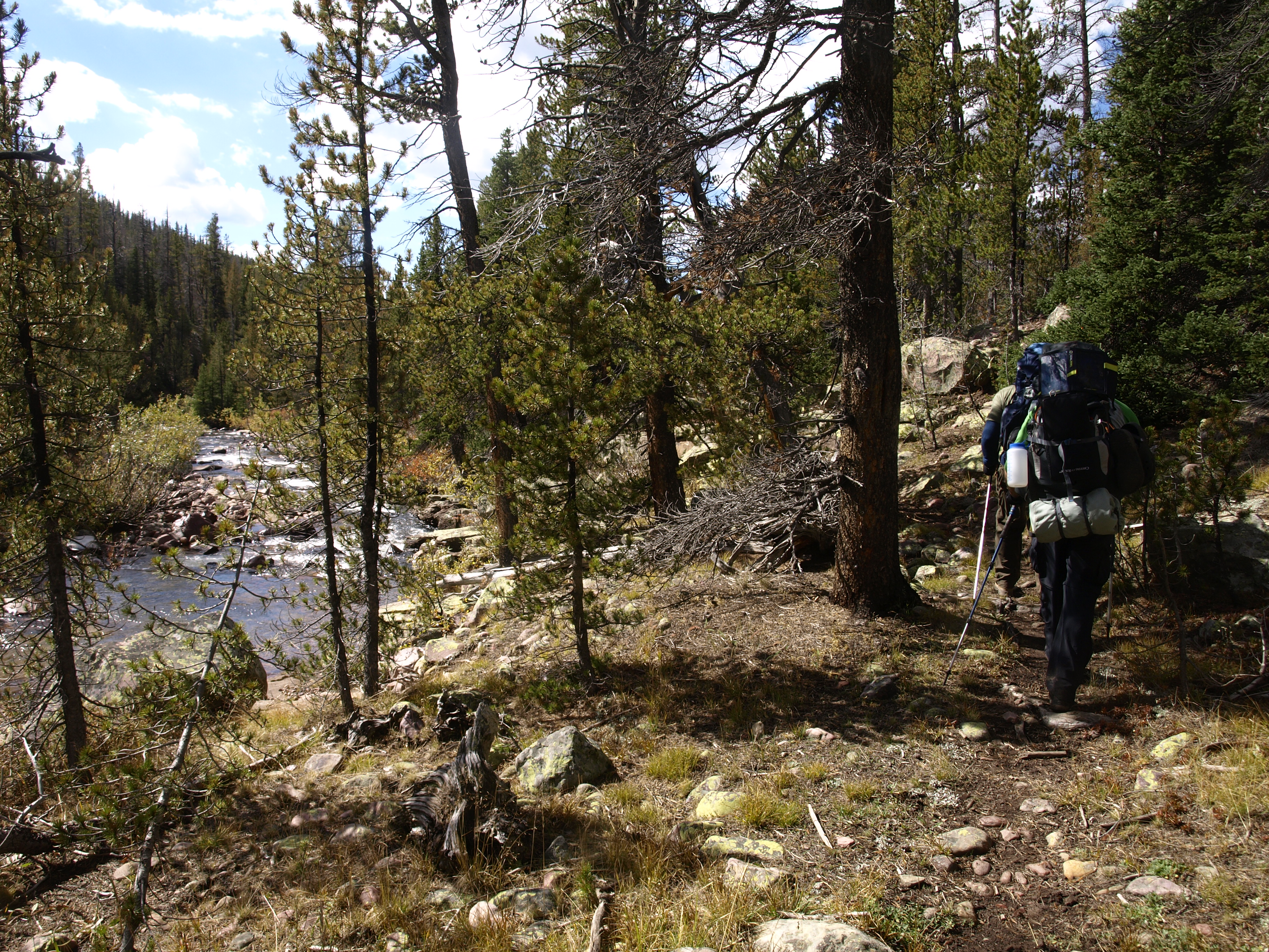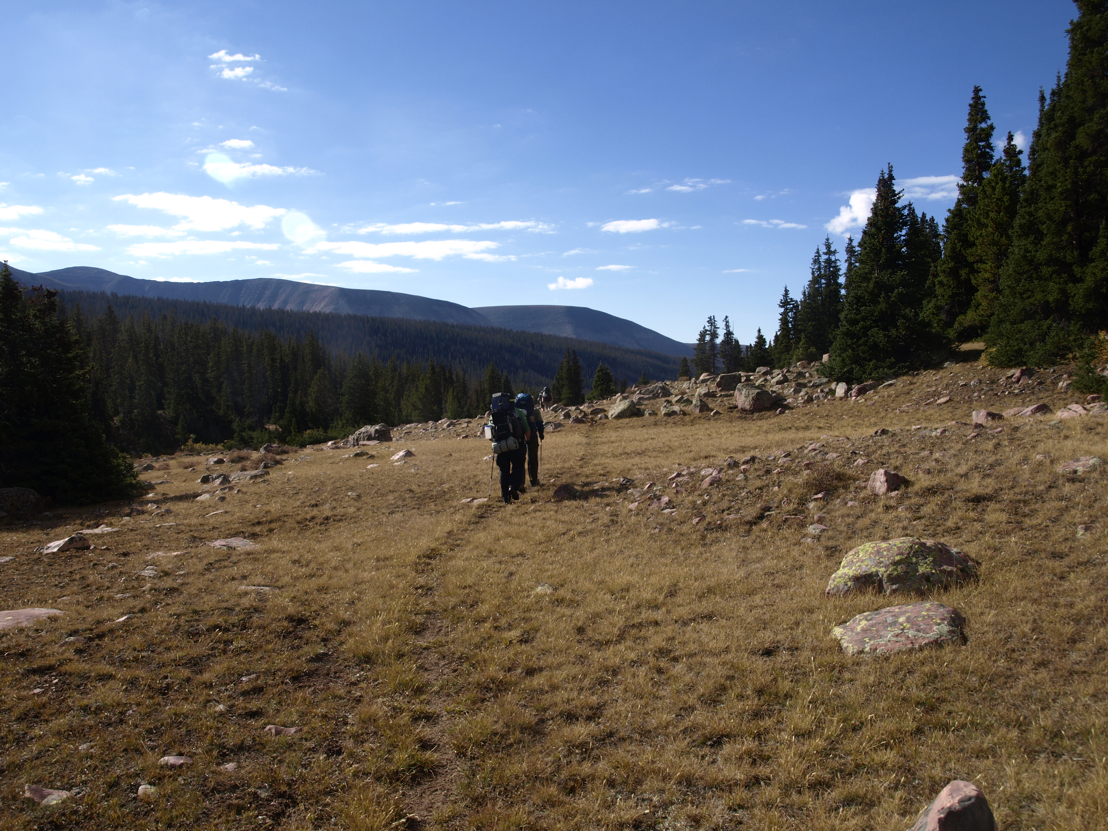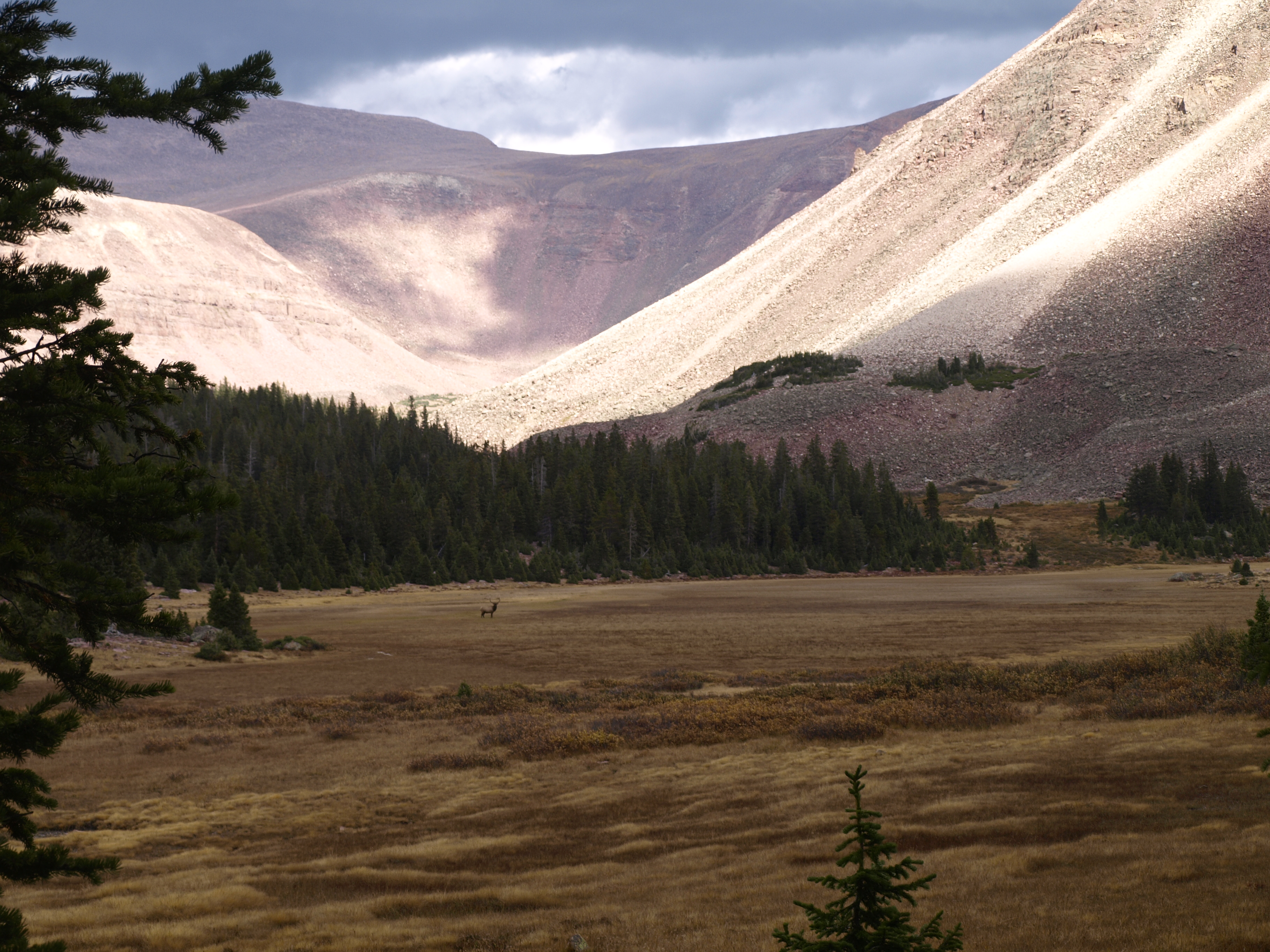 After lunch, it was time for Larry and I to move on ahead, attain Milk Creek, find a camp site, and settle in. The appearance of potential weather added an urgency to getting camp set up. Nothing was upon us yet, but I think you can see from the pictures that follow, dark clouds were around, and yet, the surrounding ridges had bright sunshine for some magical contrast.