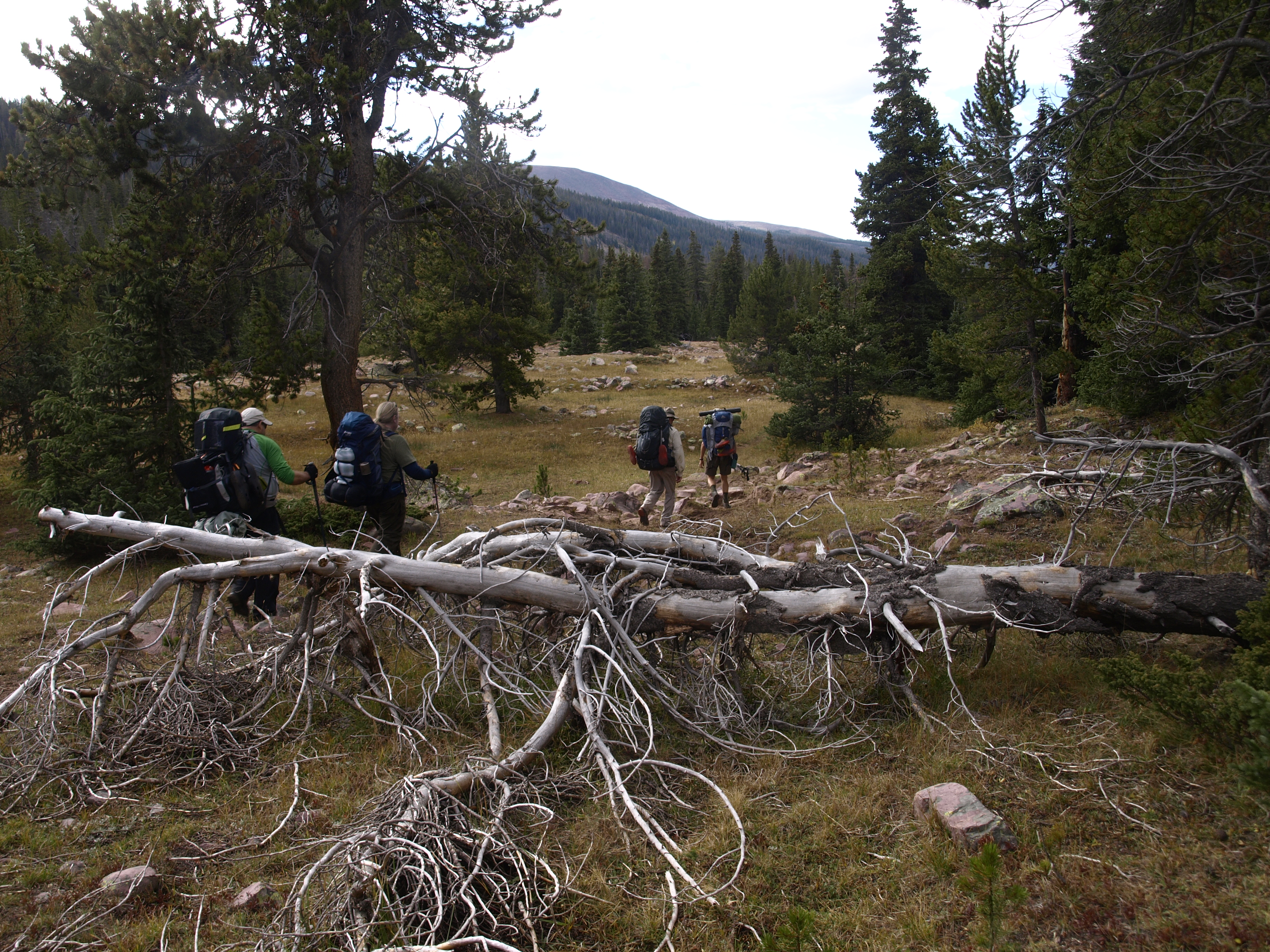 Total distance was going to be about 7 miles, maybe 8, where we cover about 4-5 down hill, and then the final 3-4 uphill. Something we were all looking forward to was the possibility of fishing Milk Lake. Because of its remoteness, the fishing pressure on it is deemed light, and there were no overuse restrictions applied by the Utah DNR with respect to how closely you could camp to the lake. We had noted at the trail head that many of the named lakes in the basins we were exploring had 1/4 mile camping restrictions, meaning that overuse had caused much of the fallen wood to be burned, and that previous parties had chosen to start cutting down trees to burn. High elevation environments are very sensitive, and growth is a long and slow process. Built into that process is decay. It is the decaying organic matter that provides some of the nutrients to the new growth, so if all the dead matter gets burned, then that leaves little for preserving the local environment. Fungis require dead plant material.