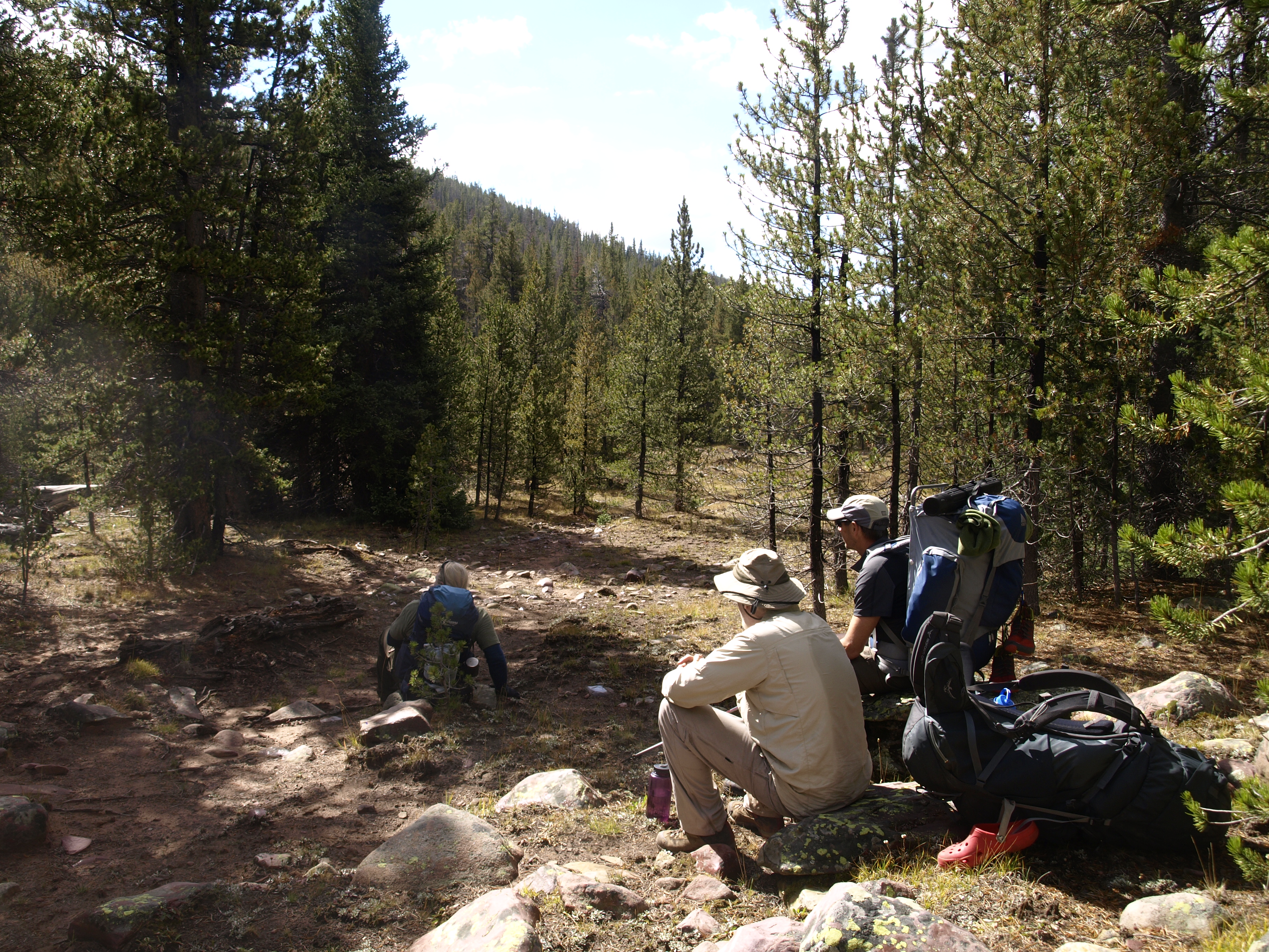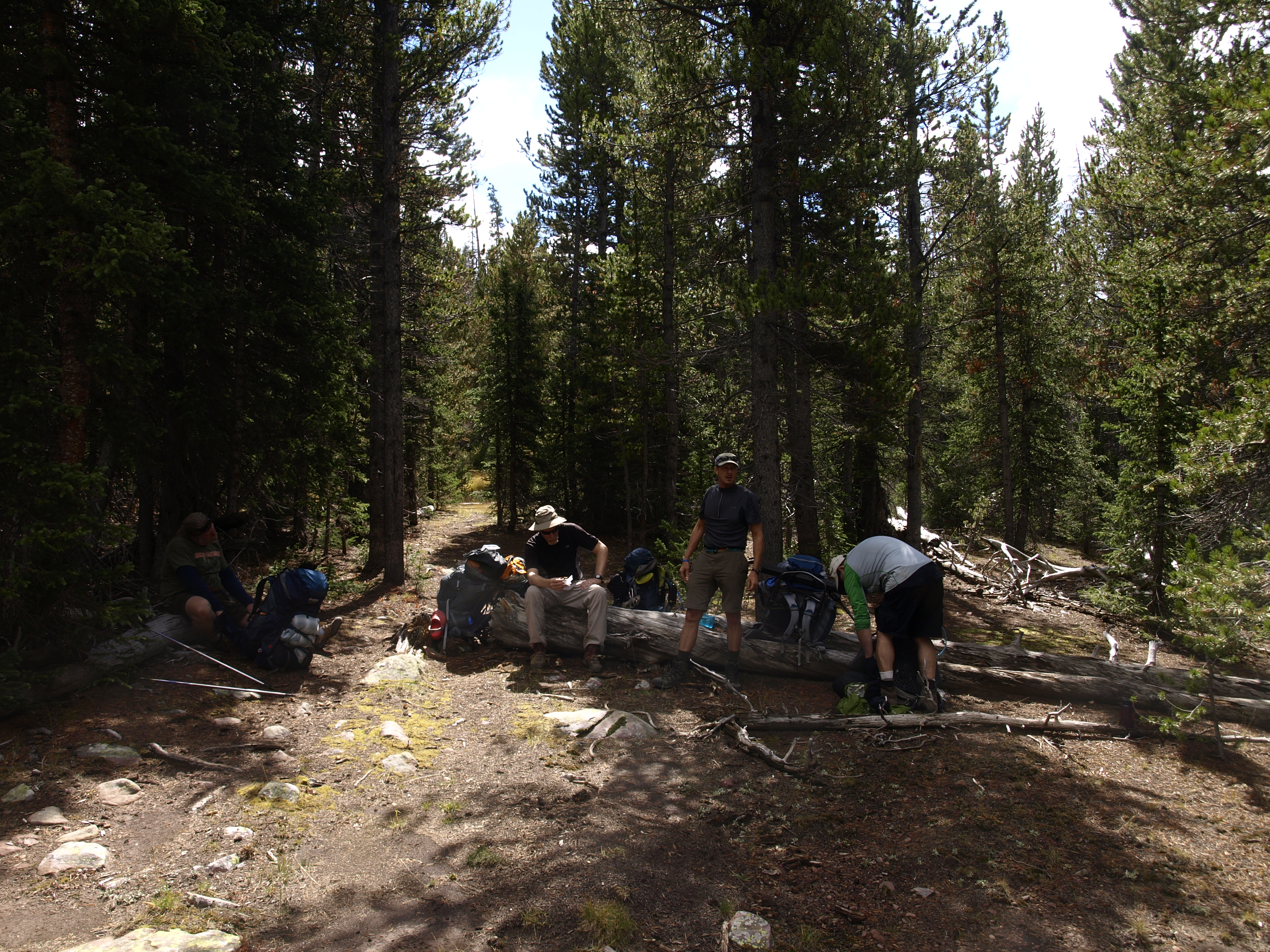 Day 4 is upon us. We will be moving camp from our current elevation, back down the Yellowstone, and then up the Bluebell Pass trail to Milk Lake. The net change in elevation will be almost +300′, but we need to lose 600′, and then gain back the 900′. We will be covering some of the same ground that we did on Day 2, however, we will hang a left when we get to the first trail junction. The hike back will have us recross the Yellowstone again, and we will have also to recross Milk Creek, which was a little dodgy the first time. Once we make the left onto Bluebell though, the terrain changes from a long valley walk, to a hill climb. The map indicates switchbacks, but there isn’t anything written which says how many, and how long they last. Reading the map says, there is about 1.2 miles of initial switchbacks, and then it levels off for a bit, re-connects with Milk Creek, and then ascends a little more mildly to the trail junction with Milk Lake. There, a spur will climb the final stretch to the lake where we will commence the search for a fire ring.
