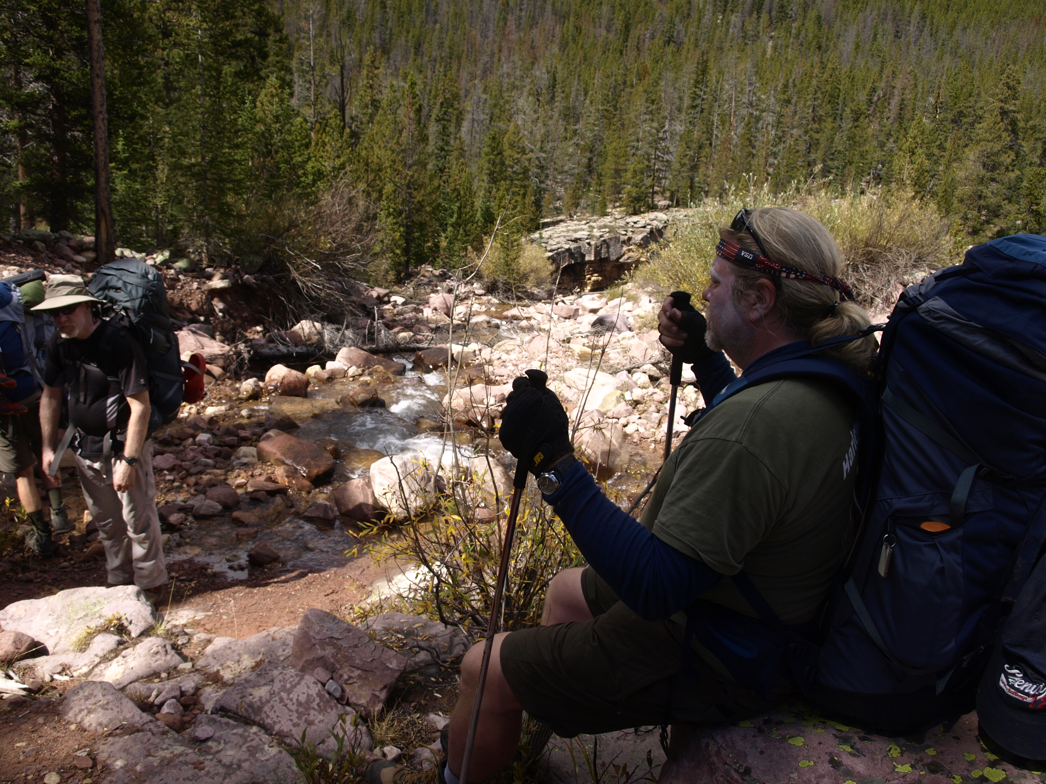 Funny thing happens when time passes, and a creek drains a limited area. As water drains out, unless there is a big storm to replenish the supply, the overall flow declines. Milk Creek was 4 inches lower on our return than it was 2 days earlier. We crossed in a breeze, and took the opportunity to hydrate, and Steripen some water. We don’t want to climb with too much water, but we do need to drink as we climb. We all worked to drink up regularly all morning raising our individual hydration levels, so we only needed about 4L of water.