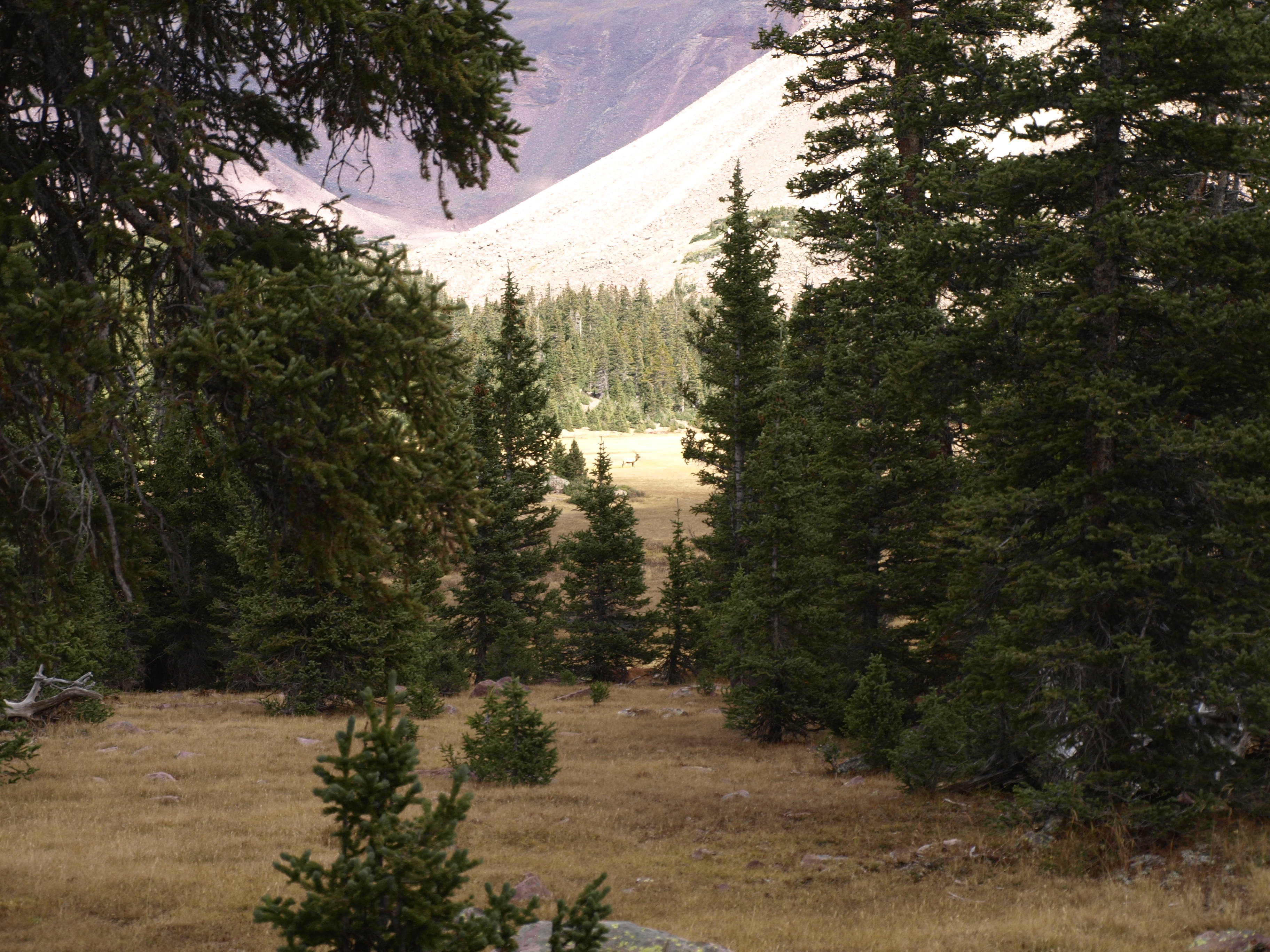 The trail angled back to an Easterly path, and gained elevation again, though not as steep as before. We quickly gained ground on our companions, and as we reached the next high elevation meadow, we broke out to bear witness to a massive bull Elk. We emerged from the forest down wind of this beautiful animal, so he had no warning of our approach. The first picture is our first sighting, and then we moved along the edge of the meadow to get a better viewing location. He did eventually notice our movements, and this triggered his safety response. My telephoto capability was limited, but you might be able to zoom in and get some idea of his size. Stately.