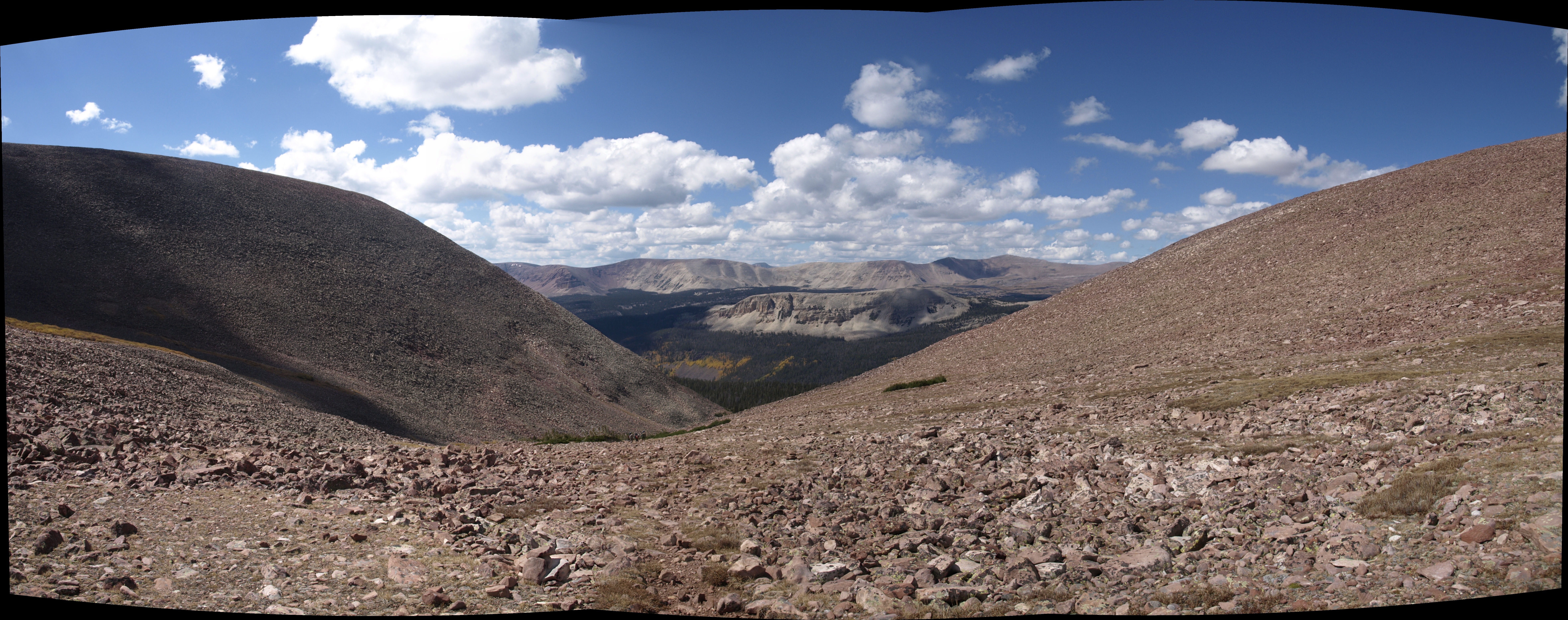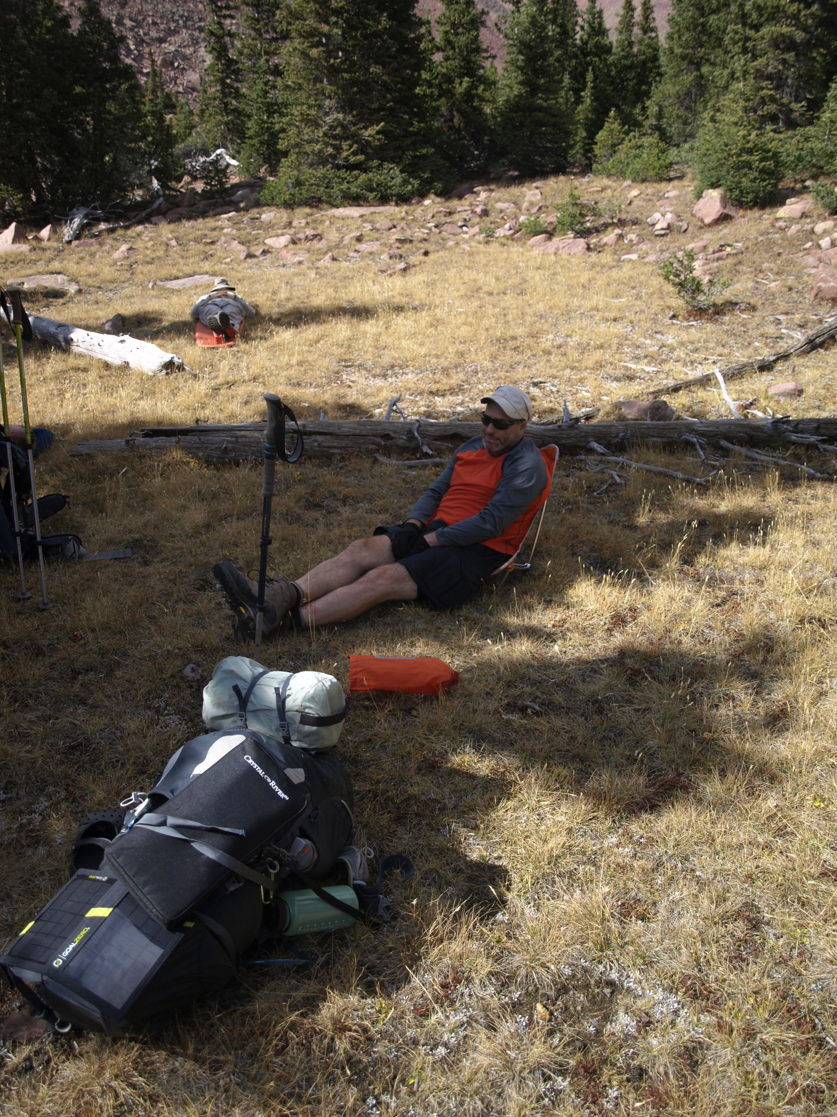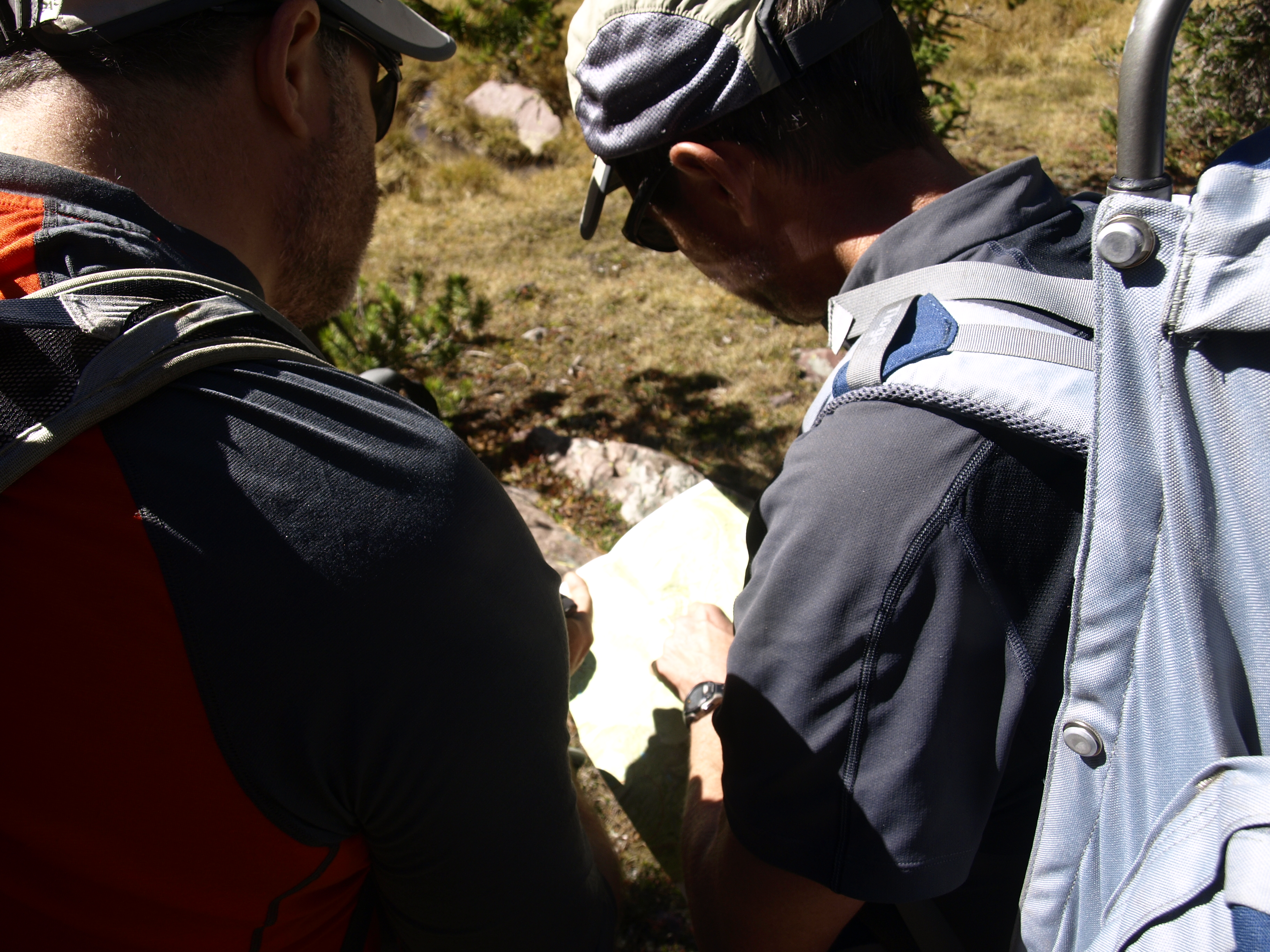 Needless to say it was frustrating, and there was another boulder scramble. I went left; Larry and Greg went right and Andy sat tight before committing to any direction, he wanted to be sure someone was going in the right direction. Larry and Greg found the trail and I was way off when I found Andy and there wasn’t enough of him visible to be standing. Though he did fall, he fell backwards into his pack and uphill thus crushing another hiking pole and getting a minor scrape. Walt and I converged on his position and raised him back to his feet. Pride a little bruised we continued on, found the trail, and humped our way down off the pass.