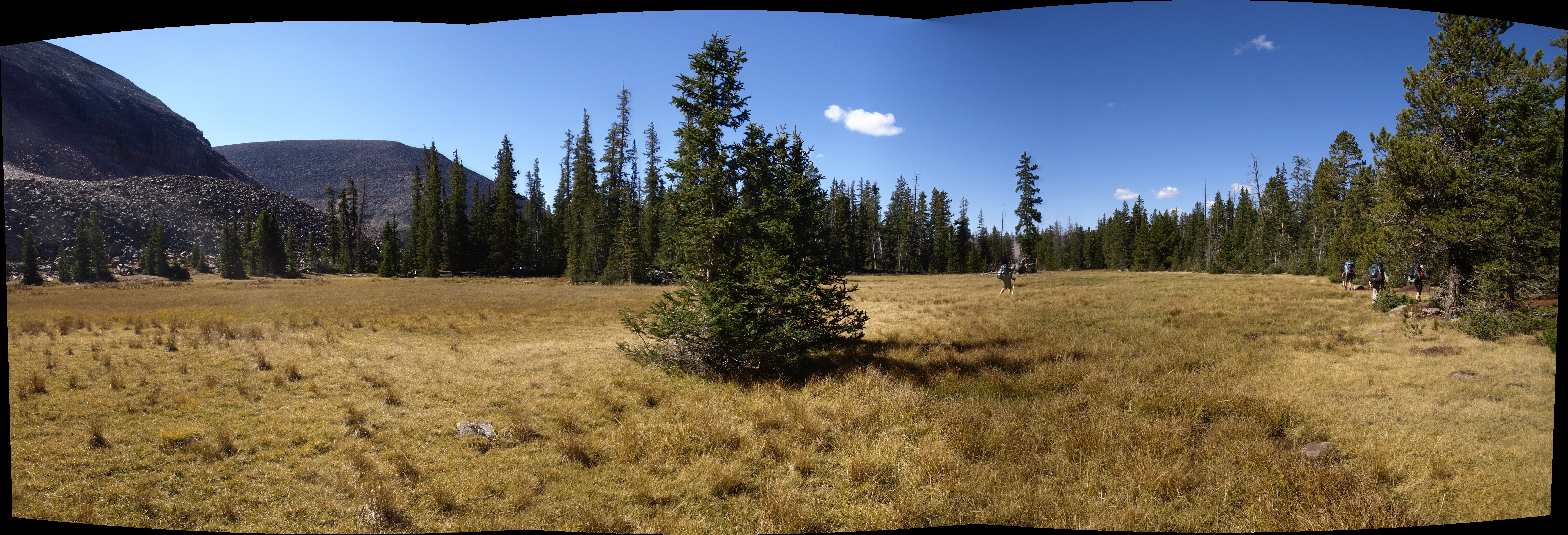 The trail cuts across this meadow. At least that is what we think the rock cairns in the middle of the meadow meant.