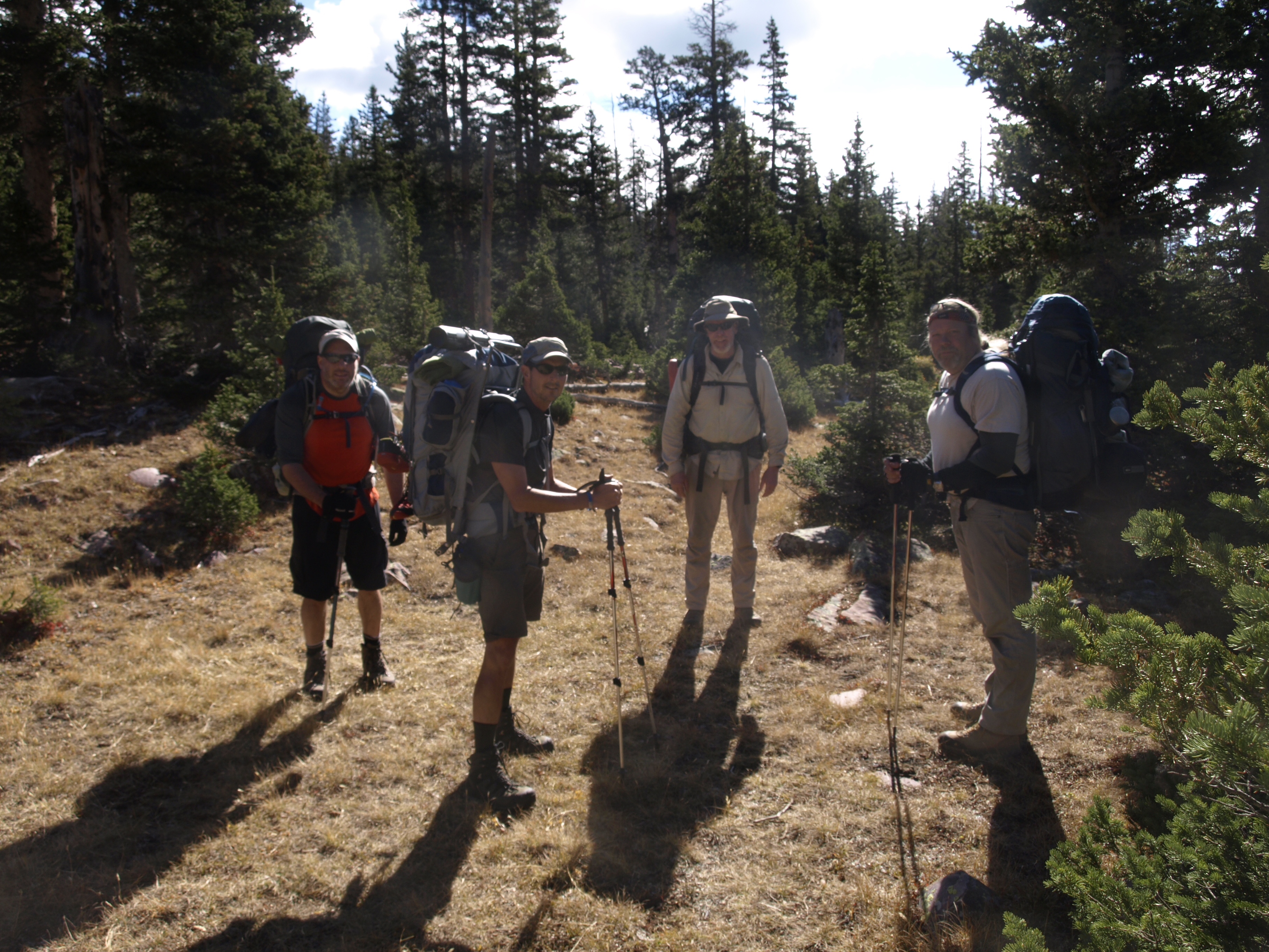 From here the trail dropped steadily all the way to Deer Lake. Deer was my original non-original location for our last camp, but it is on the restricted list for camping, so we decided to move still closer to the trailhead. We had two crossings of Swift Creek to make, and either one would offer some potential flat ground camping opportunities. The intersection with Deer Lake occurred right at its mouth, with an easy creek crossing. It piqued our imagination a little and we staged an Abbey Road style picture though with clouds developing, there wasn’t enough time to stage a full group shot with the tripod, so I am not in that picture. Utilize your imagination and picture me there.