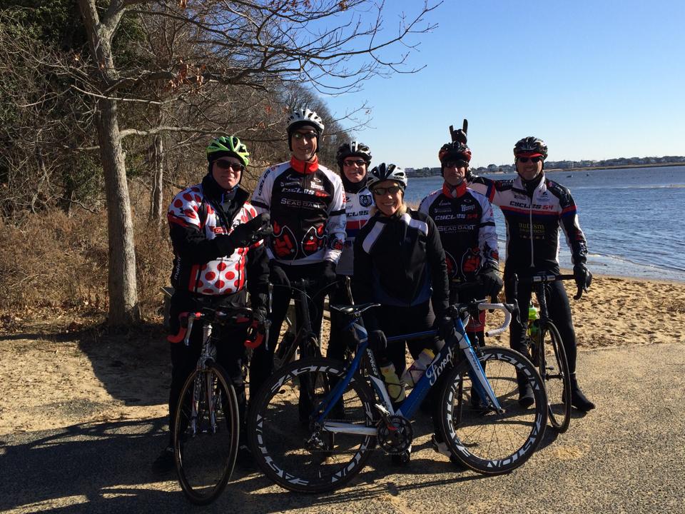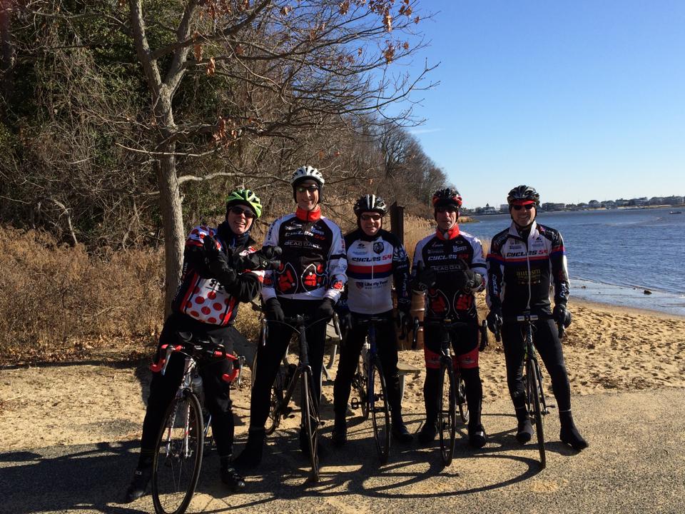 On the way over I could feel my legs telling me how much they really wished, I had made a stronger attempt to get to spin class over the last couple of weeks to prepare for this. Technically I hadn’t done much in the last two weeks except a training ride with some friends down in Manasquan this past Saturday, and that just wasn’t enough. It was cold, but there was no wind, and the sun was bright. I was cold after the 3 mile ride to Pronto, but I knew I would be alright, if I just didn’t get carried away on the hills. Bobby, Douggie, and Charley were inside when I got there, and Stacy was in the Acme lot getting her things together. Robert D showed up soon, as did Meredith CJ. We stayed there until 9:10 and then started donning our final layers for the ride. No one else was going to join us, it would be in the end just the seven of us.
