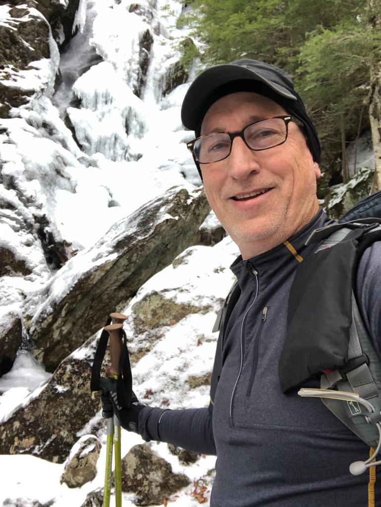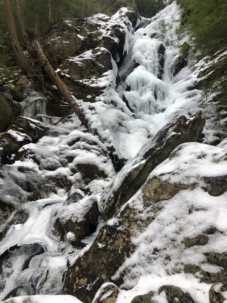 It’s two miles to the AT, and from what can be seen and the knowledge that the intersection is in a saddle between Everett and Race Mountains, the general terrain of the trail was one that gained elevation. Not a lot at first, but eventually there were walls of gain that had to be attained, and the trail steepened in those sections. The nice thing about gaining elevation, is you get some peeks into what the overall views are going to be once it opens up. First, though was to get around Race Brook just below the large falls. Crossing the brook low was easy, but the trail crossed again just below the cascades, and it was ice from one side to the other with running water beneath. It looked pretty strong, and it many places it was, but we are wary of the one place where it isn’t so strong. The spikes made the difference, and soon I was moving along again. I had caught an earlier glimpse of the day hiker, but my stops for pictures, soon had him well ahead of me.