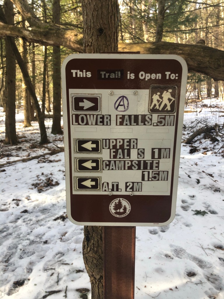 Driving along Joe pointed out the couple of places where the AT crossed the road we were on, and soon we pulled into the trail head parking at Race Brook. As I was dressed already, there wasn’t anything to do except get a couple of pictures, give Joe his money, say our goodbyes, and get started. As it so happened there was a day hiker prepping to start up the trail as well. Joe left to return home for the holidays, and I simply tried to get to the information sign, which was only 20 feet away, but I nearly fell three times. Clearly, just to get out of the parking area, I was going to have to put on the micro-spikes. I bought these a couple of years ago, after some other kind of snow traction contraptions pissed me off to no end with how they just wouldn’t stay fixed upon my boots, and that was simply to shovel snow. I bought these Kahtoolas, but had yet to try them. These went on fine, both of them had giant “L” on the rear tab, but they were neither right nor left, however the difference in traction was immediate and gratifying. These were the real deal, and hopefully they could take the rigors of four days on the trail. I had no idea how much I would need them, but as it turned out I wore them 90% of the time.