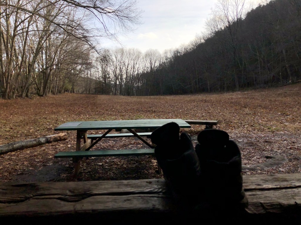 I was on the trail before the sun came up. In fact I was over Mt Algo, and climbing the next climb when the sun finally made an appearance. I did start the hike without my spikes, but it wasn’t all that long before I came upon ice again, and so back on the spikes went. On this day, I would walk into NY twice. The first time is a small section of trail that wanders into NY, and then back again before the trail descends back to the Housatonic for that last time. It’s a rapids section of the Housatonic, and the sound is mesmerizing. The trail has many outcrops with nice views, and eventually Ten Mile River is reached where a bridge exists, because Ten Mile River is never crossable. I would argue that Guinea Brook is probably rarely crossable, but that water crossing is bridgeless. The trail then turns west following Ten Mile River upstream where the side trail to the Shelter is reached. Ten Mile Shelter is a really nice shelter sitting at the end of an old field. I stopped in to let my feet get some air, and to have some lunch. From there I only had Ten Mile Hill left and then my journey would be over. I was ahead of schedule, so I took my time with lunch and enjoyed the view.
