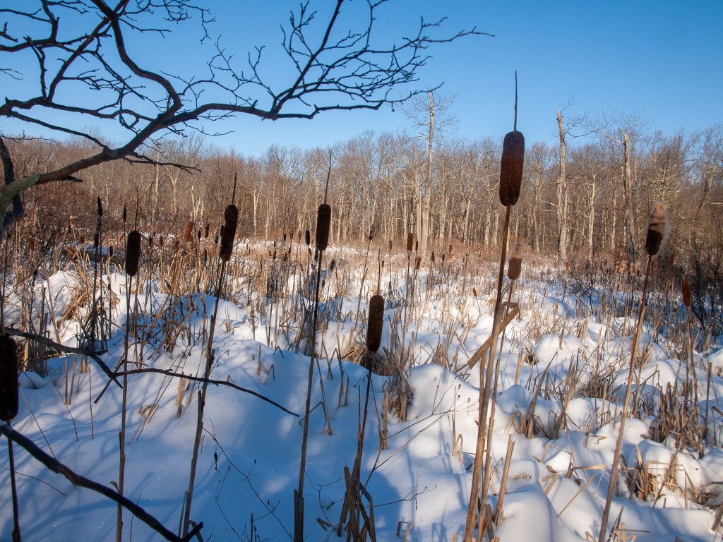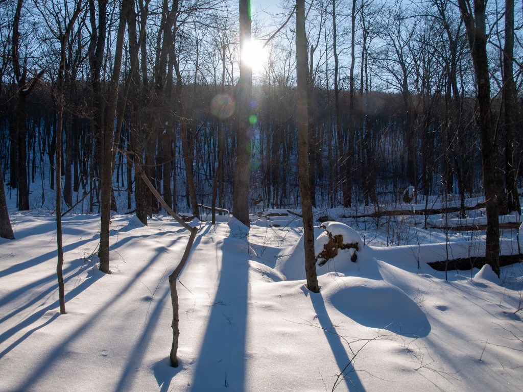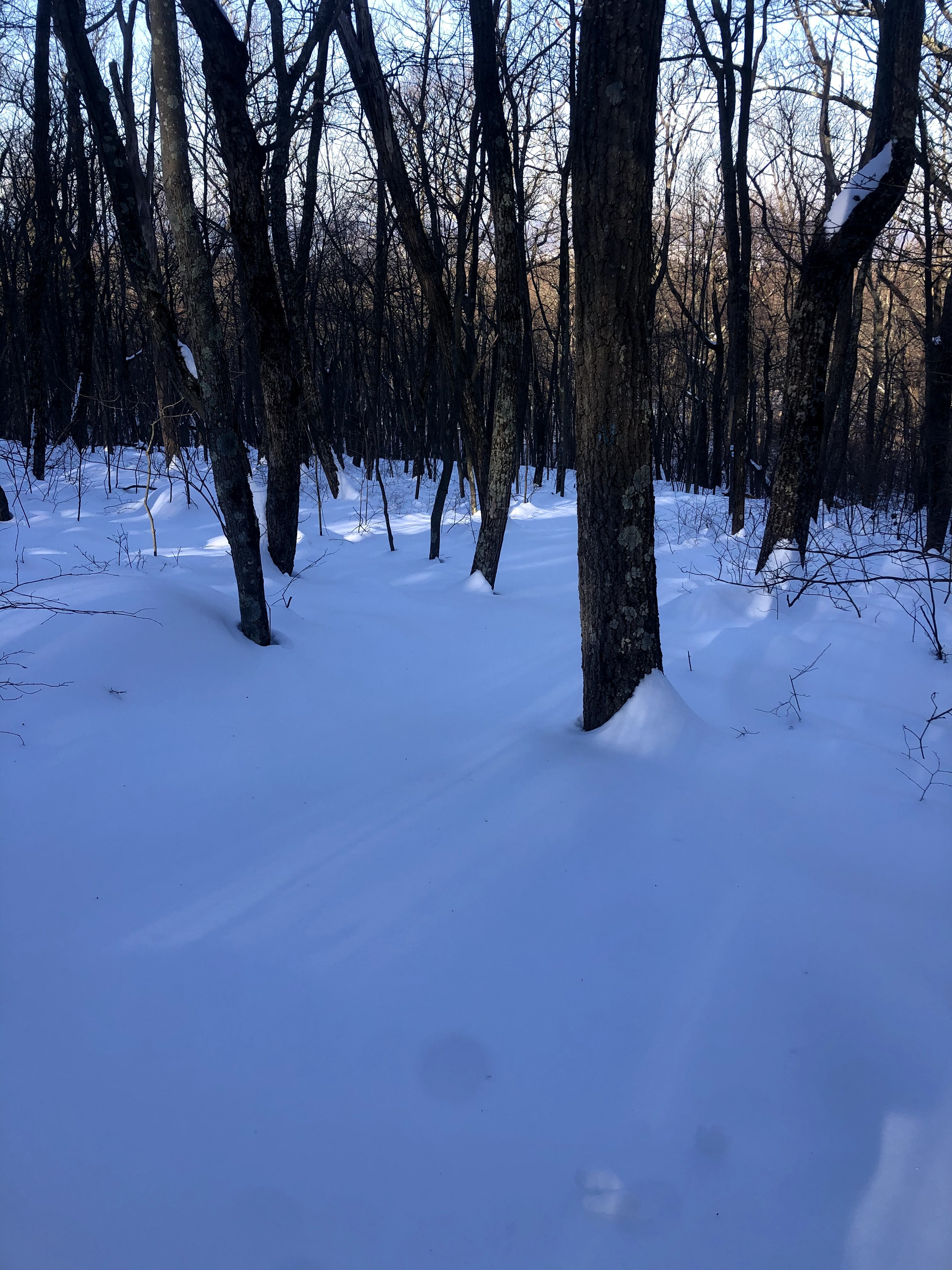 I should note that the shadow patterns in the woods were quite remarkable that morning once the sun had cleared the ridge and bathed the woods floor with light. Before that occurred the woods had a blue feel to it, and when I was processing some of my images, the blue stood out, so I adjusted to subtract some blue and restore the true color. The trail meandered, and the further along I got, the less well defined the trench walls became in places. Maybe that was because the trail was a little wider, and maybe people didn’t want to walk in a trench, or maybe just enough people didn’t yet come this way that trench just hadn’t formed yet. In any case I was making pretty good time, and was enjoying the view. One thing the snow shows you, is where the animals roam. I crossed umpteen game trail crossings, mostly deer, but not always.