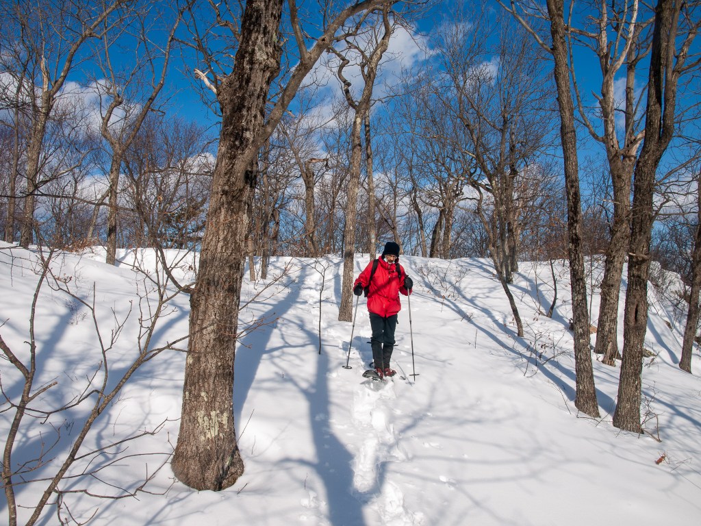 As the trail turned a little Northeast, it started to descend and was approaching the intersection with the northernmost extension of the ski trail, and that is where I found Mike taking a little break. From there we walked together and chatted about the beauty of the woods and the snow. How it was a real treat to have so much snow that snowshoeing was so accessible. Mike owns two pairs of snowshoes, and he brought the modern metal framed Tubbs, which were a much older design than the Tubbs I was renting. I guess like everything, there are always improvements that can be made. For example, Mike’s bindings were all webbing straps with buckles, and my bindings were the BOA dial managed bindings with a rubber stretch rear strap. Very convenient to put on and to take off.