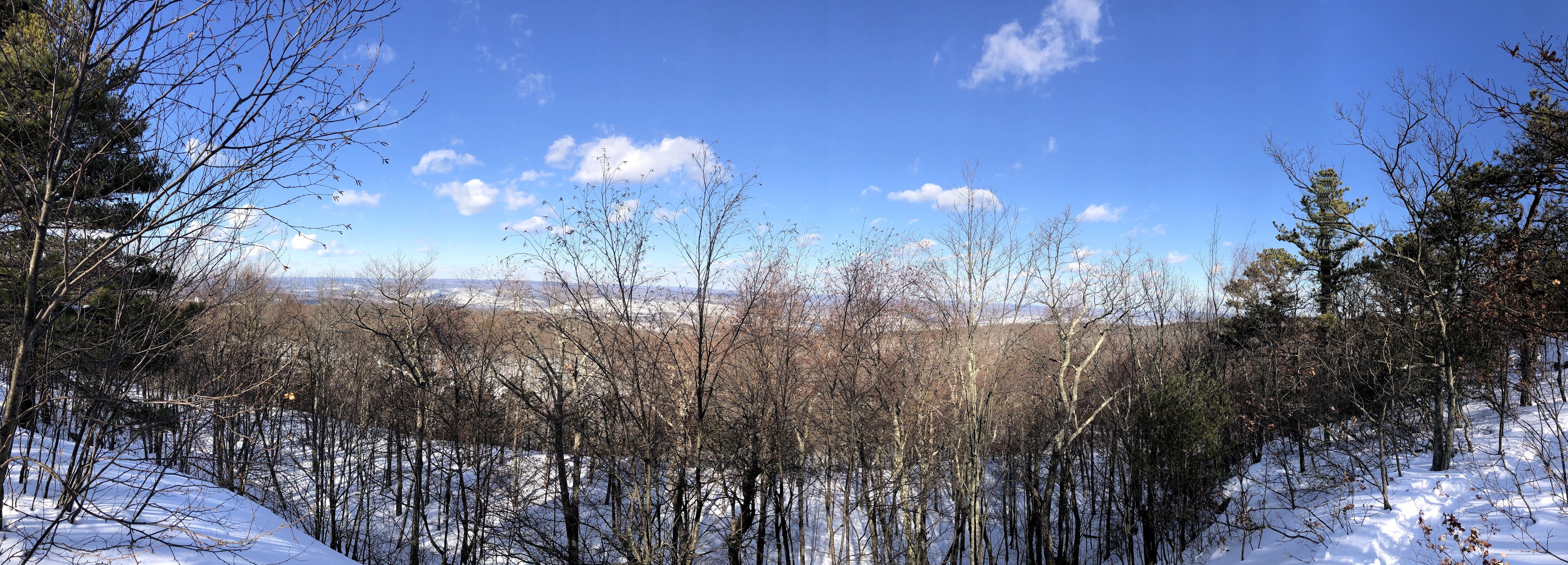 We set off up the grade, me leading, and Mike following. It wasn’t all that steep, but it was prolonged. At times there openings that revealed the open valley to the NE. In addition, as we gained more purchase on the higher ridge, we found the wind had picked up all morning, and there were pretty significant gusts blowing across the trail. There were some fairly significant drifts to hike through where the snow depth approached 3 feet. I made this judgement based on how far my hiking pole sunk into the drift with the somewhat limited baskets I had. I should note also, that the trail on this ridge is almost on the spine of the ridge. To the West, it was level for some 10-20 yards, before descending, however to the East, the actual top of the ridge rose another 10-15 feet where if the effort is made, you are rewarded with a 210 degree unobstructed view that includes Vernon Valley, and the Walkill Preserve. It’s a fantastic view, however climbing that 10-15 feet in snowshoes in deep drift is not an easy task, and it took a lot of effort for me to achieve that. The issue was mainly, that for every step forward, I slid half a step back, and sometimes, the entire step, so I had to angle up against the grain of the climb, negotiating through the small trees. I did eventually make it, and my reward was astounding. Of course, had I simply finished out the hike, access to the same view was achieved without effort once the monument parking lot was reached, so Mike enjoyed the same view without all the work I had to put see it only ten minutes prior. Once we emerged into the parking lot, then all protection from the wind vanished, and it was a brisk, very cold wind, and so we didn’t linger long enjoying the view, and moved quickly to get across the expanse of the lot, and back into the cover of the trees. When I say “Monument”, I mean the monument at the highest point in New Jersey, and that is the monument in “Monument Trail”. From there the trail descends back into the cover of the trees, and loops over to an intersection with the Appalachian Trail (AT), and then the loop finishes along a stretch of Lake Marcia. There wasn’t any indication that anyone had ventured along the AT at all, and we left that snow undisturbed and finished out the loop.