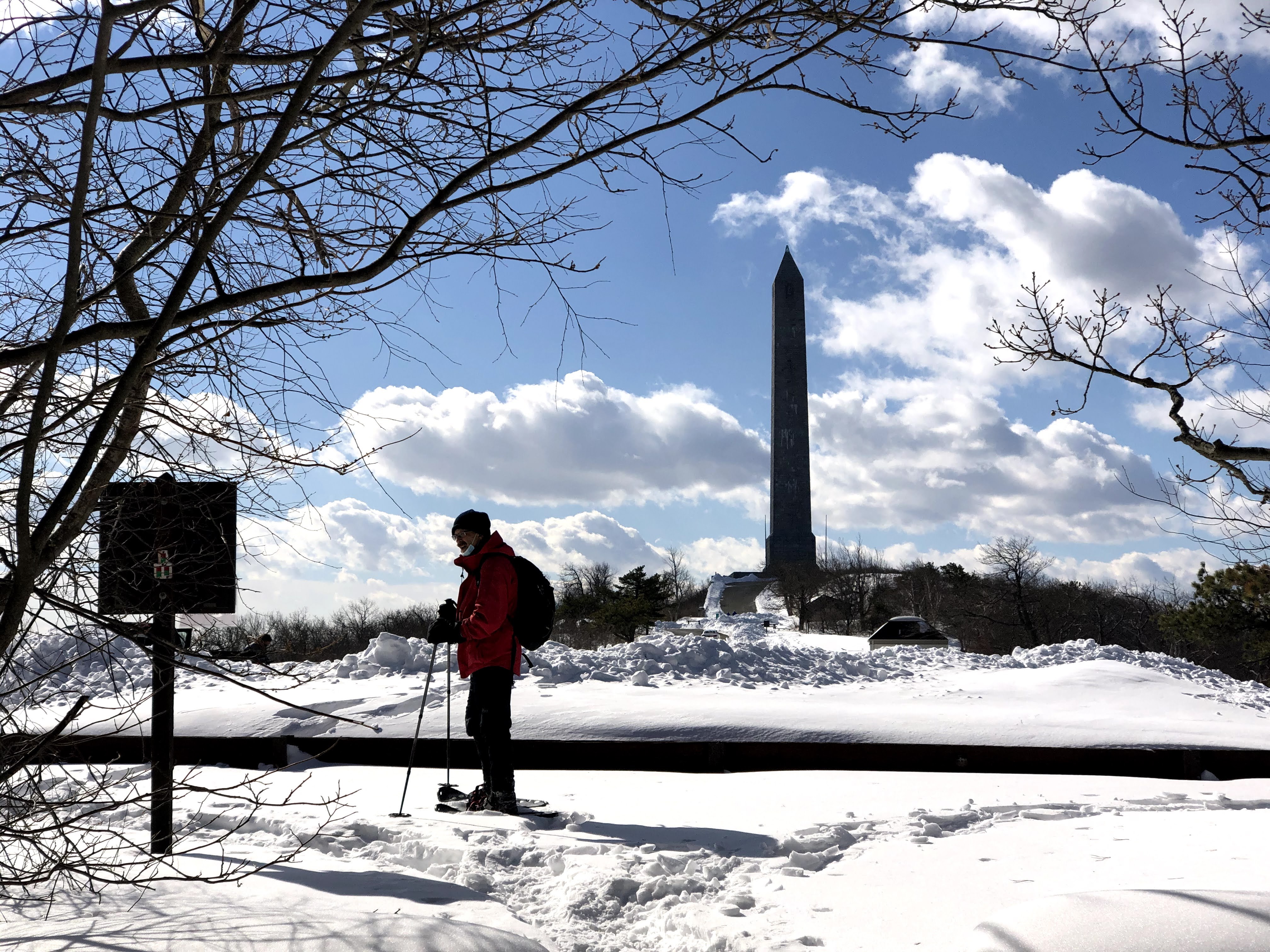 Everything played out well the next morning. I awoke, and jumped out of bed. I donned the base layers I would need, and packed the rest in a bag to adorn before I hit the trail. I boiled water, poured that into my thermos, packed the via coffee packets and my snacks, grabbed everything else I needed, and departed. With no one on the road, and it being Saturday, I zoomed up there rather quickly and arrived at 7:20, well before 8am. Now here is where I made my mistake. I thought, and the location of the icon within google maps for the XC Ski center wasn’t clear, that the center was right there on Route 23. There is a decent sized building, and I just thought that was it, so I parked in the parking lot and ate my oatmeal. Sitting there I saw other vehicles arrive, but they pulled into the entrance on the other side of the highway, and from what I could see there was a line that had so far extended out to the highway, and there were no cars on my side in my lot. I reasoned then, that I was in error, and moved to other side of the street, where I didn’t have to wait long before the gate was promptly opened at 8am, and we all flooded in single file. As it turns out the ski center is about a mile within the park, and I followed all the cars to the main center lot, and aped my fellow sports enthusiasts who launched out of their vehicles and headed up the driveway towards a building that looked a lot like what you might think a ski center would actually look like. Using my stride, I moved quicker, and without seeming like someone who was trying to “Cut In”, I safely and non dickishly got the center ahead of the main swarm that I had been behind, and was 12th in line to be processed. The line moved pretty quickly, perhaps it would have been quicker had the electronic payment option been in operation, but cash worked. It was $16 for a full day of the shoes, and $20 for an access ticket, and since Cliff Bar was a sponsor, a free cliff bar or two. I then moved to the equipment window and was the first to request snowshoes, so I was guaranteed access to my size. What they gave me were some top end Tubbs. Tubbs is also a sponsor, and whether that is the reason they have really nice shoes or not, I do not know, but I looked those up at the end of the day, and of course, like everything else in these pandemic times, they were sold out and out-of-stock across the country. But on this day, I had a pair of 28″ and I took them back to my car to get the rest of my gear together. It was 18F, and not windy in amongst the trees, so I went with just my sweater, and stuffed my bag with my mittens, snacks, camera case, and other incidentals, and then headed back to the ski center where the loop starts. First with shoes, first on the trail, I set out on the Monument loop, a 4.4 mile loop that heads North along the Western ridge, and climbs to the higher Eastern ridge for the return.