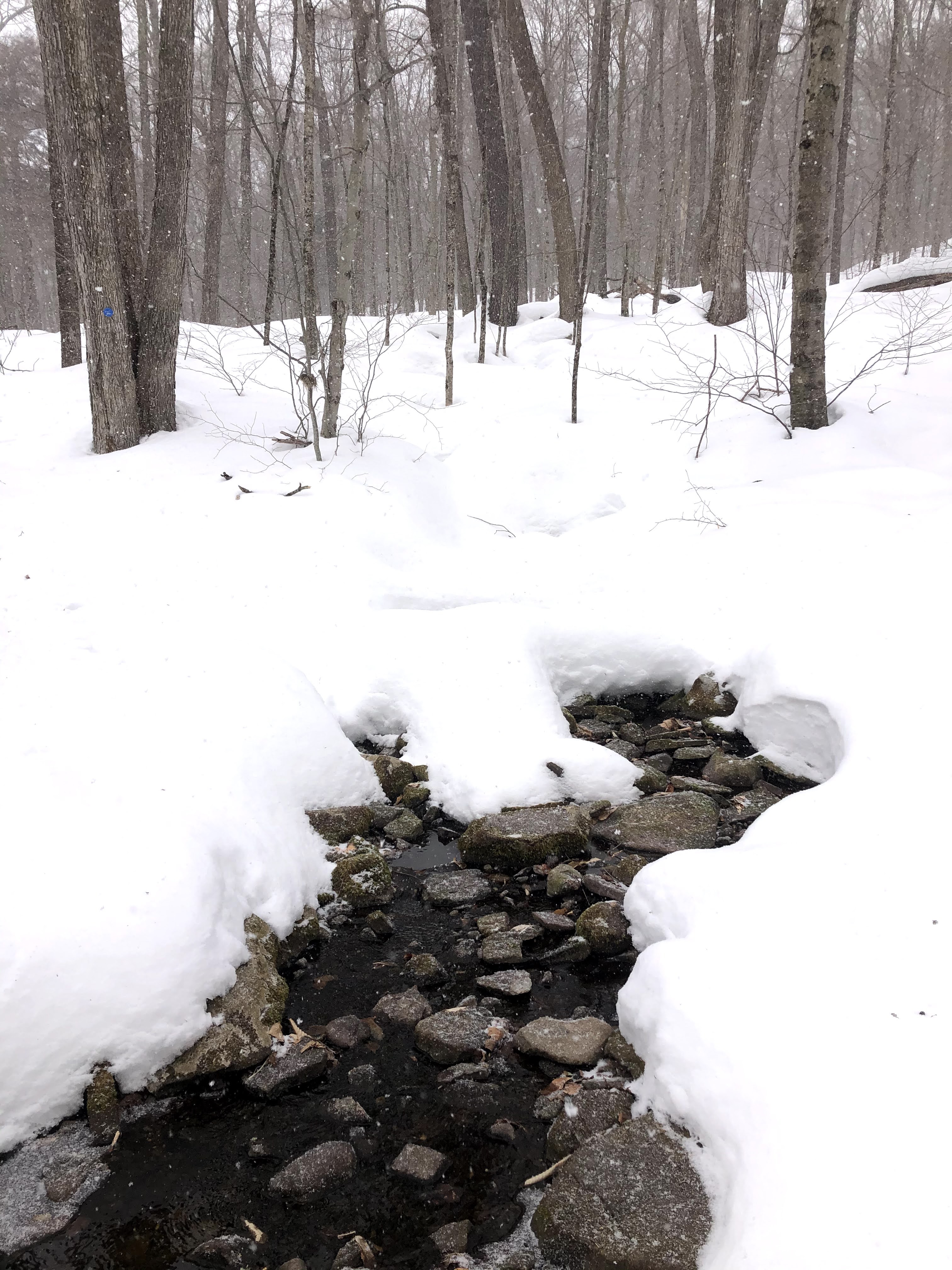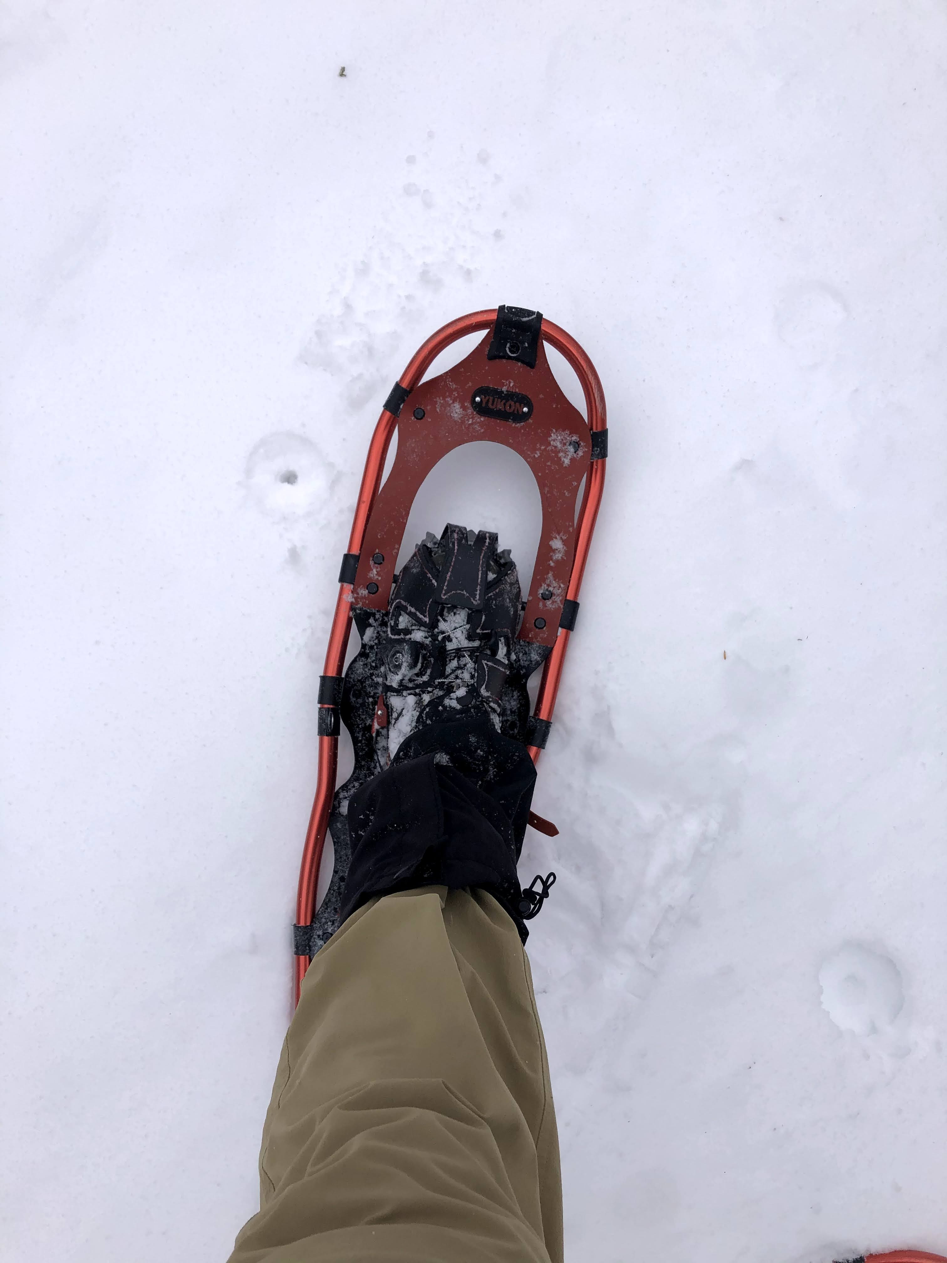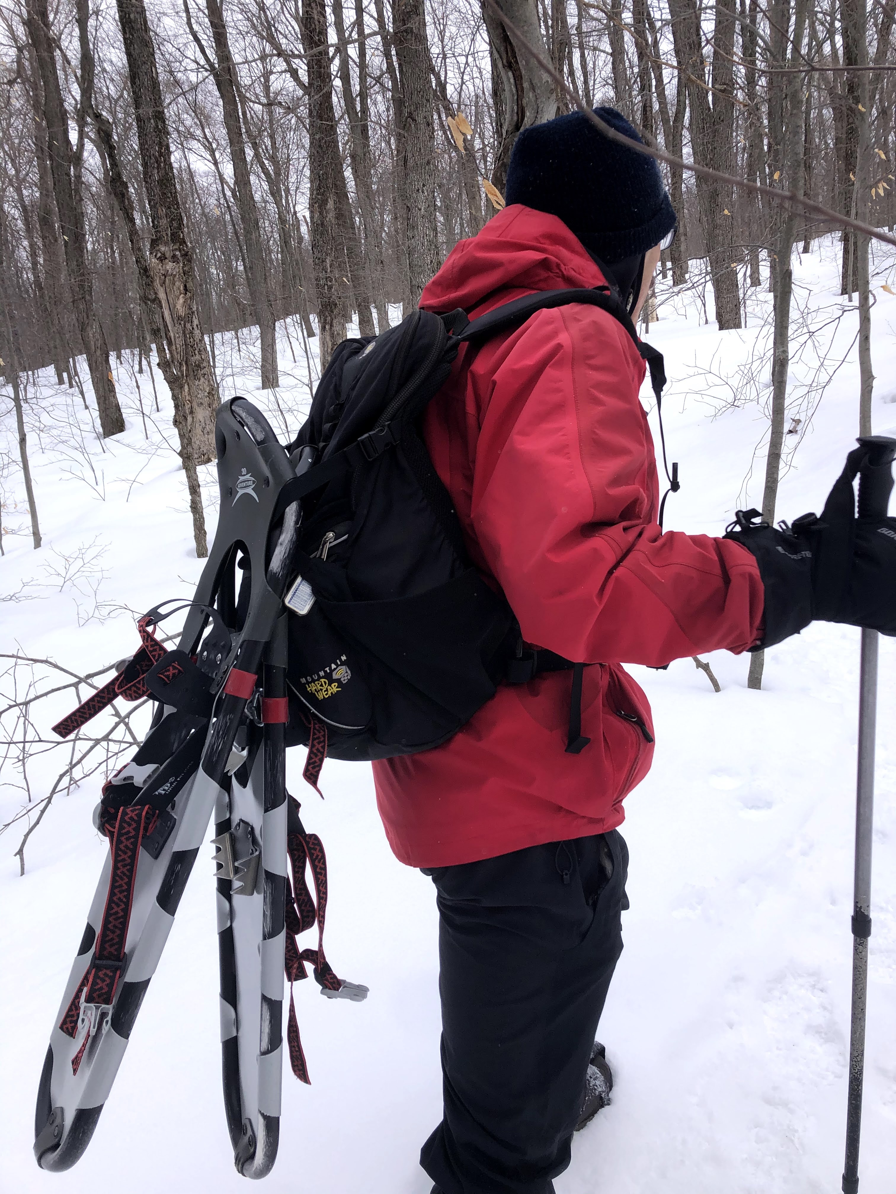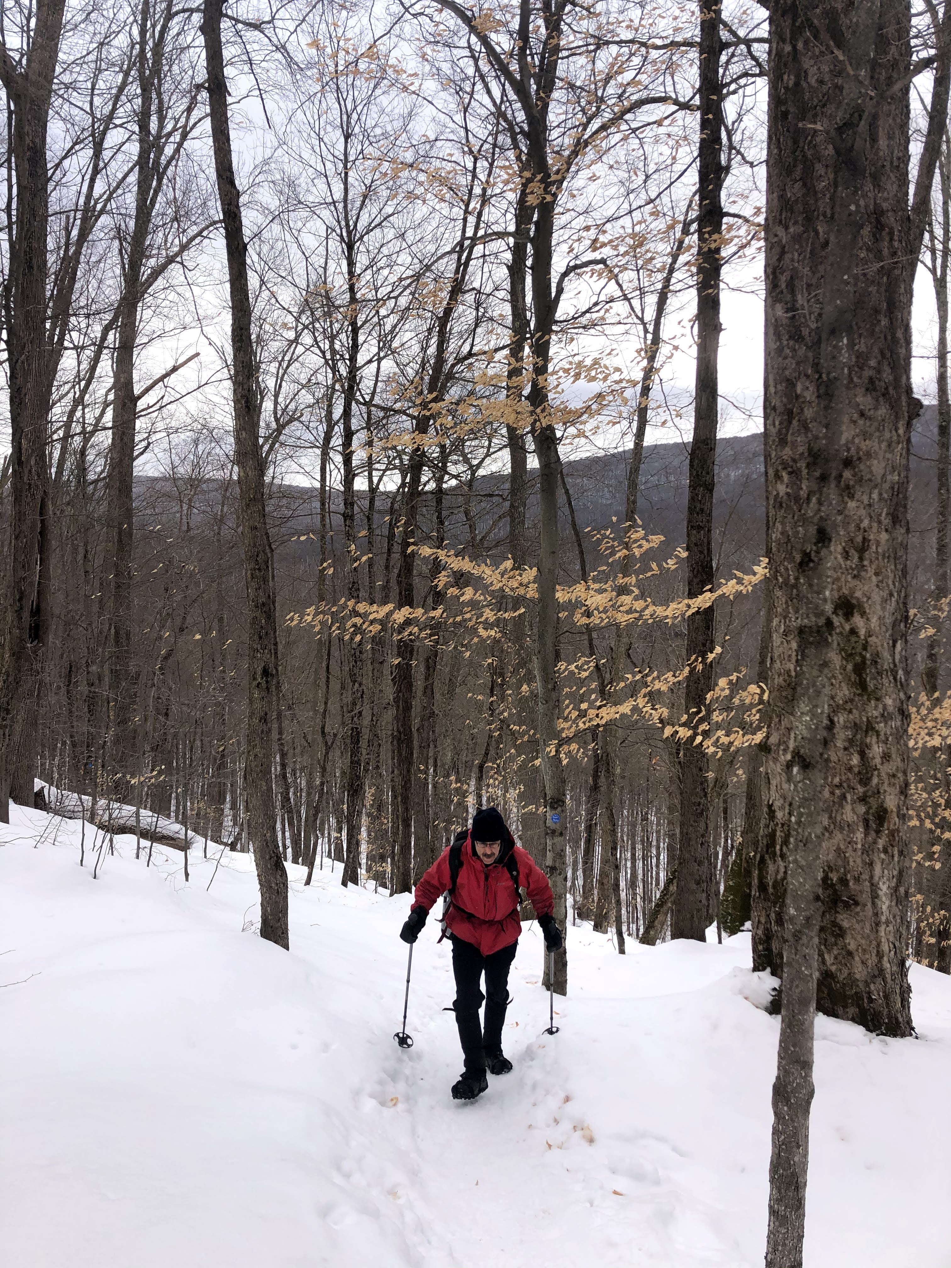 The hike out told me something. It told me that we chose the right direction for the day. For us, there was no climb that could be called steep. It was a gentle climbing all the way to the top of both summits. I cannot say the same for the established trail we were on. When we started to descend, we descended quite steeply at times, and for a very long time. I would not have wanted to climb that in snowshoes, and likely might not have enjoyed it all that much in spikes. In snowshoes, it was precarious at times going down, and it was going down that I started to realize that my snowshoes were failing. Yukon Charlie was not a good brand, or maybe more to the point this model wasn’t up to the challenge. The attachments between the frame and the webbing were failing. 3 broken on the left foot, and four on the right. I was annoyed more than anything else, but I knew right there, my return trip would include a stop at the REI in Paramus to return them.