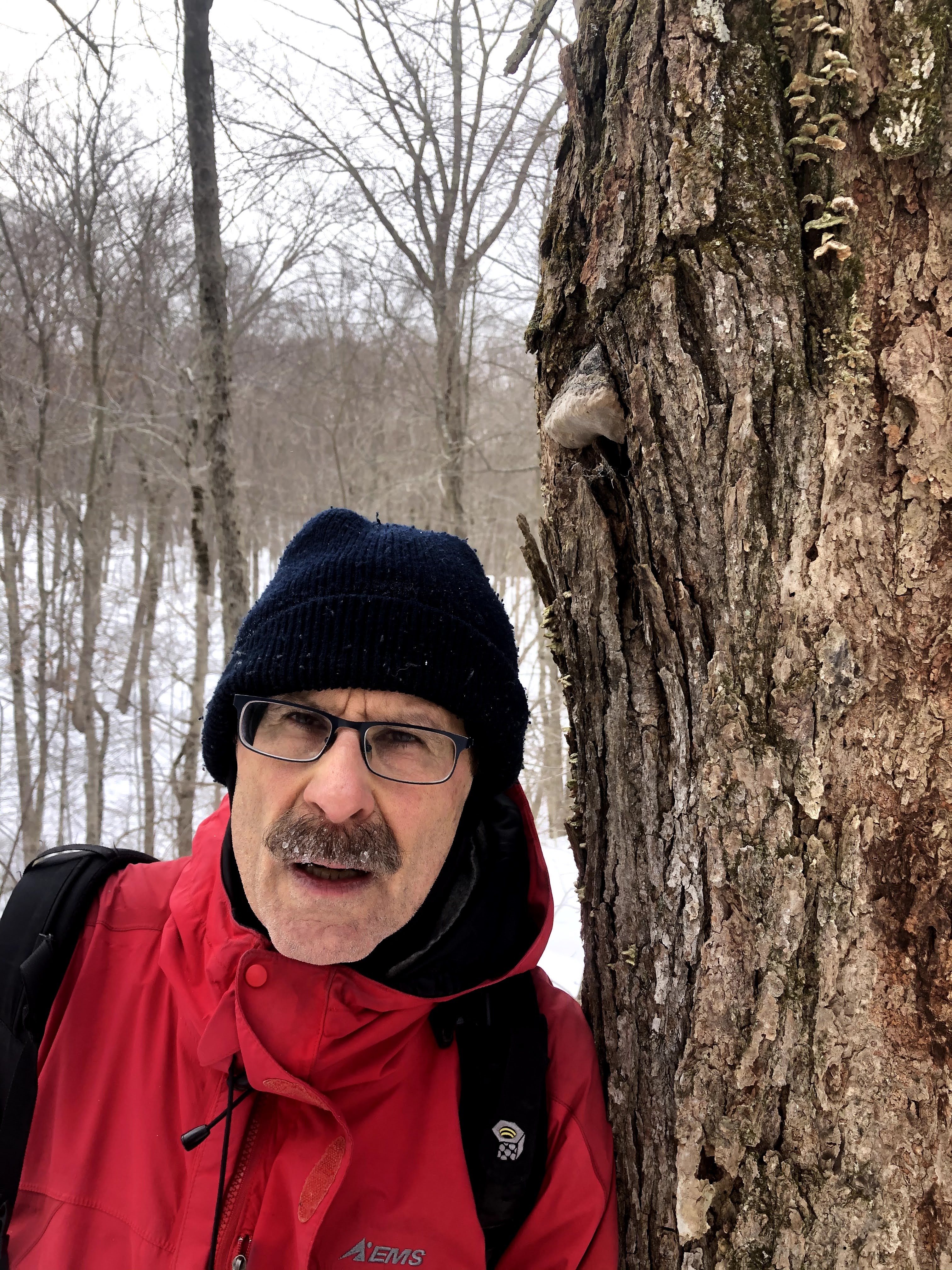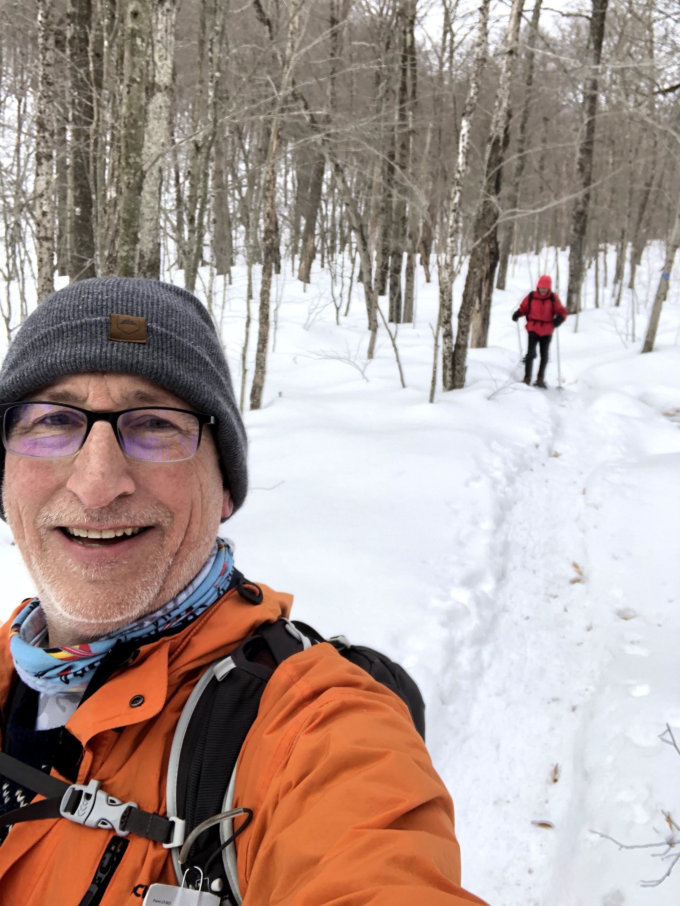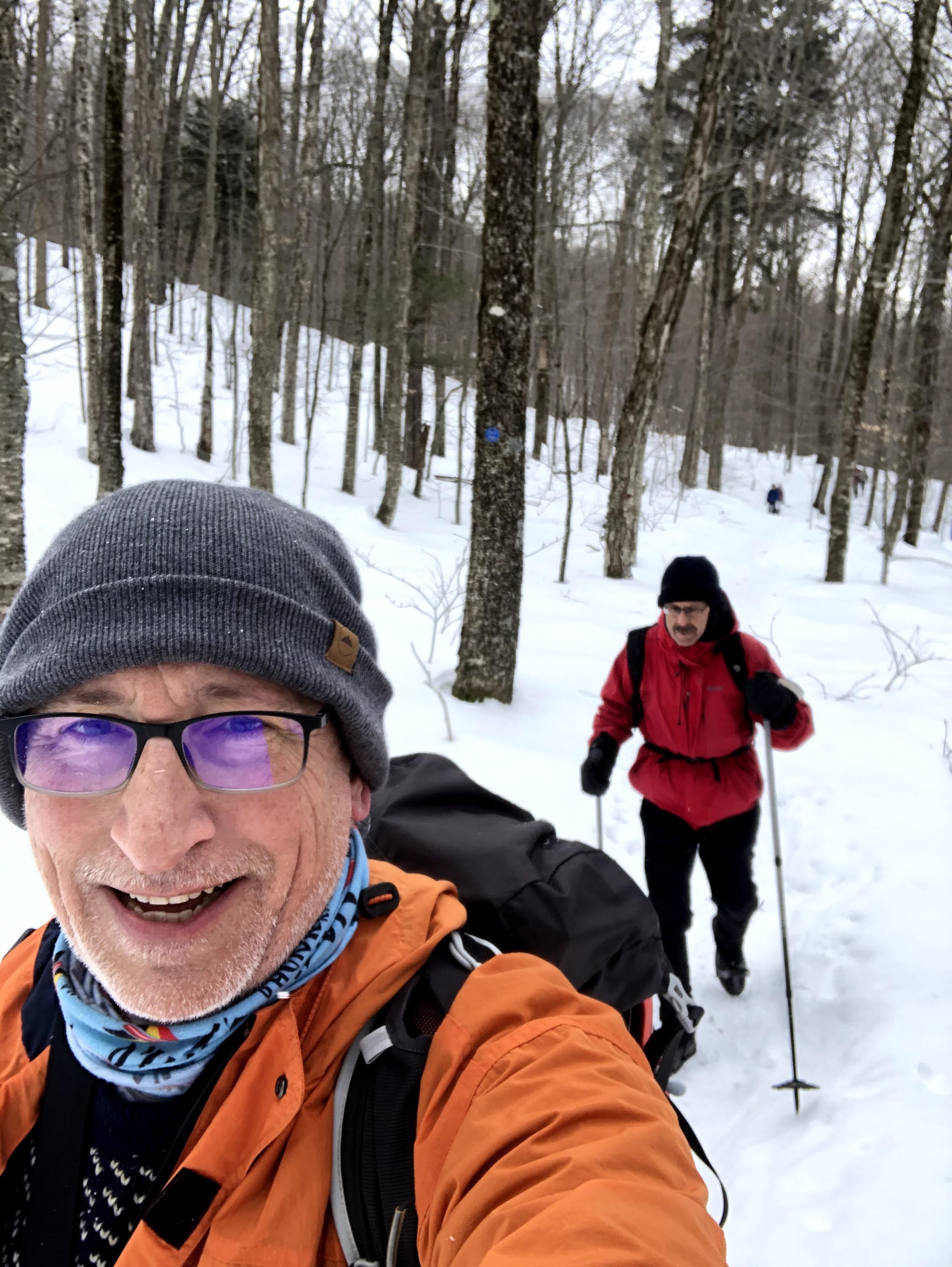 I don’t want to languish here in the story, but I will summarize that I had to remove my pack, and camera, handing those off to Mike. Then with both hands I could just get to the back of the right shoe, and loosen the binding, and pull that shoe out. Then I spent 20 minutes scooping snow out of the hole, digging my way down to my other shoe. Fortunately the snow was light, and it was still cold and the snow was dry. I wasn’t getting wet. That was maybe a key point. Anyway, eventually I could see my shoe, and I was able to grab the back of it with one hand, and while hold a tree with the other, I was able to pull my shoe clear. Then with both hands on the tree, I was able to pull myself out of the hole, and roll and gain footing on the one shoe. I donned the other shoe, brushed off, put my pack back on, and we retraced our steps out of there, and followed the ladies trail to the top of Big Indian, and signed the register. Disaster averted. I appreciate NOT hiking alone.