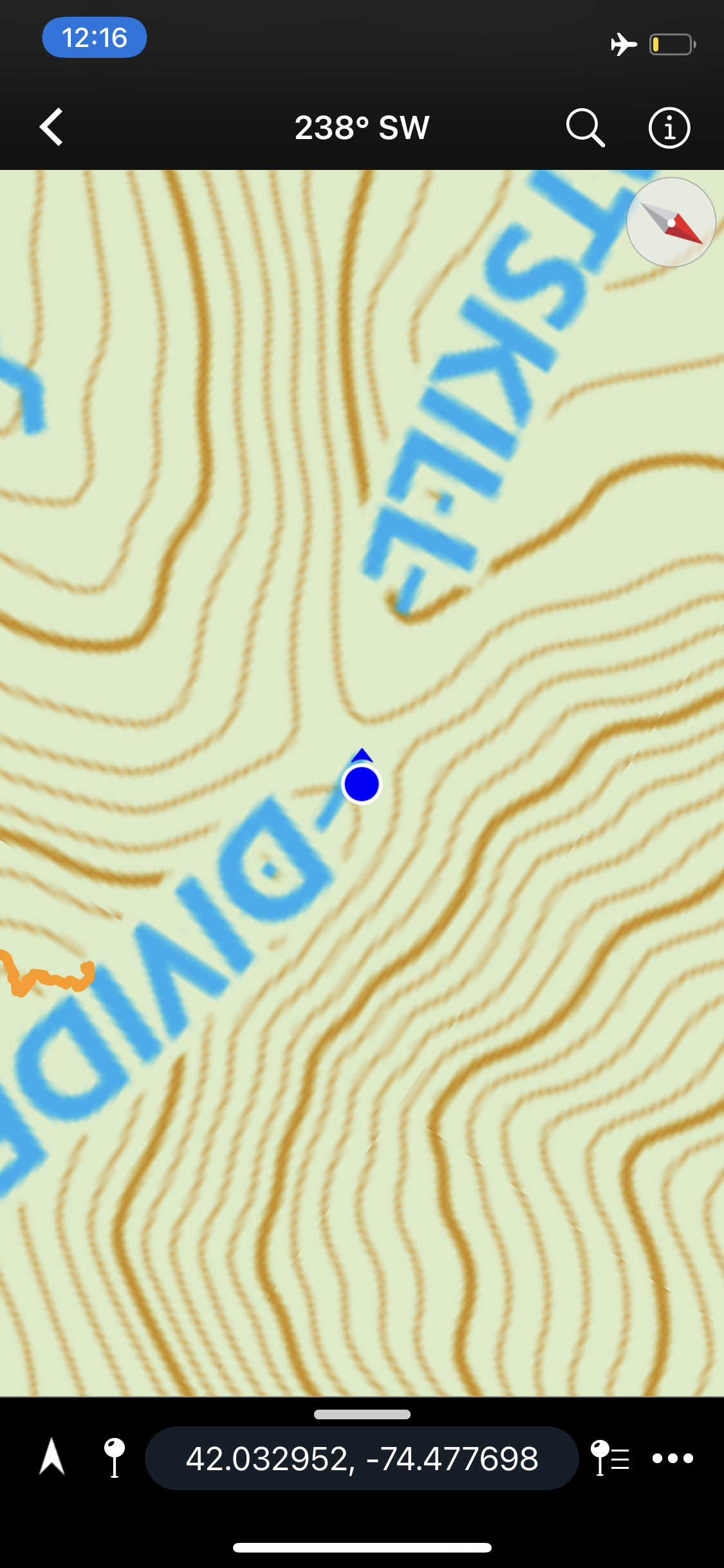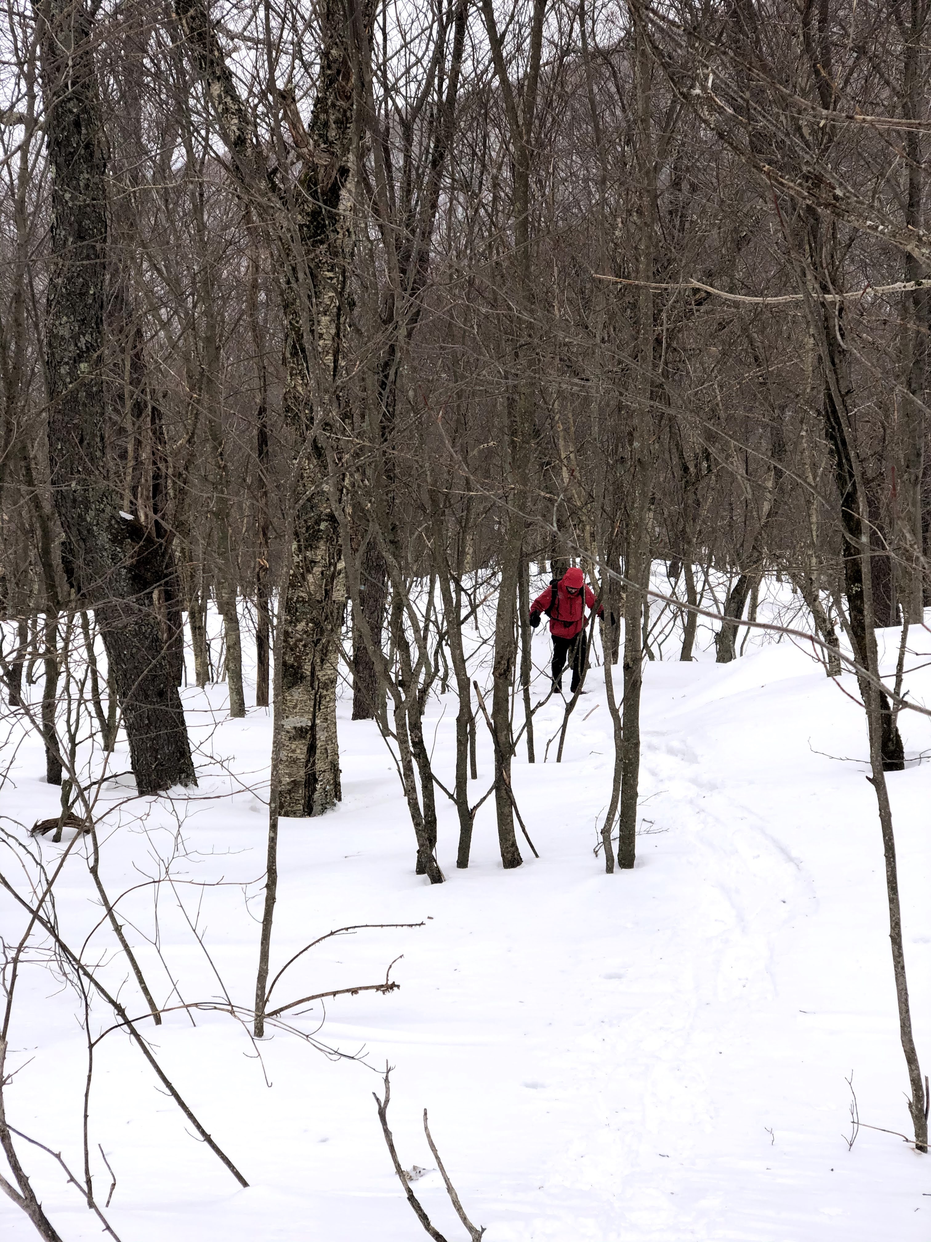 Now, about that trench. We hiked spikes all the way to the top, and the trench was well defined all that way, however, that trench immediately ceased at the register. There were indicators that there had been a trench, and there were indicators there had been prints, but they were filled in with drift. Enough to fill, but not enough to completely hide. To continue, we needed our snowshoes, and so the swap was made. Mike questioned what the deal was, and I told him, that we would have to descend a slight bit, but that we would hit a saddle that is written in the map as the Catskill Divide. What is the Catskill Divide you ask? Well, it is a watershed divide between Hudson River and Delaware River waters. Pretty cool. In the saddle, snow to our right drains to the Hudson, and snow to our left drains to the Delaware. I like shit like that. So, back to the bushwhack. In general the existing trench could be seen, and we followed it easily. There were times when it disappeared, but I could see the general direction we needed to go, and soon we picked up the trench again. This played out all the way to the saddle, and we were just starting to climb out of the saddle and up to Big Indian when the trench disappeared completely. I looked around and just could not discern where it was, however we were on a gentle spine that ascends all the way to Big Indian, and all we needed to do was stay clearly on the spine. I have an app for that, and was high enough to download lo-res versions of the topo maps needed to guide us. I also had the avenza app maps, but I like my other app better for this type of navigation. The compass feature and the map are so much easier to read and follow. I set the route, and broke trail through a lot of snow, some pretty deep, and some not so deep. Really it wasn’t that hard, because the spine wasn’t that large. One hundred yards max from left to right, and then it fell off quite steeply. We just needed to keep going up, and never go down. Sounds pretty easy right? It was. As is my usual MO, I keep going, and going, and at some point I take a break to make sure I see Mike’s red coat behind me. Well I guess I kept going for a while, and it was a while I was waiting for Mike, when something extraordinary happened. Some ladies bushwhacked down from Big Indian, and though they weren’t lost, they were relieved to see me, and find that I/we had come from Fir. Now they had a path to follow, and we had a path to follow, however before we went our separate ways they did warn us that at one point their path was a circuitous one, and not so obvious. I told them, “thanks” and “their path would be clear to Fir”, and we said our good byes.
