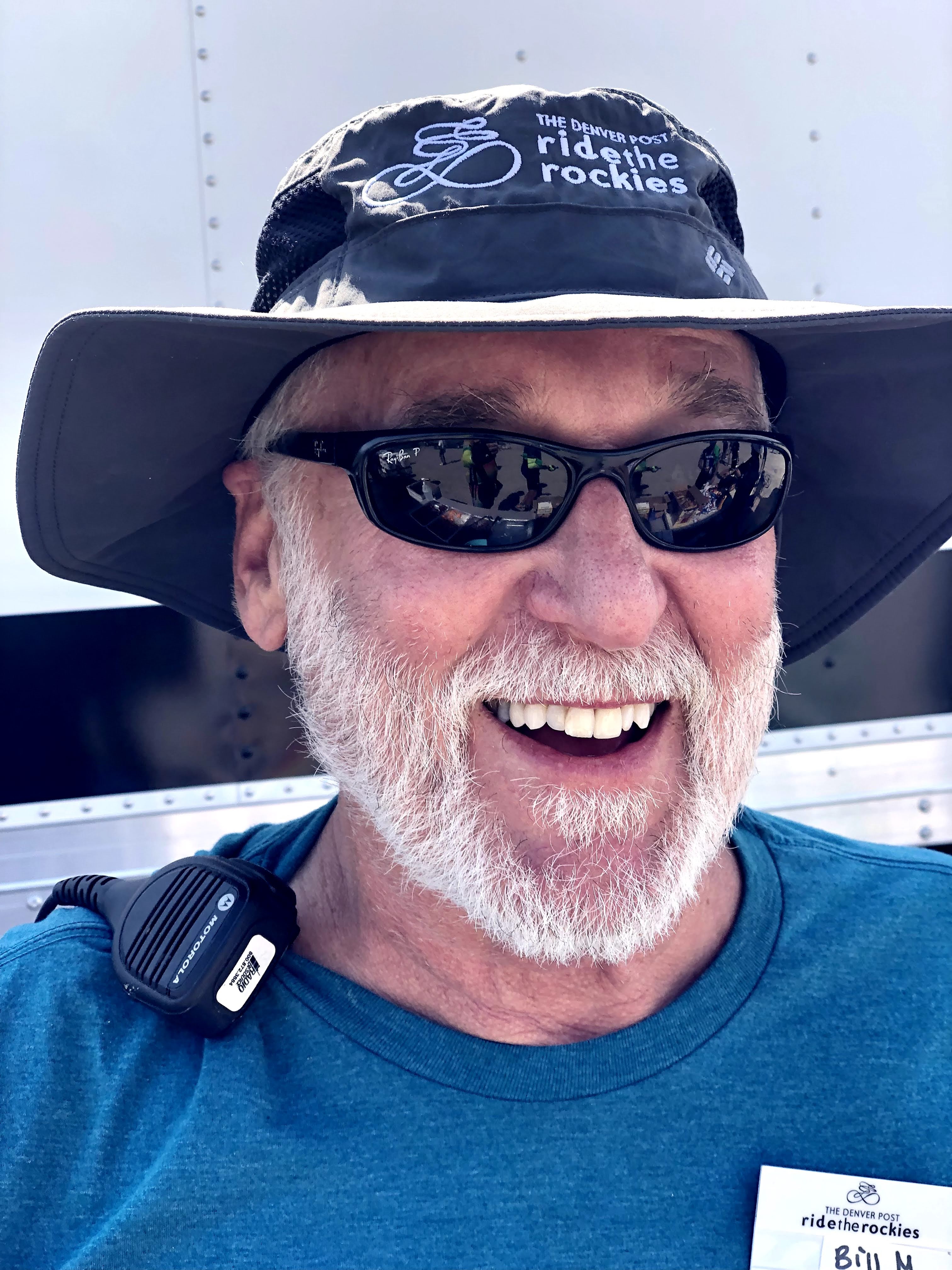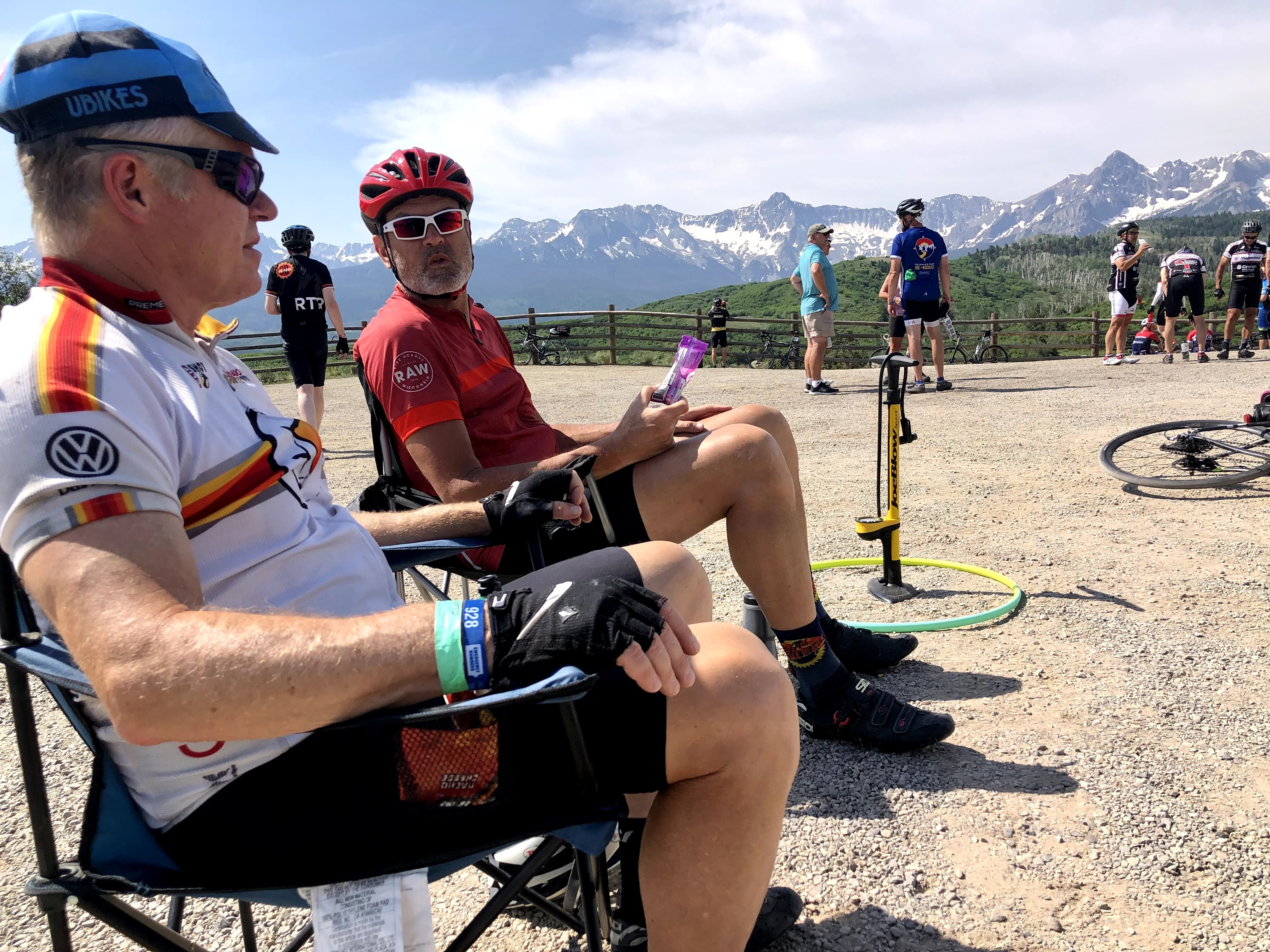 It wasn’t too long after that when a cyclist caught up to me, and decided to chat me up and ride together. I don’t recall his name, but we spent the rest of the climb together taking turns. I don’t even remember where he was from. It could have been the “Front Range”, which is what a lot of Coloradans call living anywhere along the front foothills to the Rockies. We took some pictures of each other, and went over the top of the pass, where the rest area was not located. No room for it there, but it was located down the other side just another mile away, and we stopped there and transferred our images to each other. I ran into Paul Doherty and we chatted a bit. He was in his full Samaritan House kit, and was with a bunch of other Samaritans.
