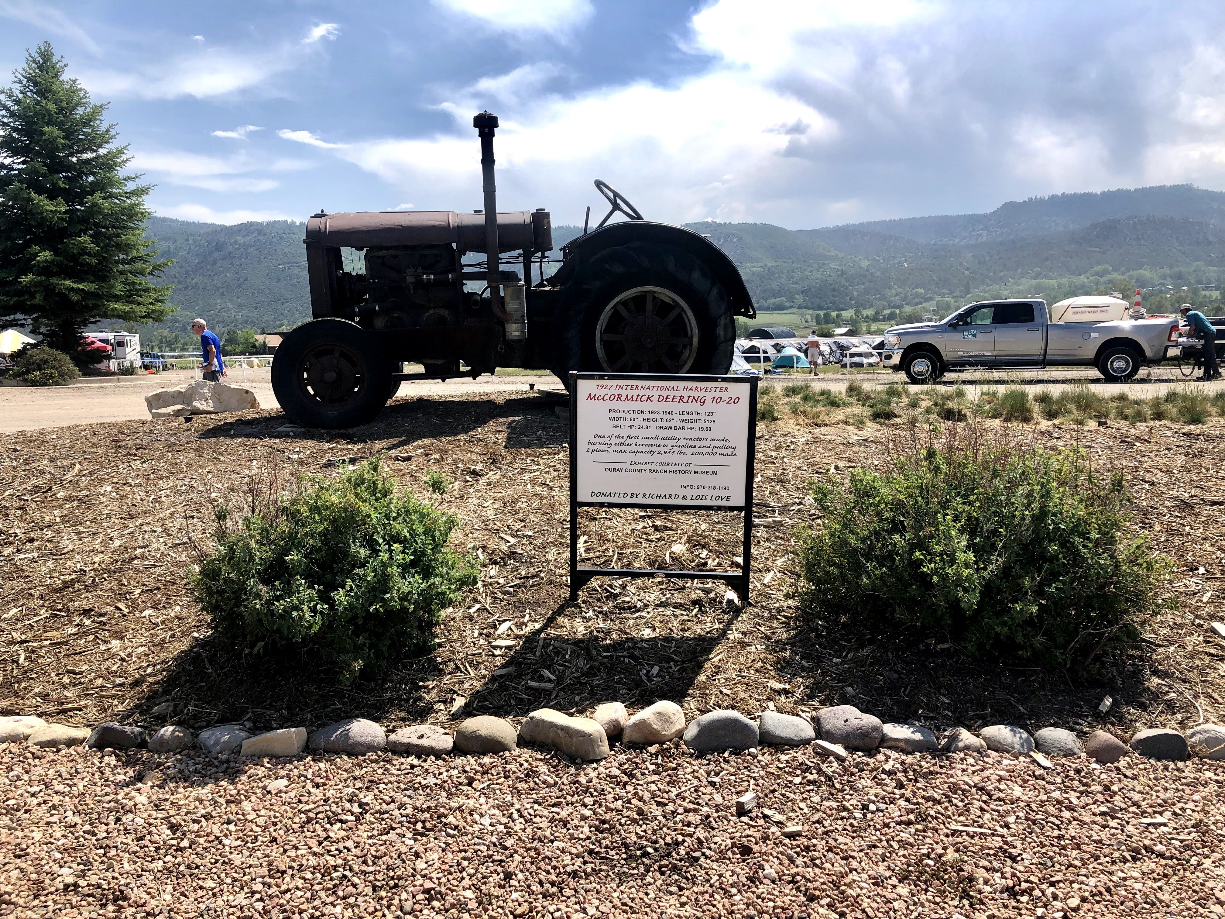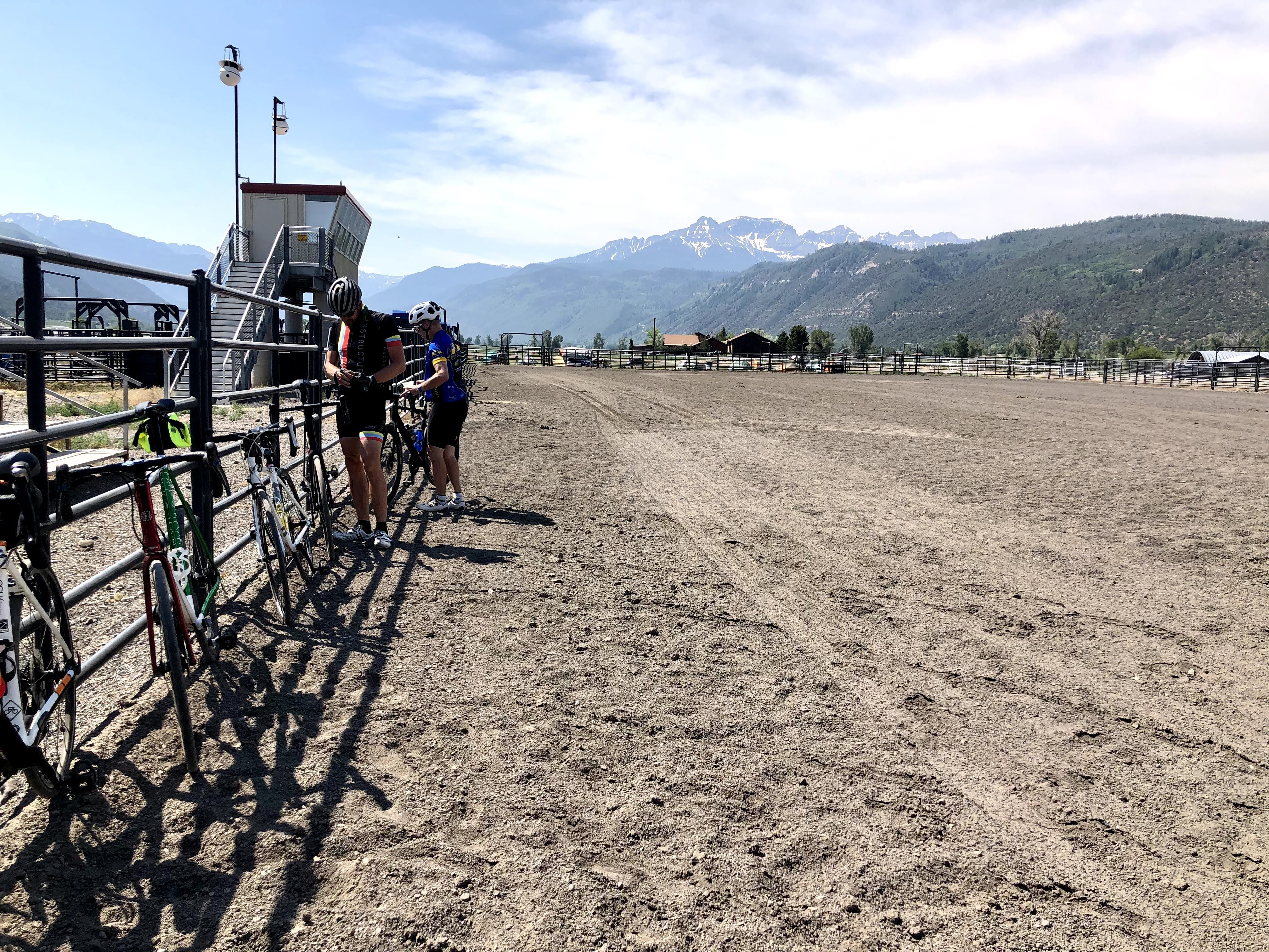 I rode through downtown Ridgway where I could see that there were places to eat when it came time to get some lunch. It was only about noon, and the temperature had just climbed over 100. There was a nice park with a lot of tall shady deciduous trees and finally a fast moving stream before I arrived at the days end. The Ridgway Rodeo grounds. There were no trees in sight, so it was going to be a hot place to hang out for the rest of the day. That park was looking very nice at the moment. The bike corral was actually in the rodeo arena, you may have seen them on the television, a large open ovalish space covered with some kind of soft dirt mixture not unlike a horse track. I guess when you get thrown from a broncing buck, it is better when the ground isn’t quite that hard. My cleated feet sank in the dirt about two inches. At least it wasn’t mud. It was very very hot in there, and I didn’t hang out long. The baggage trucks were there, I found my still untagged bags, and dragged everything to the tent field, where since I was pretty early, I could select the best spot for me. I didn’t linger long there either, as again, it was over 100.