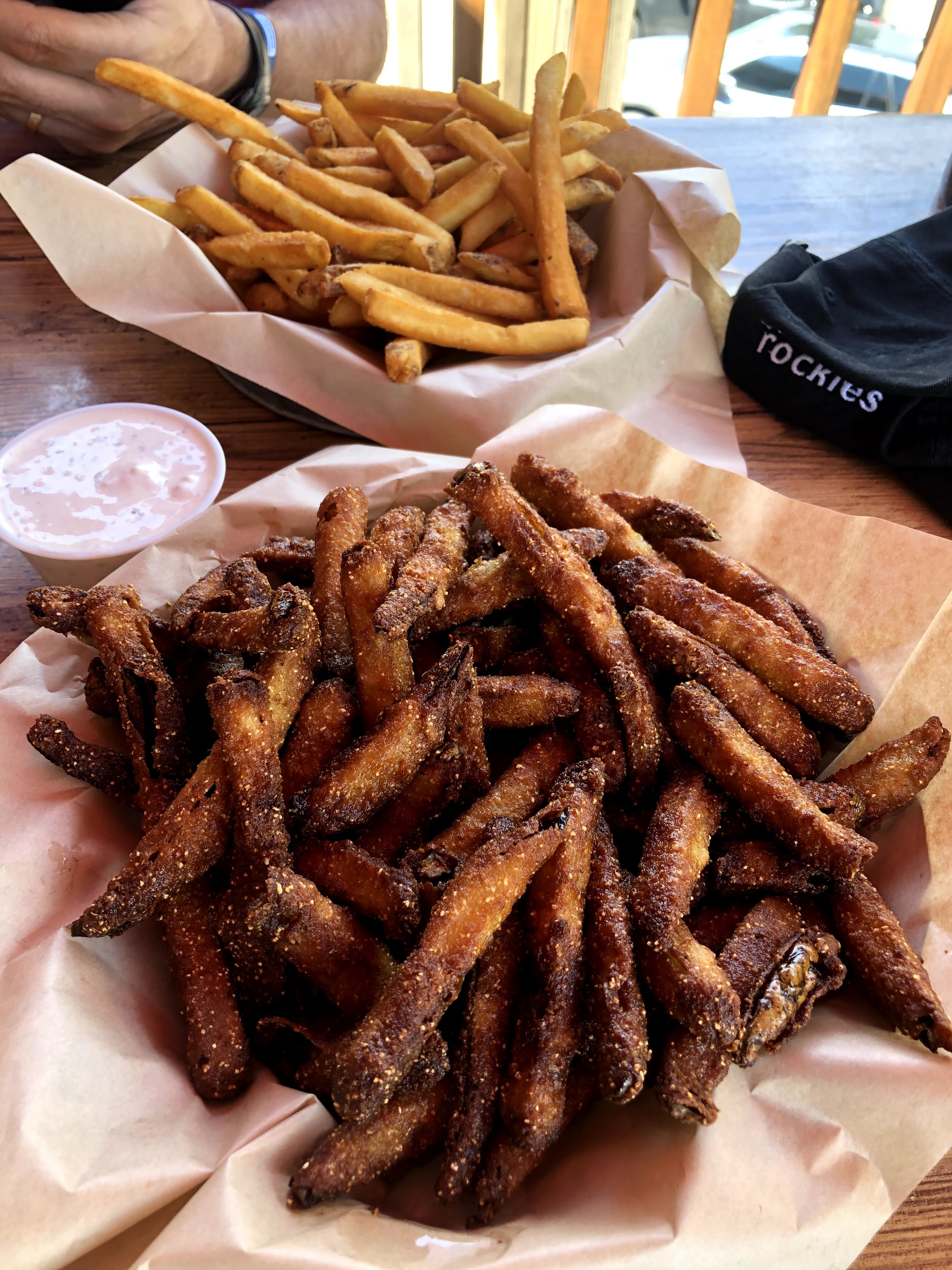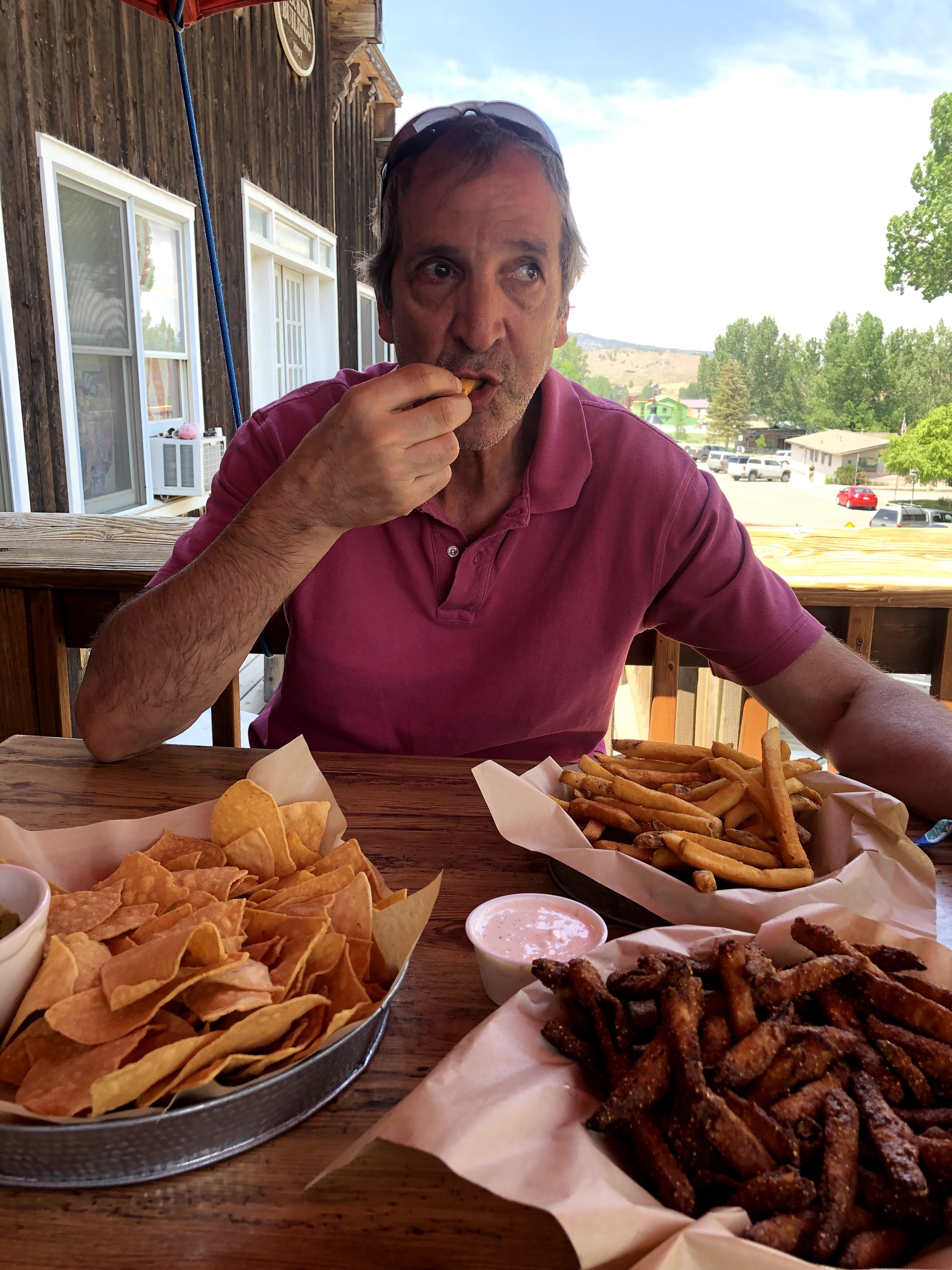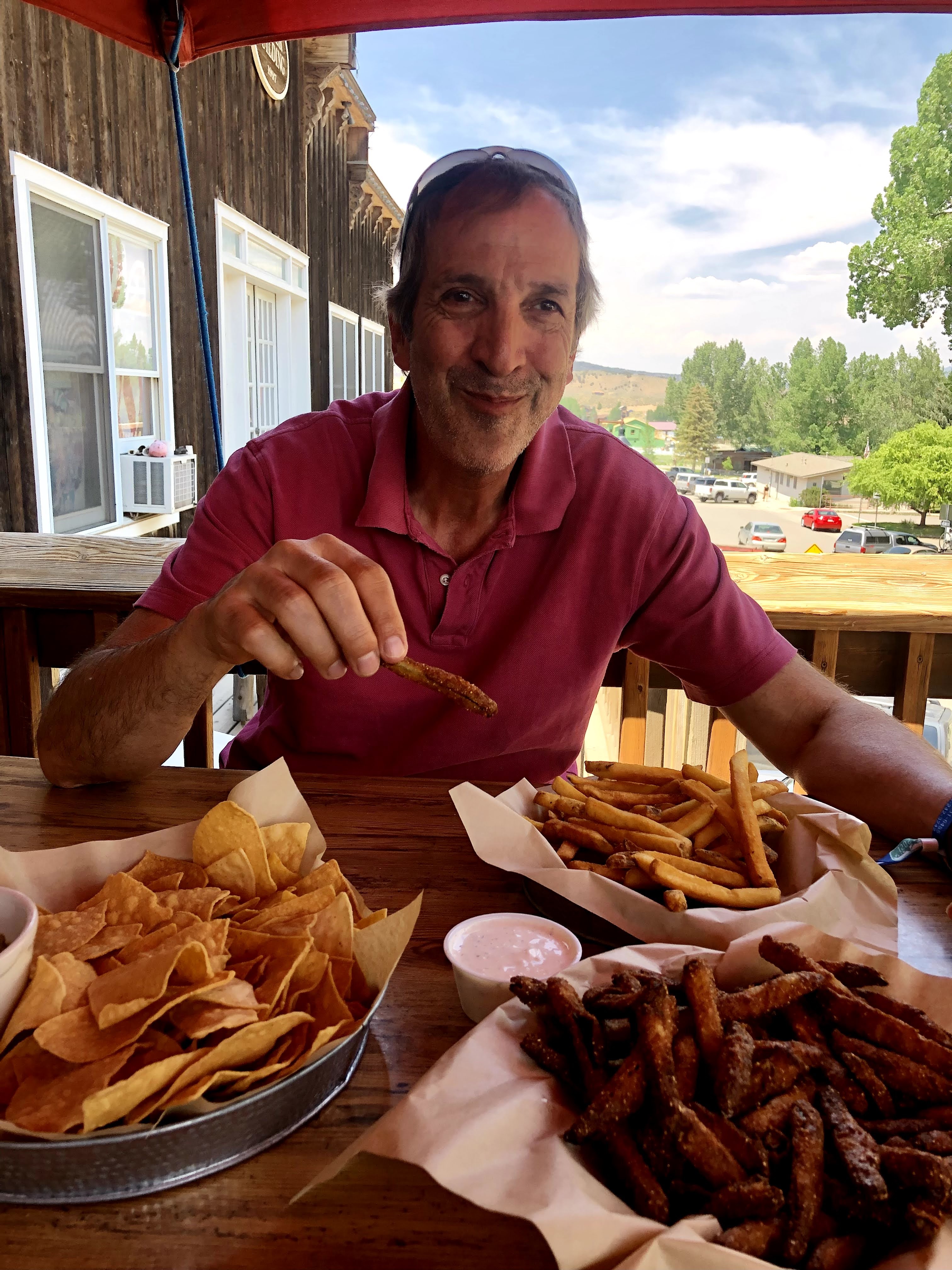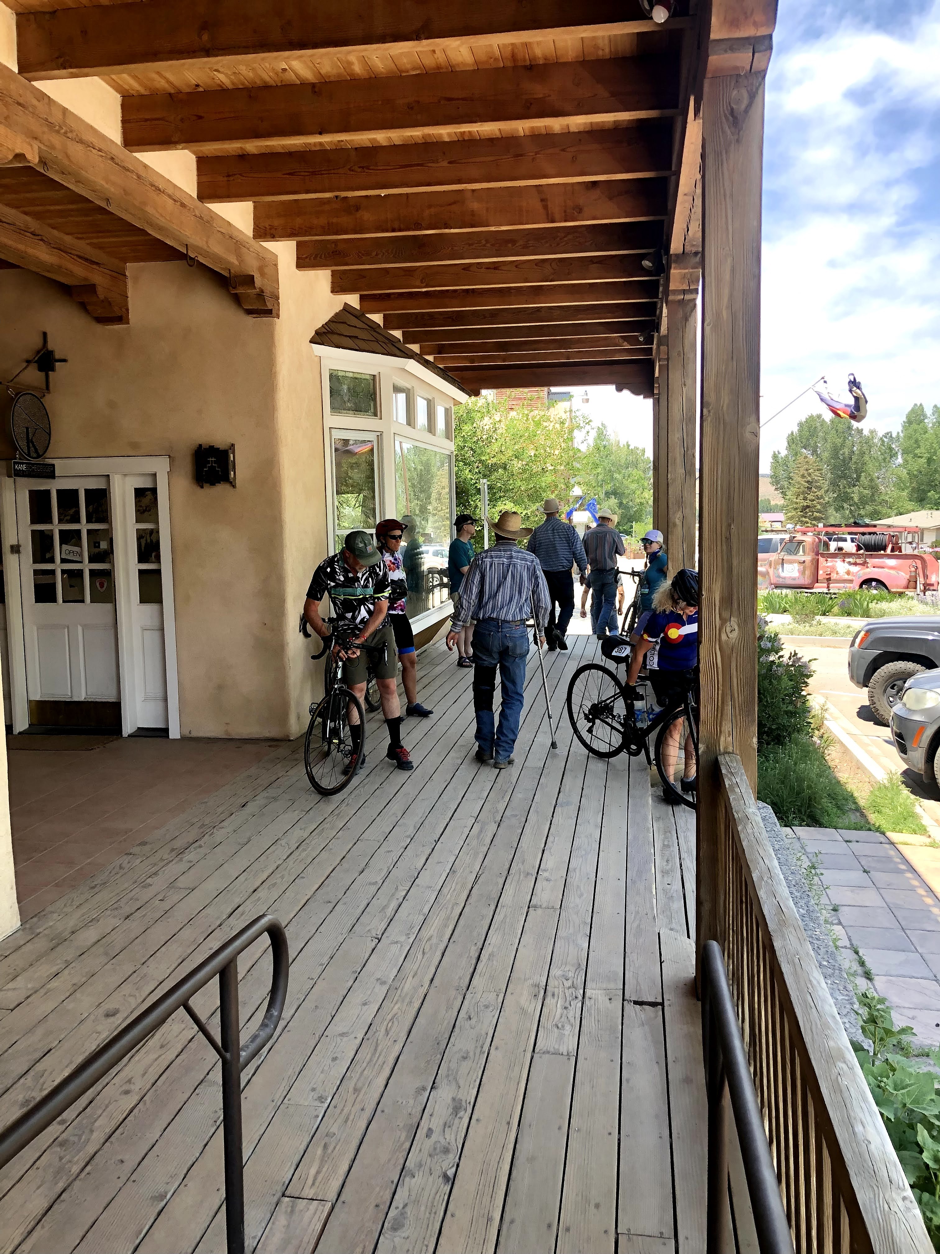 Ken found me just as I emerged from the tent, and filled me in on his and everyone else’s morning. The hotels were all in Ouray, which was about 7-10 miles South of Ridgway on 550. Ouray is a tourist destination and is configured to handle a crowd of touring cyclists. The others, had had enough of the RTR facilities, and had already taken a shuttle to Ouray. Ken had showered and was hungry, as was I, so we walked into town to find some grub. The first place that looked appealing was a tavernish/saloonish looking place called “True Grit”. Recognizing the name, we checked the menu, and we decided we could eat there. Our wait wasn’t long if we didn’t mind setting out on the upstairs deck at a table with an umbrella, and that is what we chose. We ordered way more food than we could eat. On the one hand, I was trying to make up for the calorie debt that I had been operating in, and on the other, I wasn’t really sure what dinner would bring. Oh, by the way, while we were walking to town, we saw a truck pull in that bore the name of the caterer that had abandoned operations on day 2, so maybe they were back to fulfill their contractual duties. Anyway, we ate as much as we could, and hating to leave it to the trash, I wondered where the homeless were living, but no one could answer that, and I had no where to keep the food, so we left it, and walked back to the Rodeo grounds. Ken, had had enough and we departed at the shuttle, agreeing that we would ride the next day together.