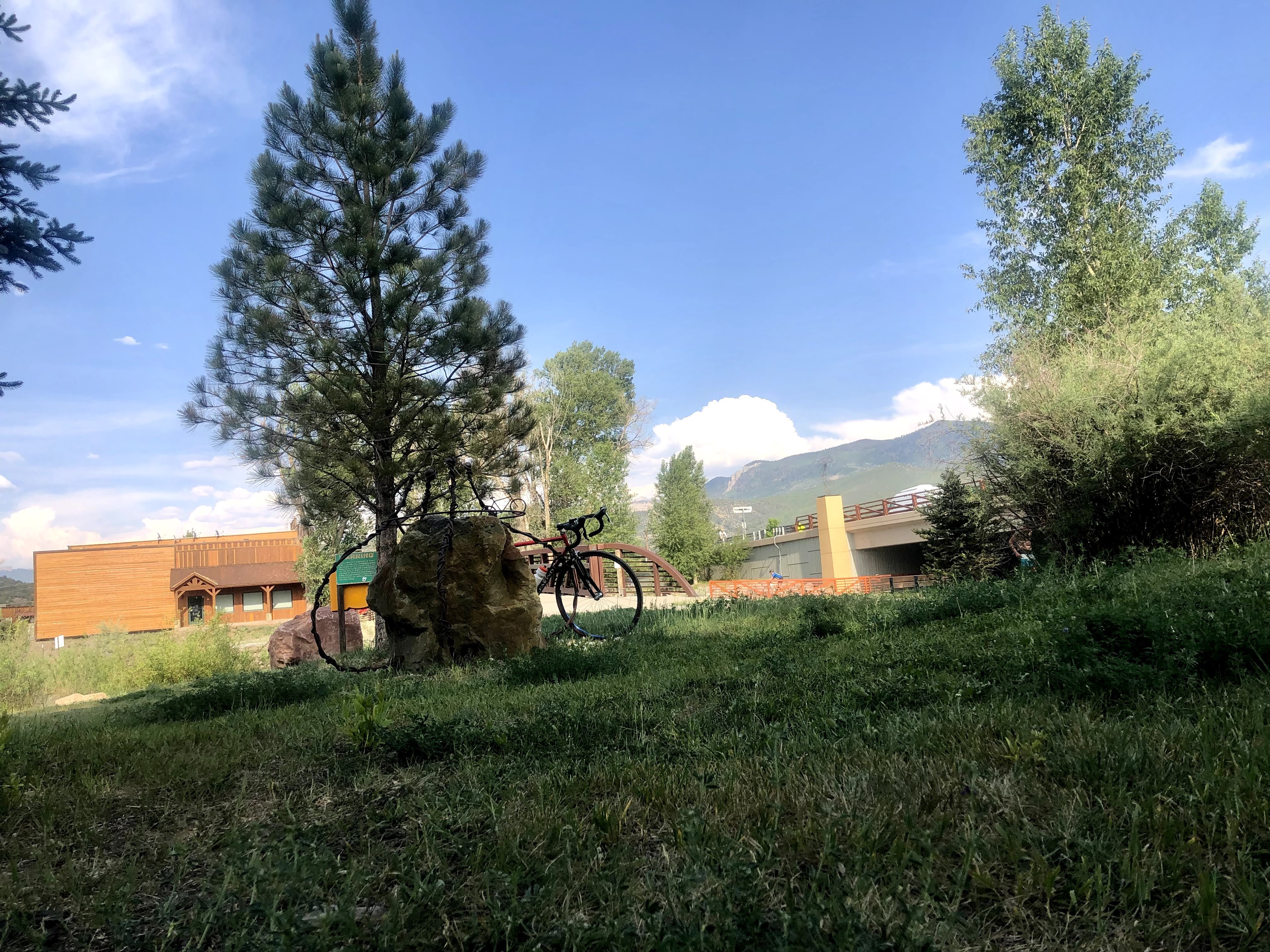 There was little to do at the staging area, and little to no available shade. What shade there was had been occupied by all the riders who were already killing time, so I decided to go back to my tent and grab my cot, and then go find a nice tree in the already observed and described park I had seen. Yes, I had a cot, which I brought with me, and did use the first night in my tent, but decided that it was not really needed in the tent, and it was actually harder to use in the tent than I had thought it would be. So, I had this cot, and this isn’t like the cots that your parents had tucked away in the closet for sleepover guests. No, this was a very light, almost light enough for backpacking, cot which was harder to assemble than those wooden and canvas cots, but was very long, and would give me a very nice resting place when I set it up. I had my backpacking pillow as well, and so off I set. I had noticed that when it came to crossing the stream using the road sidewalk, that there was a separate bridge accessible from the retail center across the street from the Rodeo, so I decided to use that bridge and that is when I found the homeless camps. If I only still had that leftover food! It wasn’t a huge camp but there were a few tents setup, and the folks there were quite pleasant. There was a nice tree throwing a lot of shade, so I set myself up there with the sound of the water easily heard, and I laid down to nap. I could overhear a conversation between some of the folks in residence that included a dude on a pretty beat up old bike that was carrying all of his possessions. They were sharing stories of their journeys, the bike guy basically moving town to town in the SW trying to find “something” he could hang his hat on, but the homeless life is a rough life. Ridgeway, it seems, doesn’t try and chase them out, and they can get food from a lot of the locals. There are facilities in the park, and the stream offers a way to clean up. I was going to offer them some money, but I only had a twenty in my pocket, and I needed two more and I didn’t see a bank nearby. I should have been better prepared. It’s a result of transacting digitally for almost everything, that I hardly ever carry cash anymore. I could have made more of an effort, but I did not, and I packed up my things and walked back to the Rodeo Grounds.