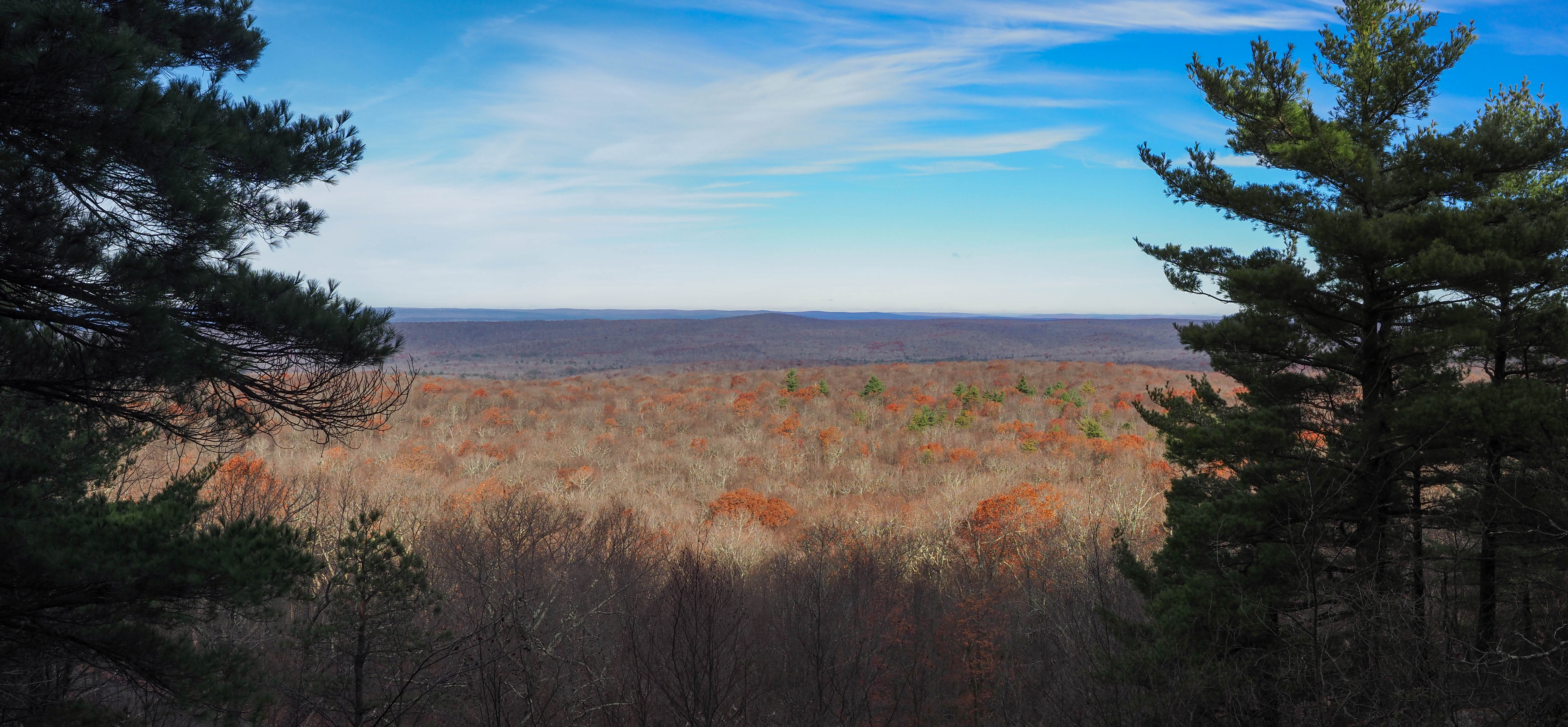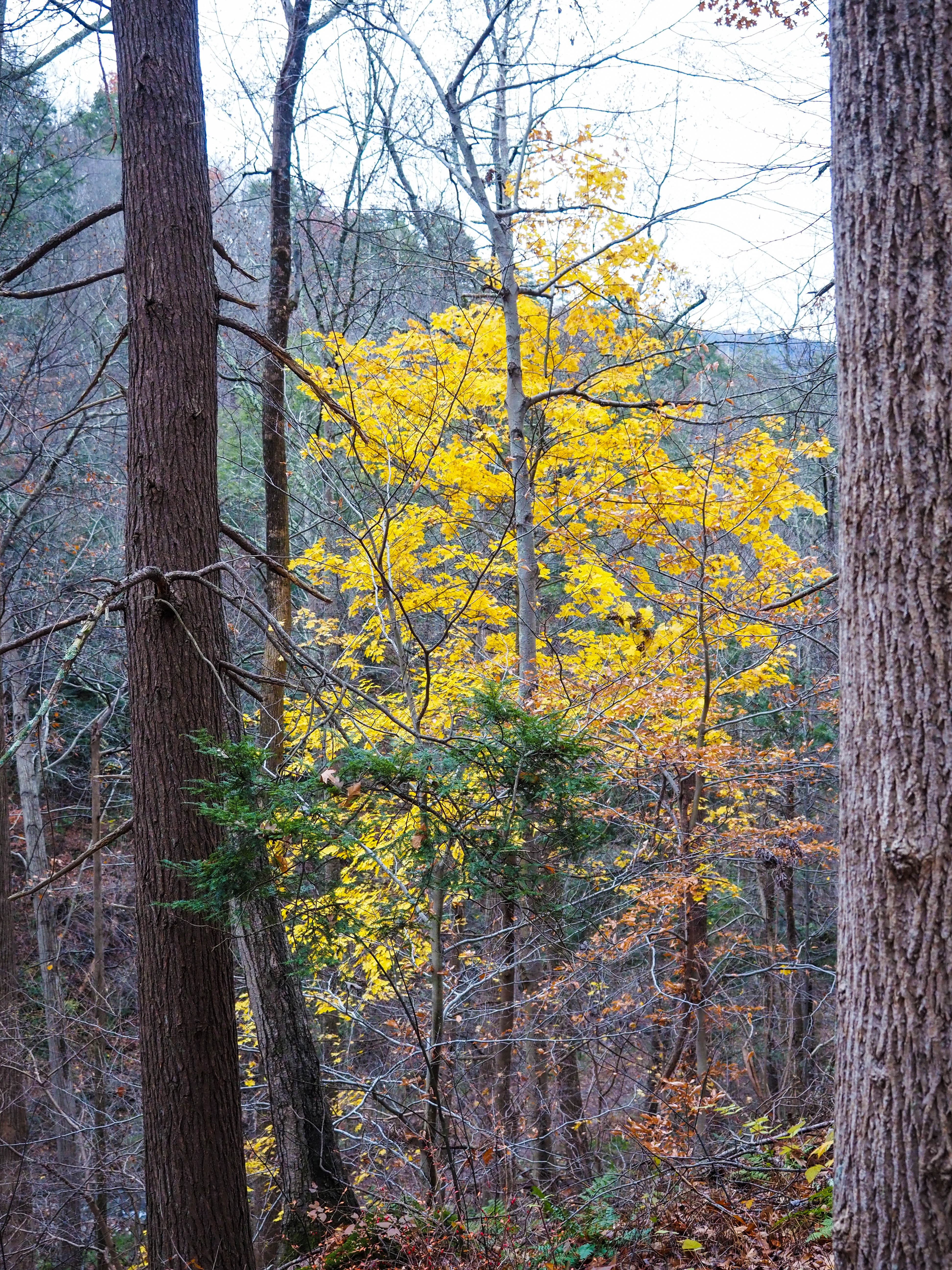 We reached the pavilion on Sunrise Mountain, long after sunrise and perhaps long after anyone who came up for the sunrise had retreated back to their warm cars. As one might expect, Sunrise Mountain offers a wide open expansive view of the East. On a really clear day the tops of the Manhattan skyline might be visible in some parts of the sky. There are ridges to the East to block most of the view, but that said, it is a spectacular view. We grabbed a few shots and continued on to Culver’s Gap a.k.a. Route 206, still about 2.5 miles away. Most of that is continued ridge walk, but at the end, the trail drops quickly down to the Sunrise Mountain access road, and then it’s a level walk out to 206. Before we got there we happened upon a large group of young people of Asian origins. Taiwan specifically, all Rutgers students, all out for a Saturday outing. We met the first group on the ridge just before the trail drops, and we chatted up the two at the back of the group who answered our questions, while we answered theirs. Afterwards we passed slower pairs who always asked “How far behind are we?”, until we were off the ridge and we came across the second wave, who must have been in different vehicles, and got separated. We told them they were about 30 minutes back of their friends and on we went.