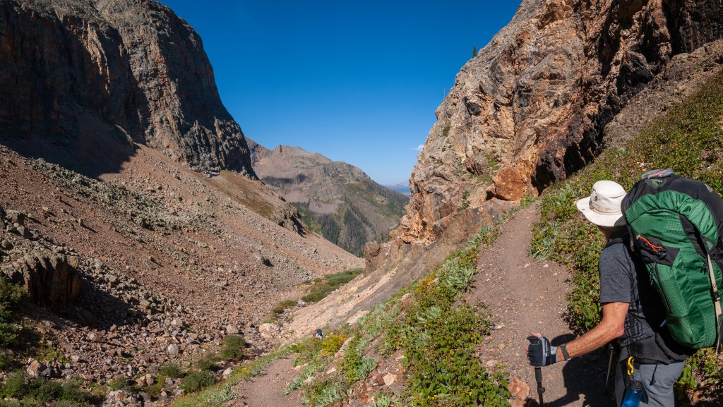 On this day we also ran into David Fanning, a photographer and frequent Colorado Trail hiker, on his way, again, to Durango from Denver. I think I had read that we were intersecting with the Colorado Trail while on Elk Creek, but it just didn’t stick with me until I stopped to talk to David. This was David’s fifth traverse of the Colorado Trail and his comments were that though the trail is very beautiful everywhere along it, the San Juan Mountains are still his favorite for their grandeur and beauty. His parting words “Enjoy the switchbacks” left me wondering what he meant by that. Did we have some killer switchbacks ahead, and he was simply warning us? I didn’t know, and I probably should have called out to find out what he meant. He seemed an easy going dude, so I decided he meant well, and maybe we were in for a treat.