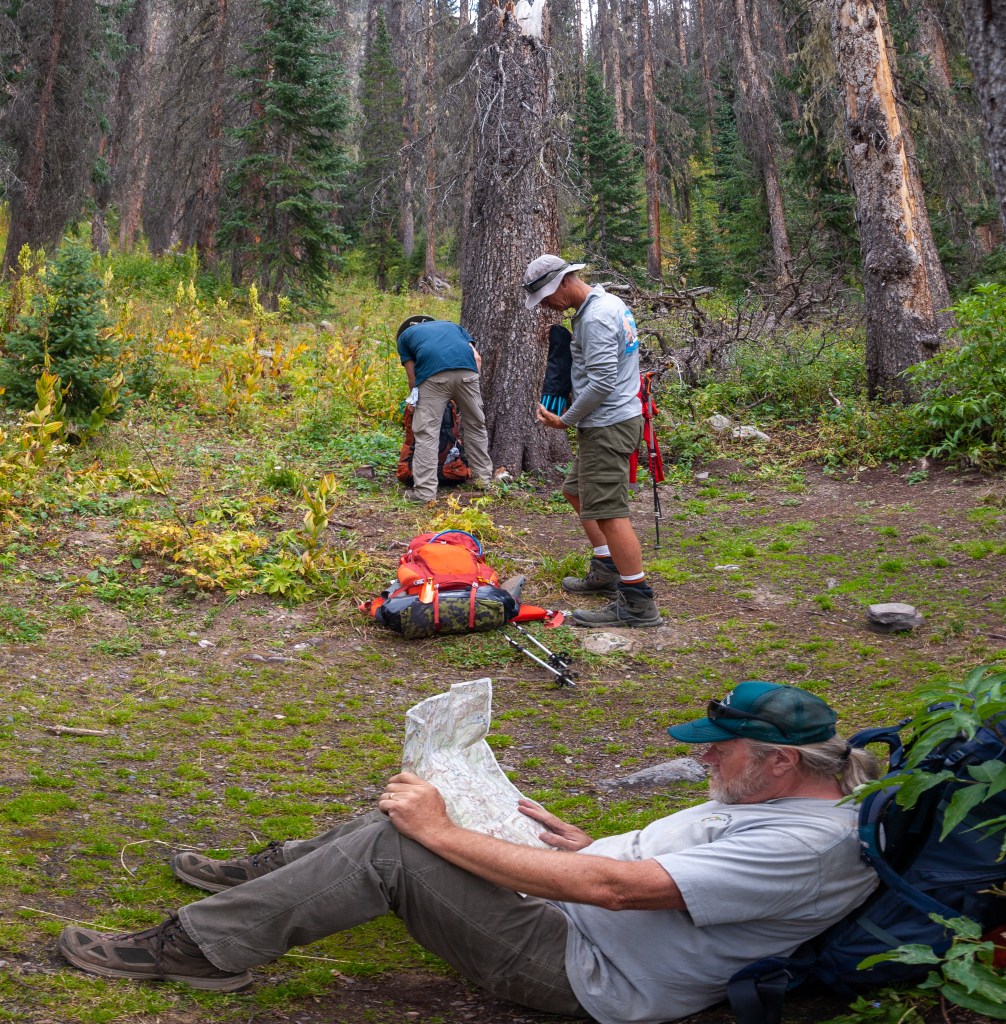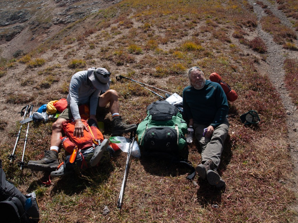 It was a big day today, and so I didn’t let anyone sleep in. Get up, eat, and let’s break camp and get going. This was our first breakfast and this trip, instead of having all the ingredients in separate bags that in the past, required us to “find” all the ingredients before we could start breakfast. This year, everyone combined or parceled out their own ingredients from the master supply, so as soon as you had your own food bag, you were good to go if you had hot water. When you only have to bring the water to 191 degrees, boiling water goes a wee bit faster when you are near 11,000′, and so we had hot water for all soon enough. Coffee at 191 is easier to drink as well! May not stay hot as long, but who is taking their time? We have trail to hike!