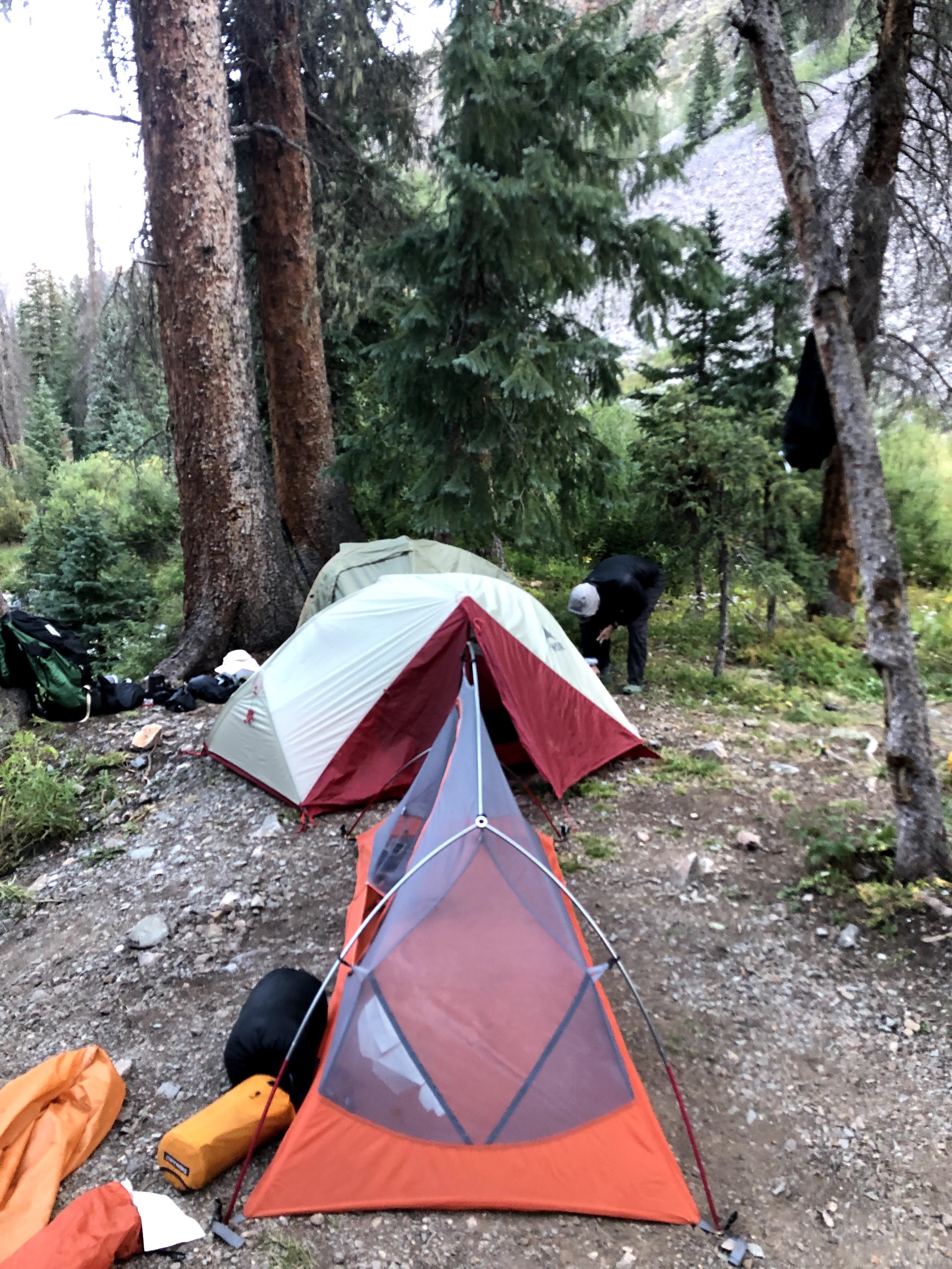 What we were discussing was, that instead of spending two nights here, and then 1 night somewhere up Johnson Trail on the way to Columbine Pass, we use the next day to find a nice spot at the confluence of Johnson and Vallecito creeks, and then we use the next day to get as high up Johnson as we could so our assault on Columbine would much easier/shorter. Before we all turned in that is exactly what we decided to do. Both days would be easy going days, instead of one grueling. Another advantage is that doing it this way would have us settling in before other groups, or hiking pairs, so we would probably have our pick of any camp sites, where as if we pulled in late afternoon after a tiring day, and the only large site was taken, then that would suck. So, we let the fire die down, spread it out, covered it in rocks, and turned in for our second night in the Weminuche Wilderness.