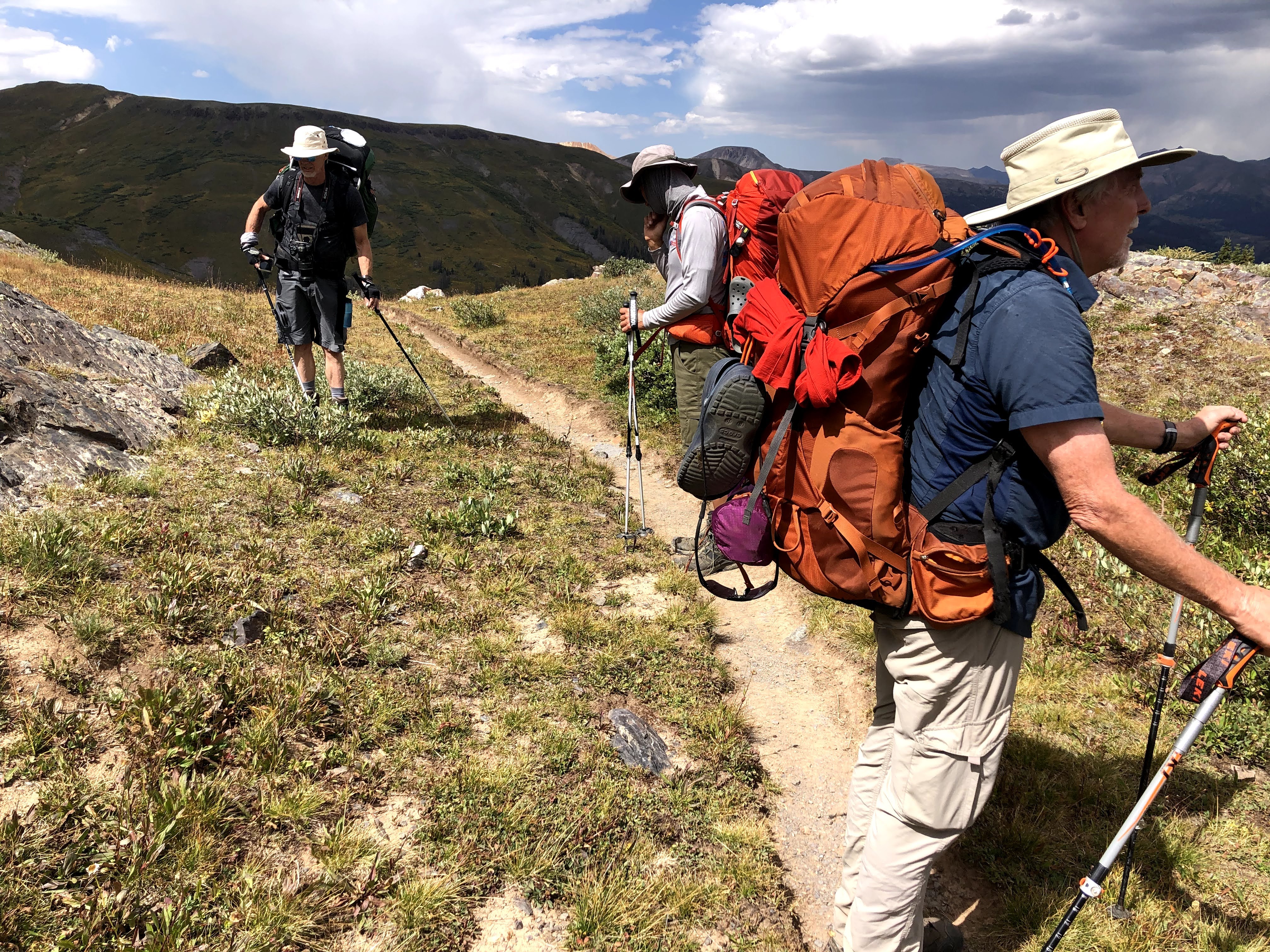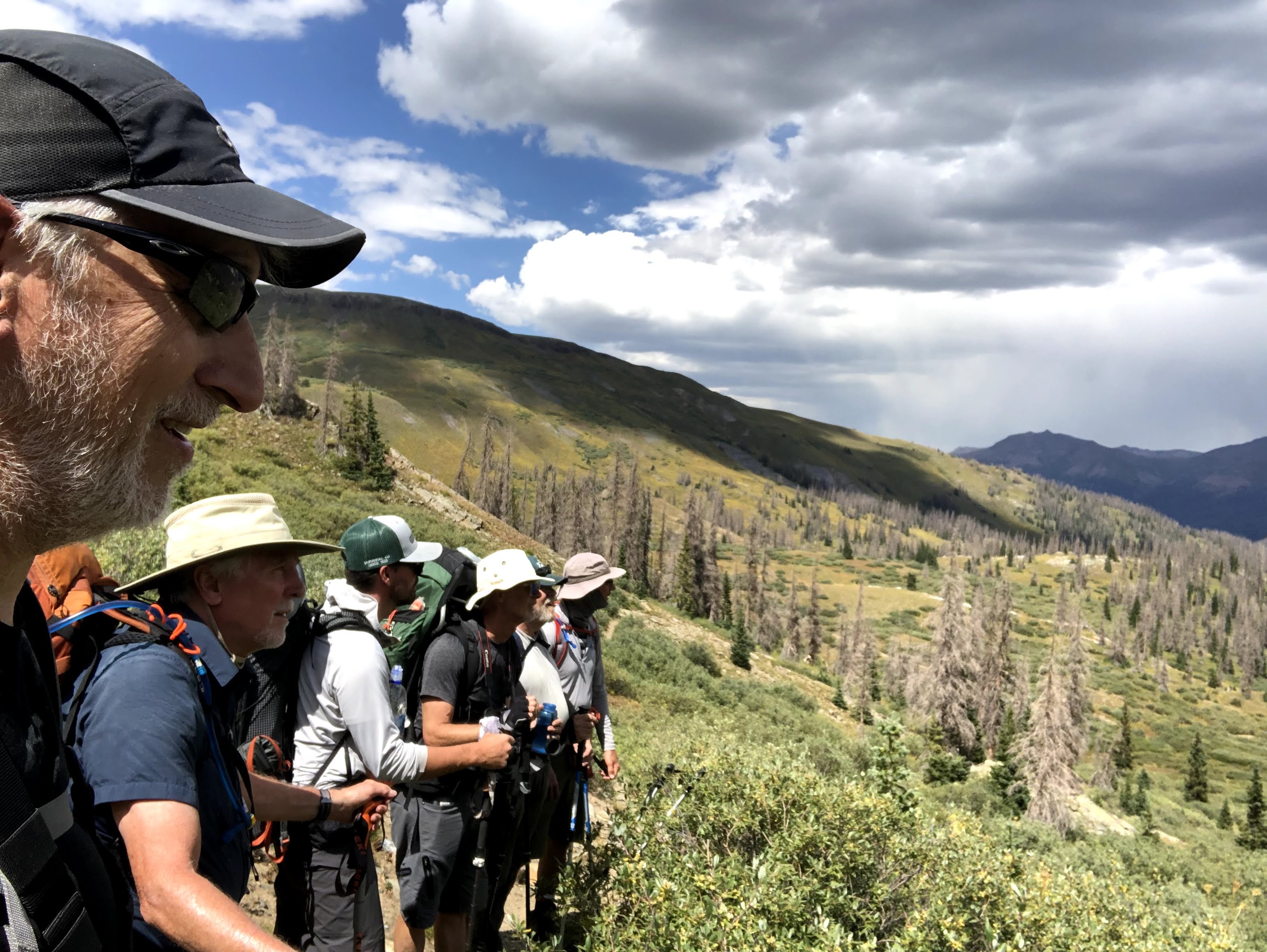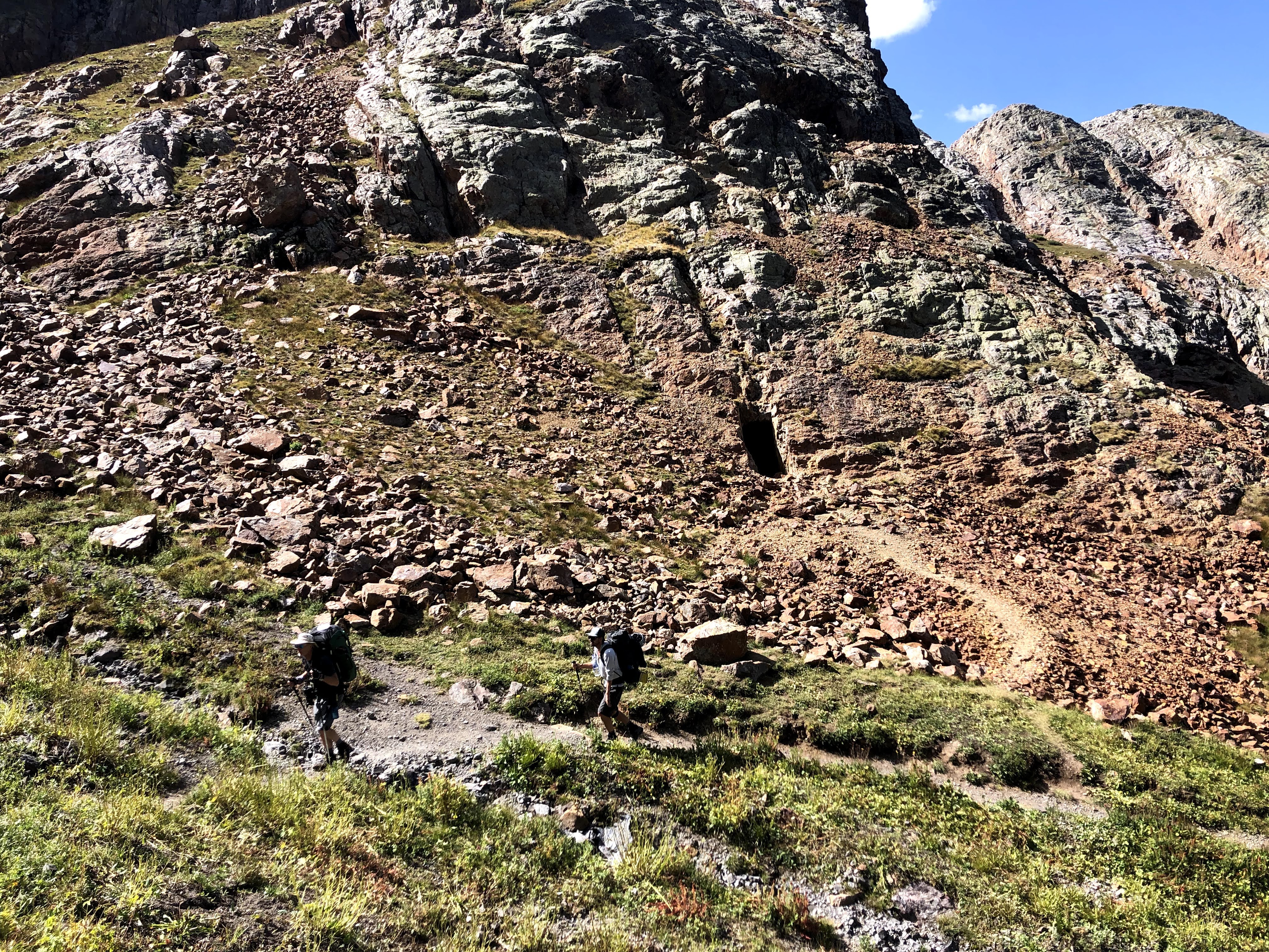 Just before I hit the first switchback, though as I recall it wasn’t clear exactly where the trail was going to go, I passed the first of two holes into the side of the mountain. How much ore did the miner take out of that hole? How far in does it go? On the outside the only thing that was crystal clear was 6’4″ people didn’t come high into the mountains to begin digging a hole into the rock. Tiny people did that. Smaller people dig smaller holes. Once I crossed this cut in the trail, then the switchbacks revealed themselves, previously hidden by the grasses on the hillside, and then the beauty of “Enjoy the Switchbacks” emerged. They were nice easy-peasy jaunts back and forth across the grassy incline all the way to the top, and since you were now hike perpendicular to the overall direction of travel, you now had the full splendor of where we had been available with just a slight turn of the head, as opposed to stopping to turn around. Those switchbacks were a definite high point of the trip. There was just one slight problem. I call it a problem, but really I was just over-reacting, but when I looked back at the miner’s cabin, Paul was still sitting there. I haven’t hiked enough with Paul to know what his habits/limits are, so I was throwing around ideas in my head for why he hadn’t started to move yet, and Kevin, who was with me was also concerned. I won’t harp on this too much, but we asked two descenders to ask Paul to raise and cross his poles if he was okay, and to wave them back and forth if he was having issues, and though it took time for them to descend, I waited for them to get there, and Paul raised and crossed his poles, and Kevin and I resumed our ascent. Below us, scattered among the switchbacks were Dan, Jim and Walt all moving forward. Shortly afterwards, Paul left the cabin, and was soon into the switchbacks himself.