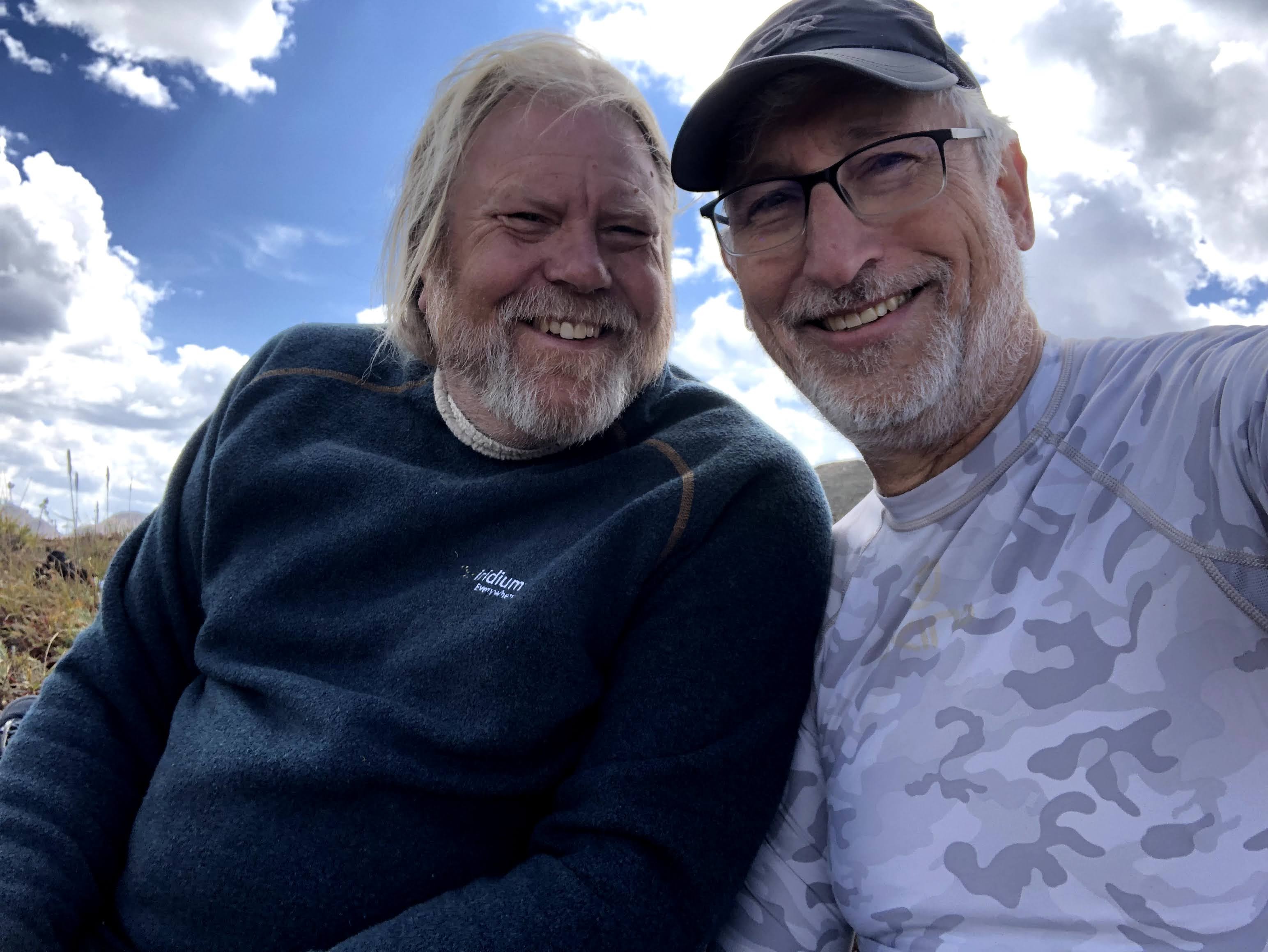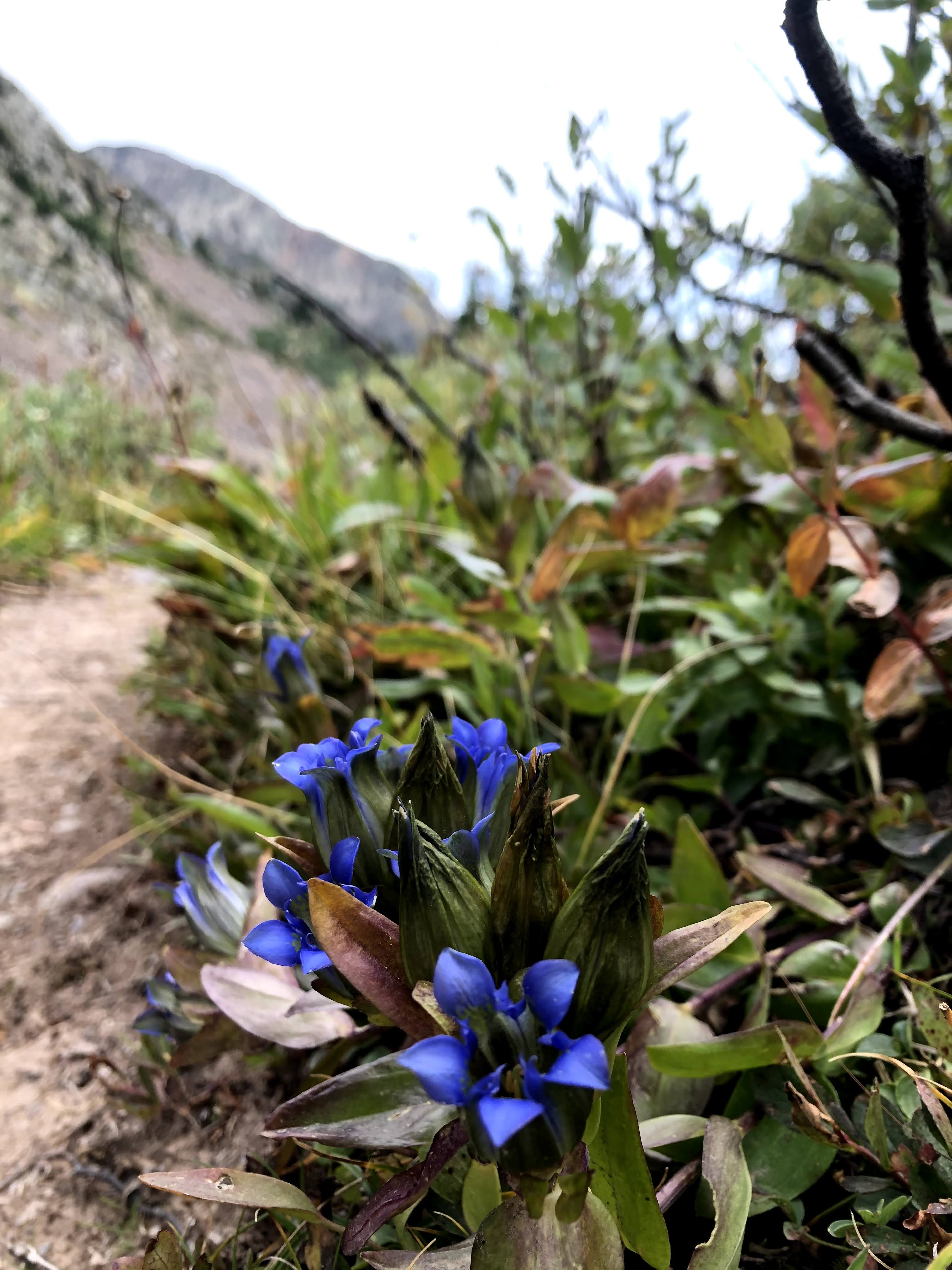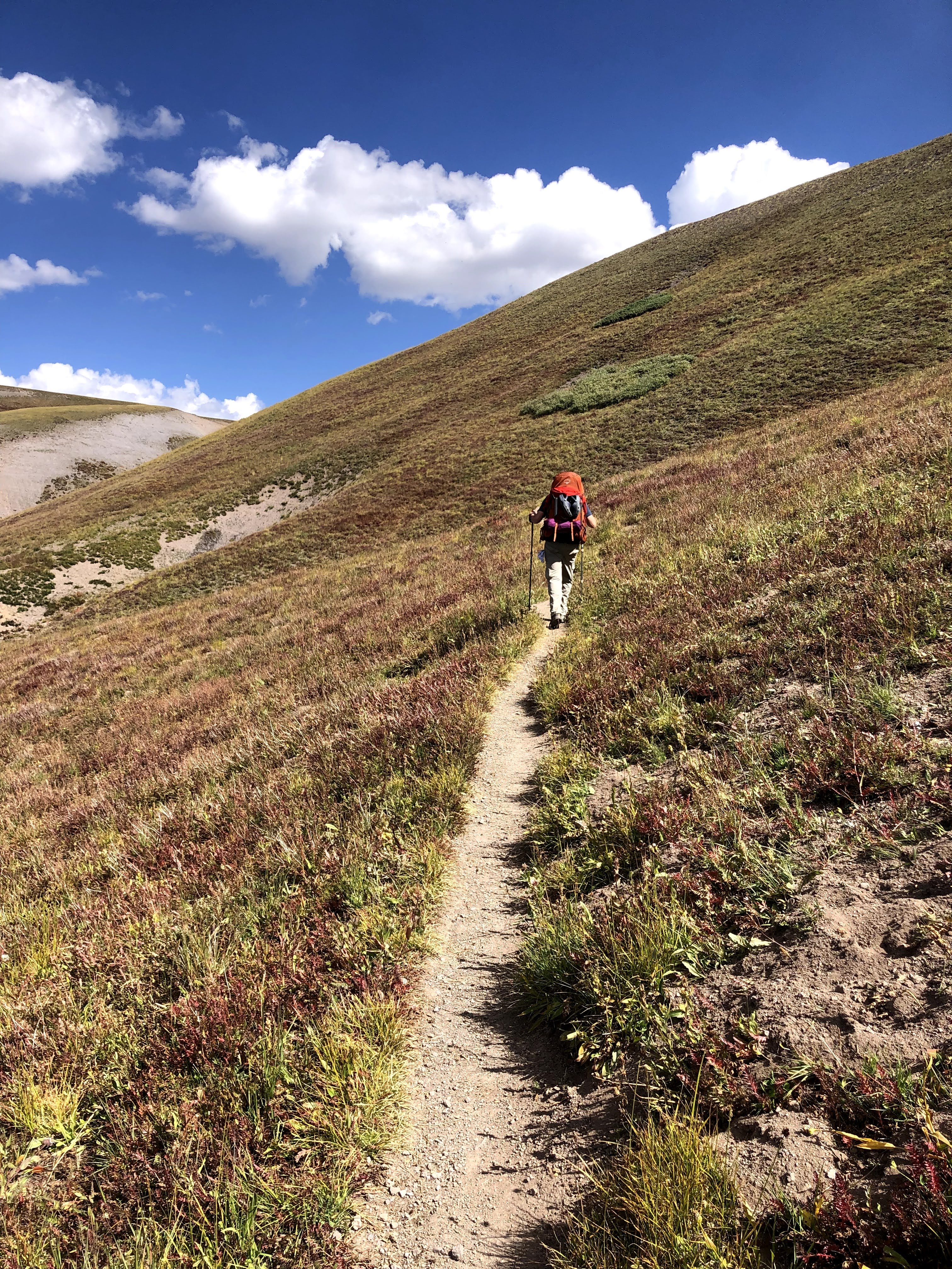 Just before I hit the first switchback, though as I recall it wasn’t clear exactly where the trail was going to go, I passed the first of two holes into the side of the mountain. How much ore did the miner take out of that hole? How far in does it go? On the outside the only thing that was crystal clear was 6’4″ people didn’t come high into the mountains to begin digging a hole into the rock. Tiny people did that. Smaller people dig smaller holes. Once I crossed this cut in the trail, then the switchbacks revealed themselves, previously hidden by the grasses on the hillside, and then the beauty of “Enjoy the Switchbacks” emerged. They were nice easy-peasy jaunts back and forth across the grassy incline all the way to the top, and since you were now hike perpendicular to the overall direction of travel, you now had the full splendor of where we had been available with just a slight turn of the head, as opposed to stopping to turn around. Those switchbacks were a definite high point of the trip. There was just one slight problem. I call it a problem, but really I was just over-reacting, but when I looked back at the miner’s cabin, Paul was still sitting there. I haven’t hiked enough with Paul to know what his habits/limits are, so I was throwing around ideas in my head for why he hadn’t started to move yet, and Kevin, who was with me was also concerned. I won’t harp on this too much, but we asked two descenders to ask Paul to raise and cross his poles if he was okay, and to wave them back and forth if he was having issues, and though it took time for them to descend, I waited for them to get there, and Paul raised and crossed his poles, and Kevin and I resumed our ascent. Below us, scattered among the switchbacks were Dan, Jim and Walt all moving forward. Shortly afterwards, Paul left the cabin, and was soon into the switchbacks himself.