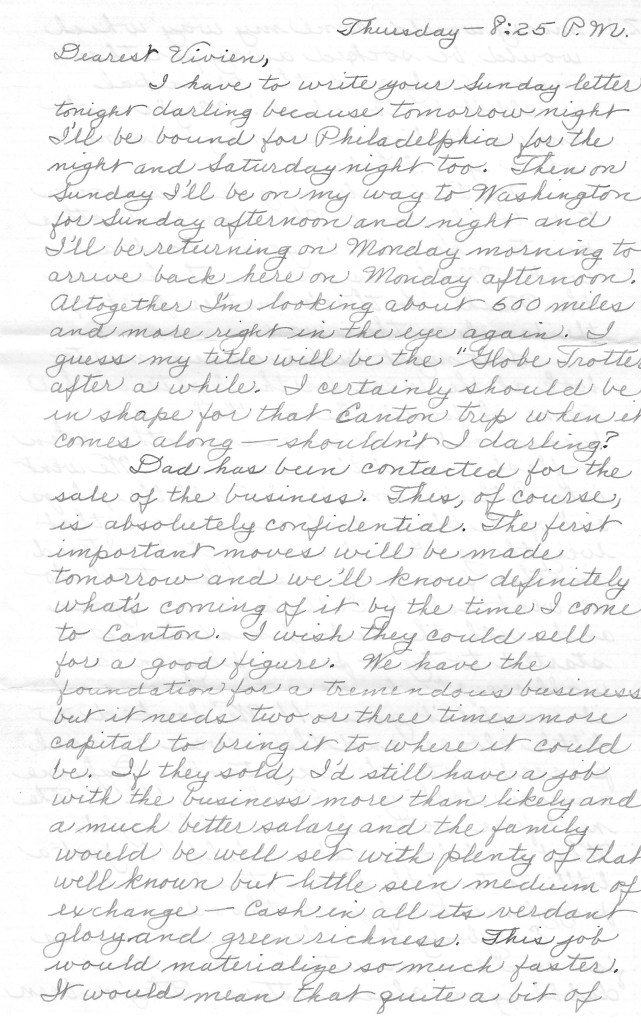 Dad has been contacted for the sale of the business1. This, of course, is absolutely confidential. The first important moves will be made tomorrow and we’ll know definitely what’s coming of it by the time I come to Canton. I wish they could sell for a good figure. We have the foundation for a tremendous business but it needs two or three times more capital to bring it to where it could be. If they sold, I’d still have a job with the business more than likely and a much better salary and the family would be well set with plenty of that well known but little seen medium of exchange – Cash in all its verdant glory and green richness. This job would materialize so much faster. It would mean that quite a bit of money would come my way which would be socked away for the income only and the principal wouldn’t be touched. Maybe – who knows darling – we may be somewhere yet, I hope.