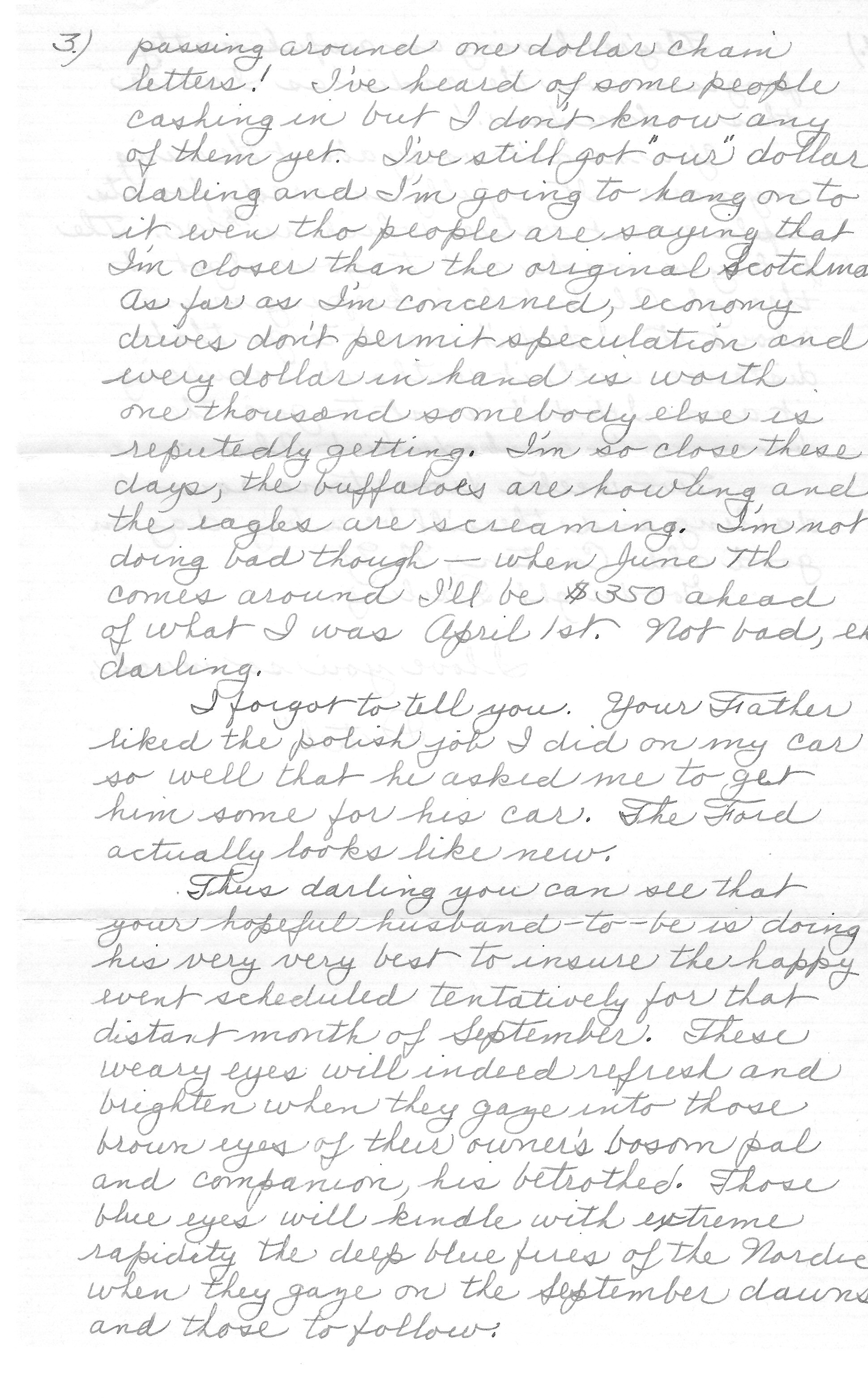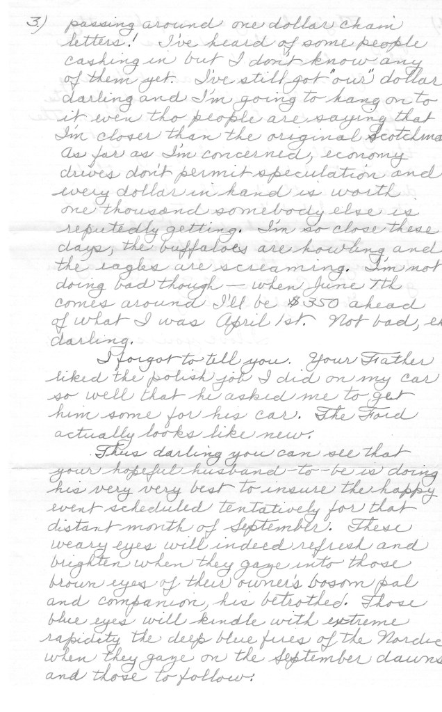 Everybody down here except me as far as I an ascertain have been dabbling in chain letters. They’ve been passing around one dollar chain letters! I’ve heard of some people cash in in but I don’t know any of them yet. I’ve still got “our” dollar darling and I’m going to hang on to it even though people are saying that I’m closer than the original Scotchman4. As far as I’m concerned, economy drives don’t permit speculation and every dollar in hand is worth one thousand somebody else is reputedly getting. I’m so close these days, the buffaloes are howling and the eagles are screaming. I’m not doing bad though – when June 7th comes around I’ll be $350 ahead of what I was April 1st. Not bad, eh darling?