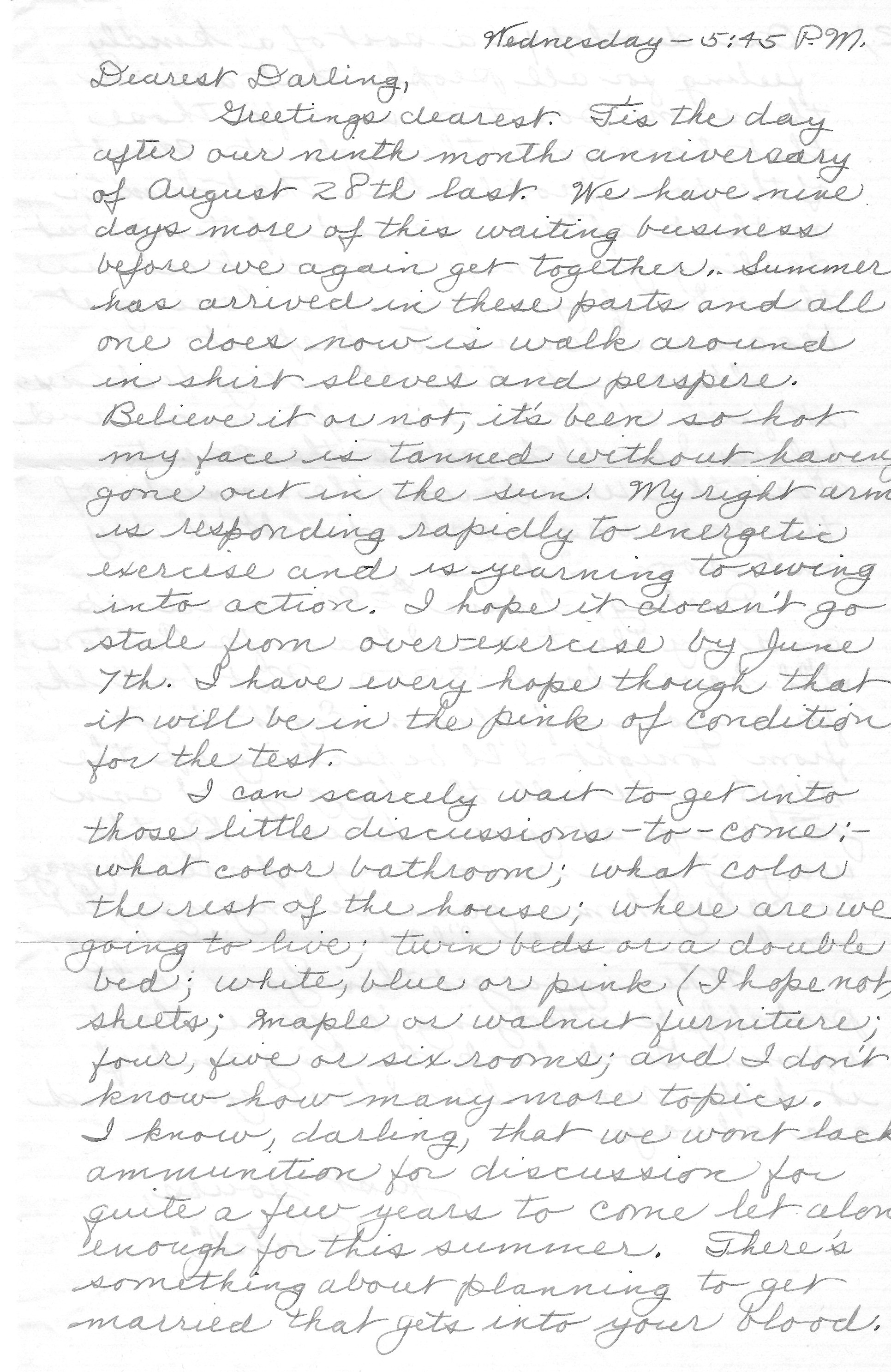 Greetings dearest. Tis the day after our ninth month anniversary of August 28th last. We have nine days more of this waiting business before we again get together. Summer has arrived in these parts and all one does now is walk around in shirt sleeves and perspire. Believe it or not, it’s been so hot my face is tanned without having gone out in the sun. My right arm is responding rapidly to energetic exercise and is yearning to swing into action. I hope it doesn’t go stale from over-exercise by June 7th. I have every hope though that it will be in the pink of condition for the test.