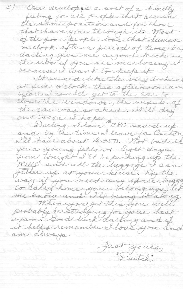 Darling, I have $280 saved up and by the time I leave for Canton I’ll have about $350. Not bad eh, for a young fellow1. Eight days from tonight I’ll be picking up the RING and all the luggage I can gather up at your house. By the way if you need any spare luggage to carry home your belongings, let me know and I’ll bring it along.