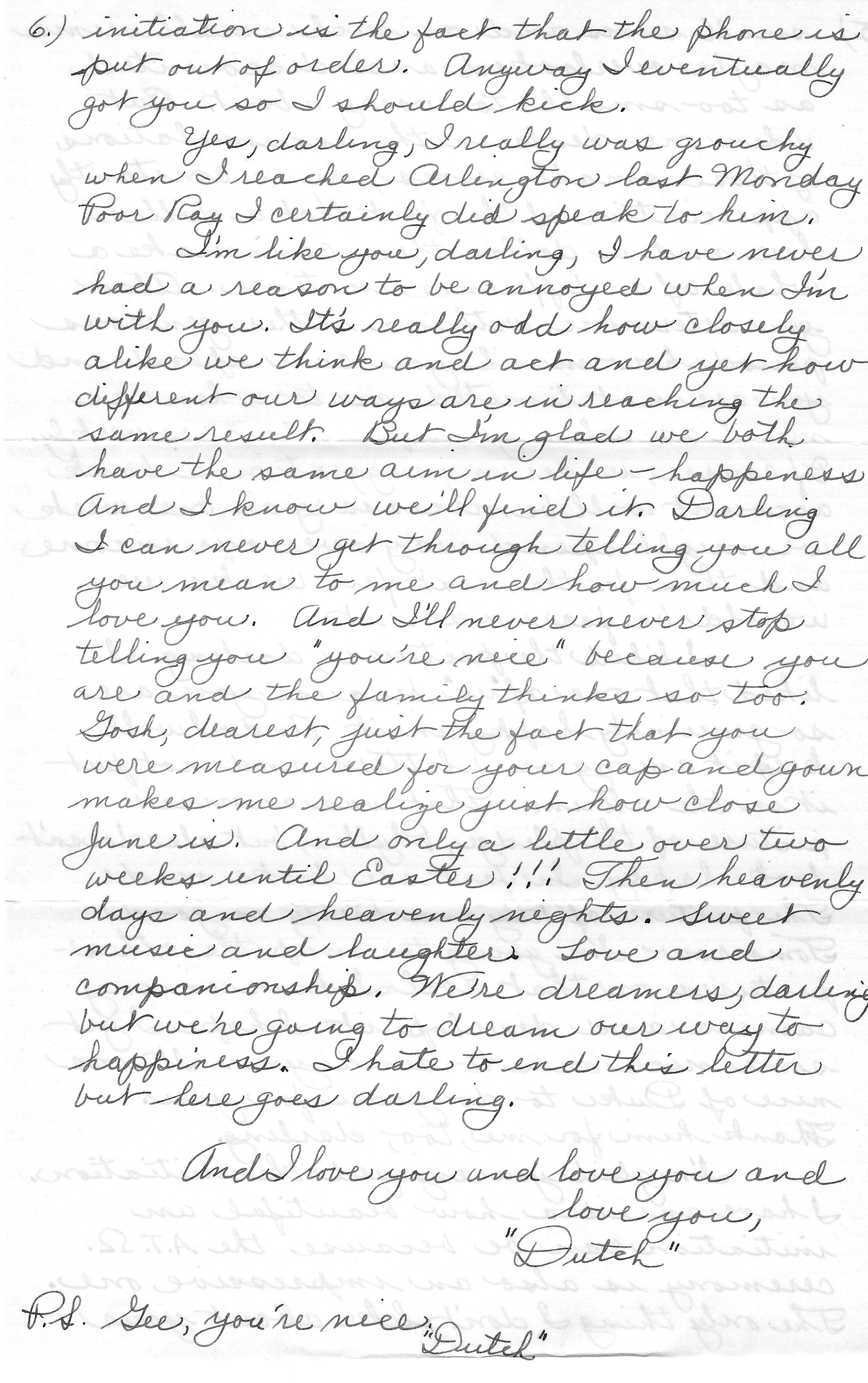 I’m like you, darling, I have never had a reason to be annoyed when I’m with you. It’s really odd how closely alike we think and act and yet how different our ways are in reaching the same result. But i’m glad we both have the same aim in life – happiness. And I know we’ll find it. Darlin I can never get through telling you all you mean to me and how much I love you. And I’ll never never stop telling you “you’re nice” because you are and the family thinks so too. Gosh, dearest, just the fact that you were measured for your cap and gown makes me realize just how close June is. And only a little over two weeks until Easter!!! Then heavenly days and heavenly nights. Sweet music and laughter. Love and companionship. We’re dreamers, darling, but we’re going to dream our way to happiness. I hate to end this letter but here goes darling.