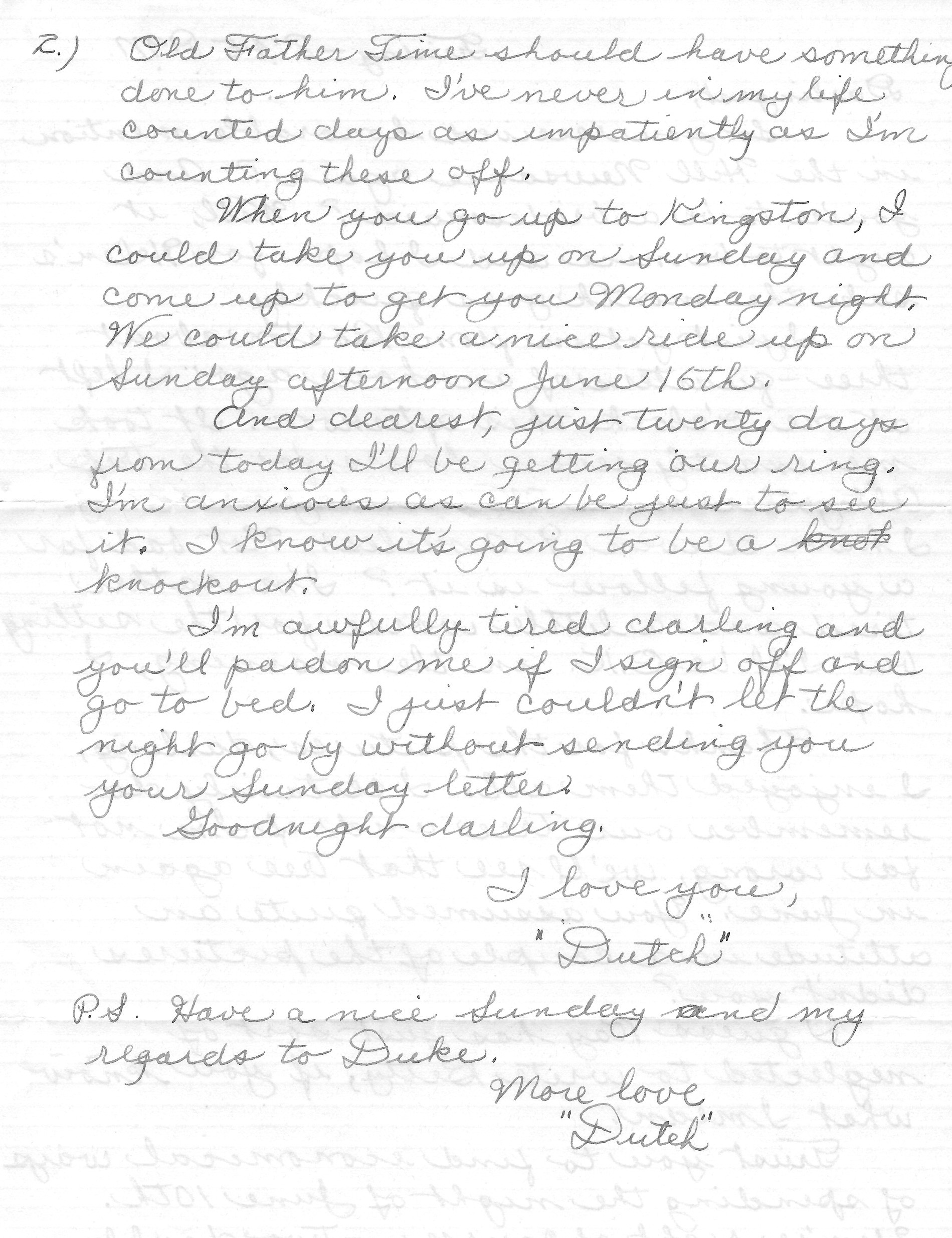 I’m awfully tired darling and you’ll pardon me if I sign off and go to bed. I just couldn’t let the night go by without sending you your Sunday letter.