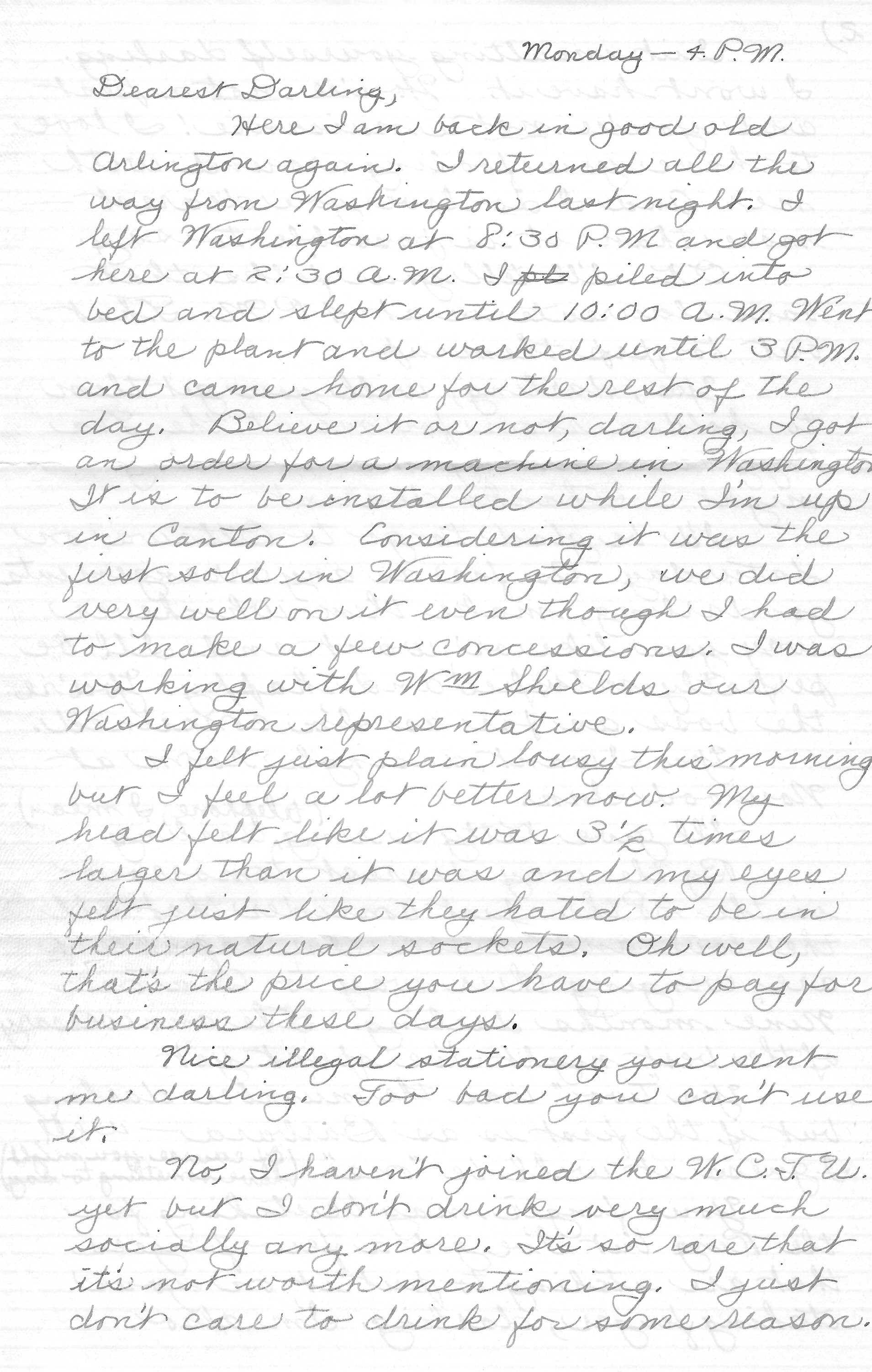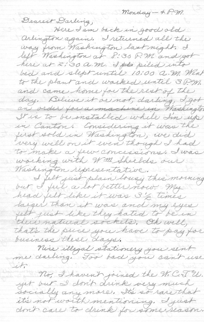 Here I am back in good old Arlington again. I returned all the way from Washington last night. I left Washington at 8:30 P.M. and got here at 2:30 A.M. I pile into bed and slept until 10:00 A.M. Went to the plant and worked until 3 P.M. and came home for the rest of the say. Believe it or not, darling, I got an order for a machine in Washington. It is to be installed while I’m up in Canton. Considering it was the first sold in Washington, we did very well on it even though I had to make a few concessions. I was working with Wm Shields, our Washington representative.