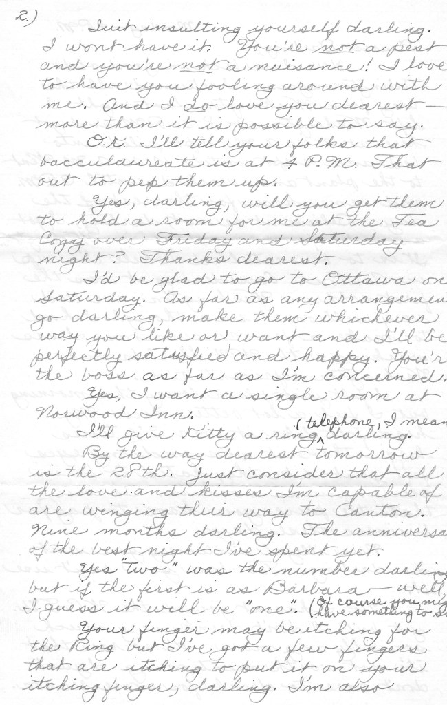 I’ll give Kitty a ring (telephone, I mean) darling. By the way dearest tomorrow is the 28th. Just consider that all the love and kisses I’m capable of are winging their way to Canton. Nine months darling. The anniversary of the best night I’ve spent yet3.