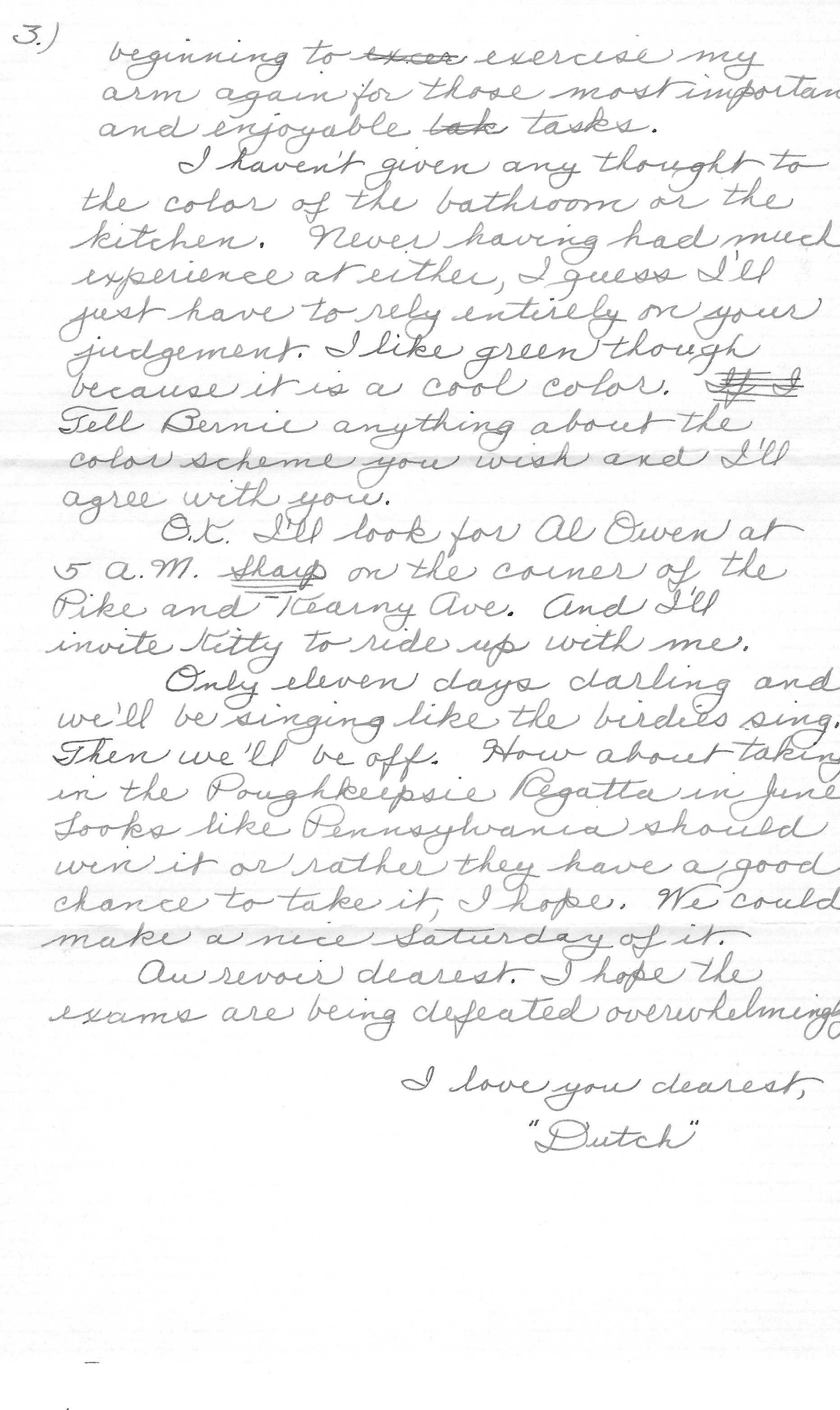Only eleven days darling and we’ll be singing like the birdies sing. Then we’ll be off. How about taking in the Poughkeepsie Regatta in June? Looks like Pennsylvania should win it or rather they have a good chance to take it, I hope. We could make a nice Saturday of it.