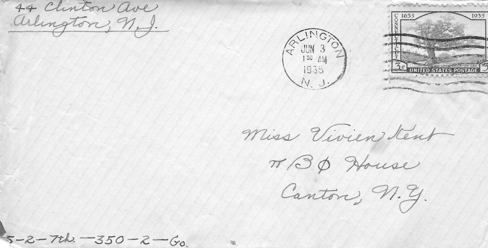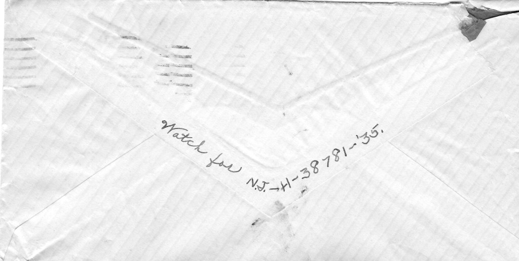 The envelope of this letter has some “extras”. “5-2-7th-350-2-go” Which means 5 days to the 7th, then 350 miles to drive (go). On the back is “Watch for N.J.-H-38781-’35” which I believe is the license plate for Elvin’s vehicle. For example.