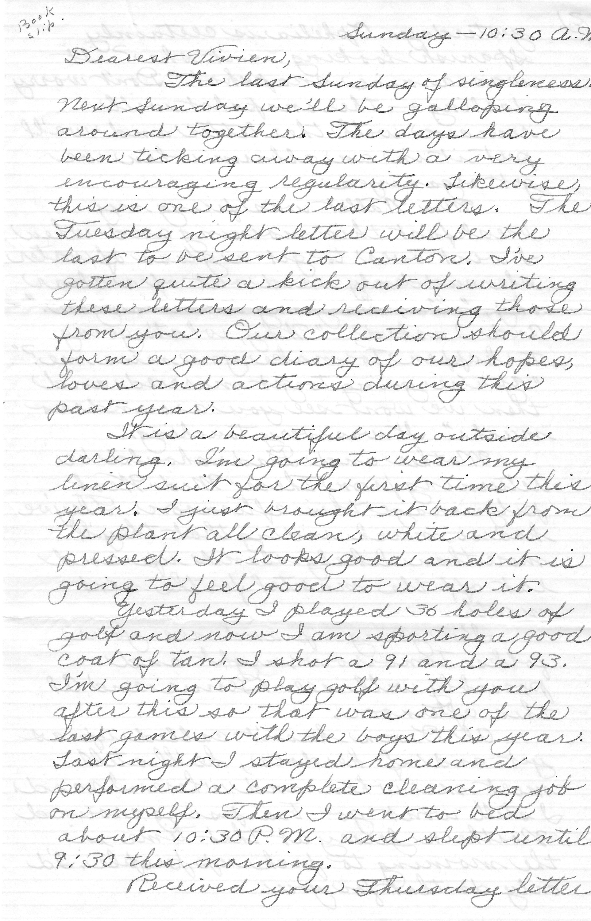 Next Sunday we’ll be galloping around together. The days have been ticking away with a very encouraging regularity. Likewise, this is one of the last letters. The Tuesday night letter will be the last to be sent to Canton. I’ve gotten quite a kick out of writing these letters and receiving those from you. Our collection should form a good diary of our hopes, loves and actions during this past year.