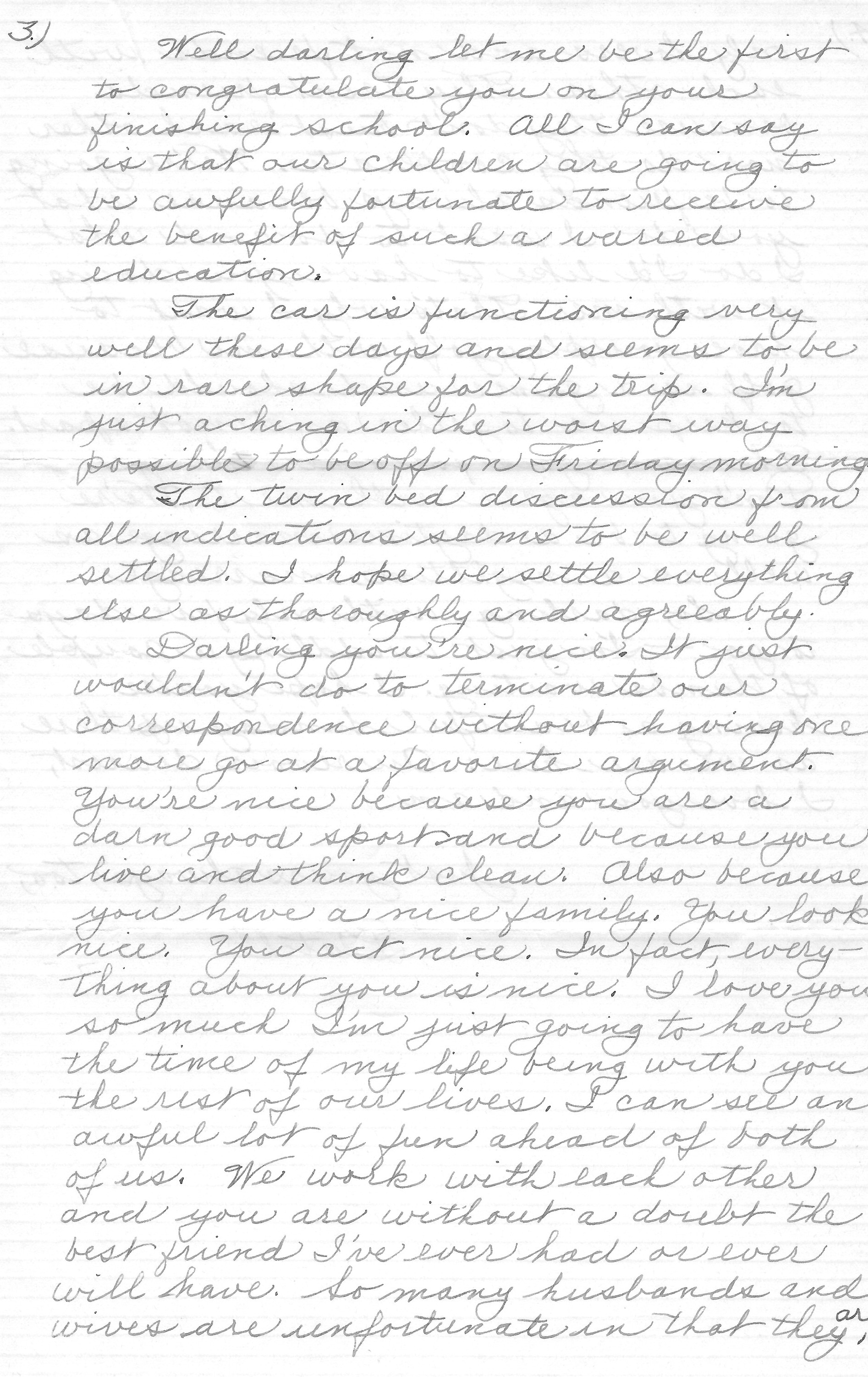 Darling you’re nice. It just wouldn’t do to terminate our correspondence without having one more go at a favorite argument. You’re nice because you are a darn good sport and because you live and think clean. Also because you have a nice family. You look nice. You act nice. In fact, everything about you is nice. I love you so much I’m just going to have the time of my life being with you the rest of our lives. I can see an awful lot of fun ahead of both of us. We work with each other and you are without a doubt the best friend I’ve ever had or ever will have. So many husbands and wives are unfortunate in that they are only lovers and not friends with each other. They aren’t friends because they don’t trust each other nor do they cooperate. We’re going to be friends always because what you do I want to do and what I do I’d like to have you doin git with me. That’s why I want to have you play golf with me because golf is a game and should be to keep us together and not apart. The same goes for other things. Don’t you agree with me? We’re going to be daytime marriage as well as a nighttime marriage.