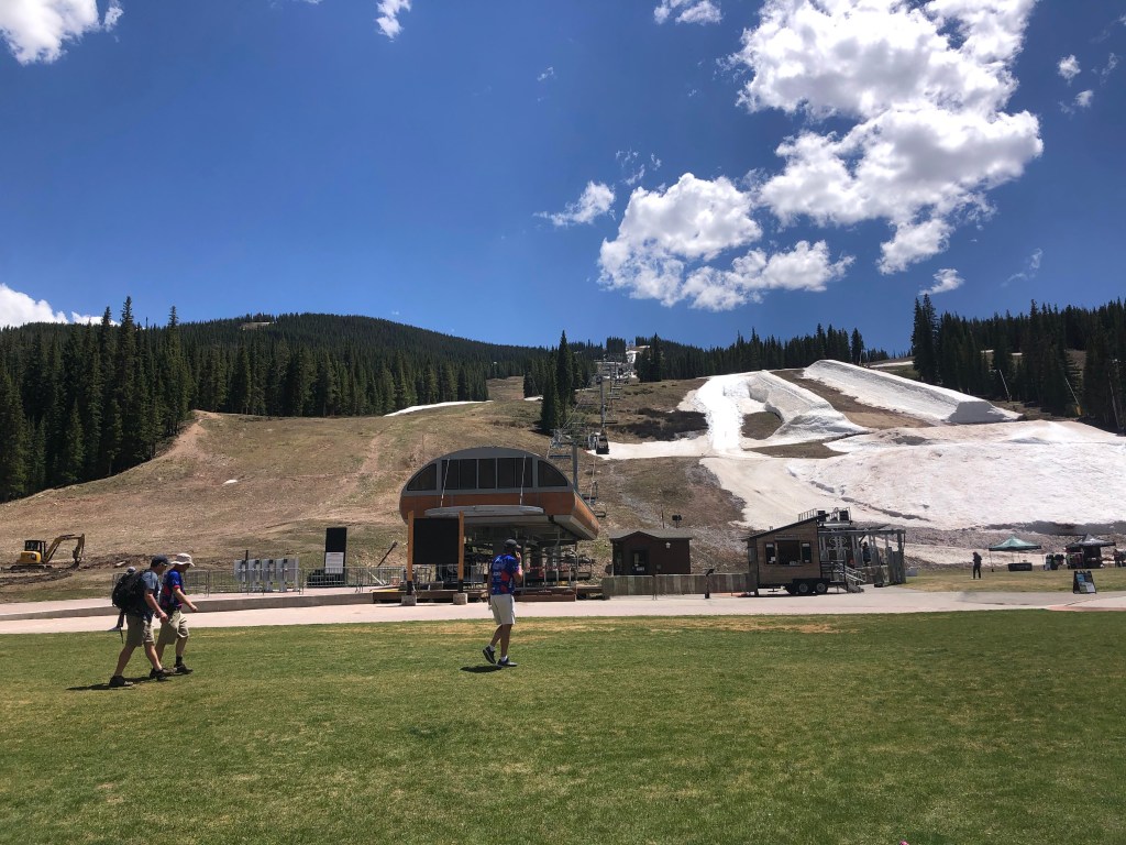 With everyone back, we set out for the final few miles and pulled into a huge brown dirt parking lot where it was about 85 degrees, hot, and apparently where the camping was setup, which included the RVs. There was no shade anywhere, and if I was in one of those tents, I would have had to find someplace else to hang out until the sun went down, but I was in an RV, so we parked, extended the awnings, set out chairs, got down to some serious relaxing before we decided to board a shuttle bound for Ride HQ. Ride HQ is where all the Sponsors/Vendors tents are set up; It’s also where packet pick up is if you didn’t have that mailed to your home already. Ride HQ was setup at the base of a still melting super half pipe creation and up against the business sector of the mountain. I don’t know that this is a town, but maybe think of it as a Strip Mall with a lot of residential rentals. The mountain tries to support a year round crowd, and that crowd needs places to eat, and quaff a few Colorado craft brewed beers.