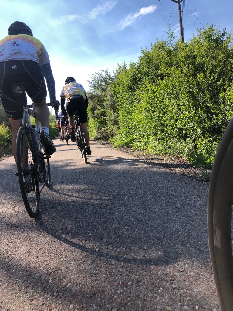 Though we started out together, and though I thought I was going easy, I wasn’t paying too much attention to what was going on behind me. The trail is only so big, and while I wasn’t pushing it, it only takes a few over-takes before separation in the group happens, and if the front of the group doesn’t recognize it, and the back of the group doesn’t accelerate to close the gap, the gap grows, and the problem of closing the gap compounds. It was just such a gap, that wasn’t bridged, when we reached the turn-lefty turn, and it was only Rick, Ken and myself. Turn lefty we did, and then I quickly understood something about Colorado roads. If those roads are state highways, or US highways, or maybe even major local thoroughfares, there is an imposed engineering limit to just how steep the grade can be. That restriction does not exist for “the rest of the roads” in the state. As soon as we turned left, the grade felt like 10%, and remained high for most of the initial ascent. It was with tremendous relief that the only aid station was at the College after we gained all that elevation. Pulled in gladly we did. I think Rick and I held a steady tempo, whereas Ken pulled away, and to be honest, I don’t think I saw Ken again that day. It could be another case of “The Bathroom/Port-a-John hide and go seek” drama that separated us last year. You would think I could spot Ken’s purple Serotta leaning against a hot house of a toilet, but I did not, and maybe I did not again. Rick didn’t like to linger long at Aid Stations, and I was committed to searching out my new acquaintances to see about turn them into new friends, and this seemed like a perfect opportunity to get to know Rick better.