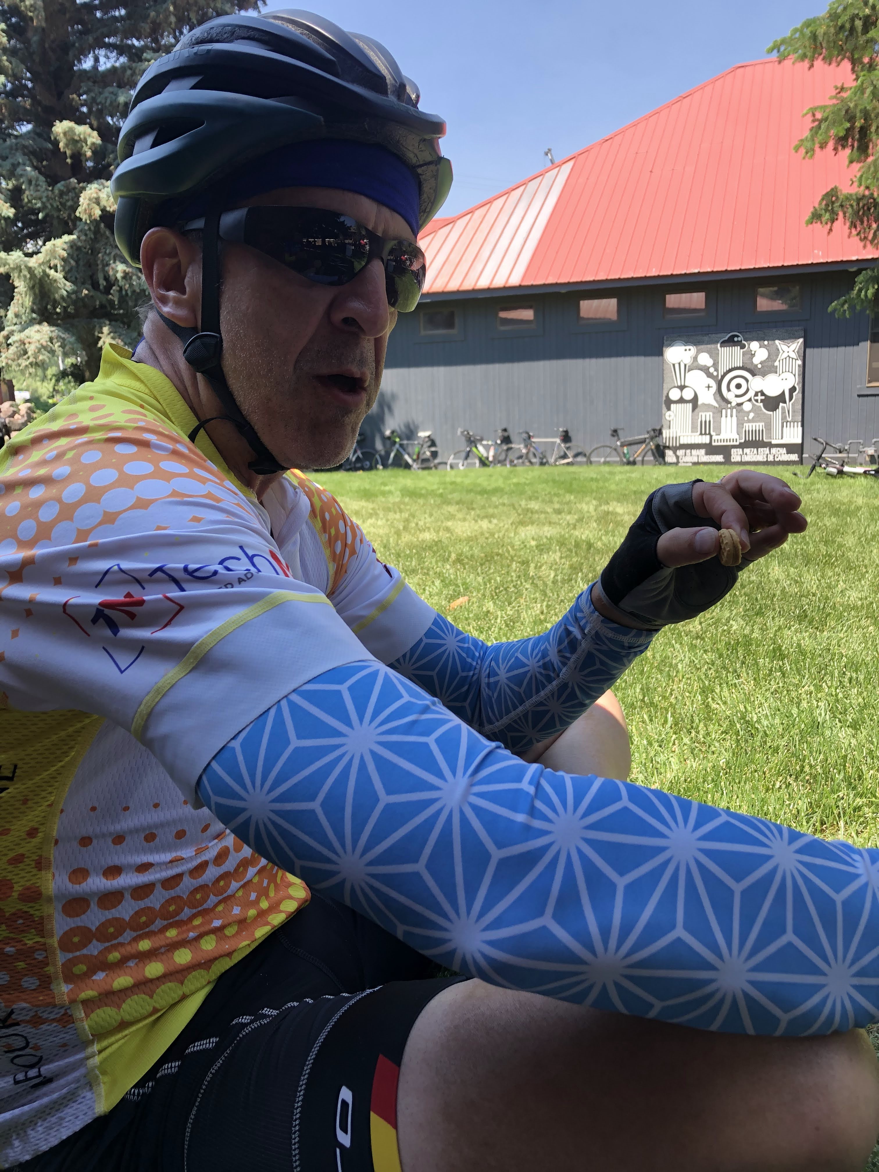 I had been walking around in my socks, because when I was done, I didn’t want to wear my shoes anymore, and with all the pine trees around, I had only just become aware of the shit that was sticking to the bottom of my socks. Not just “things” but I had accumulated enough sap that no matter what I did, shit just attracted itself to my socks and so when I decided that I should go look for the RVs, I had to separate myself from a shitload of detritus from the bottom of my socks. I should note here that the hotel people, weren’t staying in Basalt. No. Those poor mother-fuckers were all set up in Snowmass. What the fuck is that you ask? Imagine it this way. You are a lucky contestant of Let’s Make a Deal. You have finished the ride, and that is your reward. You are done for the day. However, you can keep your reward, orrrr, you can trade it for whatever the fuck lies behind doors number 1, 2 or 3. The problem here is that nothing but a fucking hard extra 25 miles and 2000′ lie behind each door, and there is no shuttle to get there, so really your only choice is between a douche and a vesectomy in term of overall discomfort to get to your hotel. I shit you not. So, having endured a V already, Ken had set out. Now for those that are paying attention, yes, that means that on tomorrow’s stage, Ken actually has 20 miles less to ride, and 2000′ less to gain, but I will let him comment directly on his thoughts with respect to this engineered day.