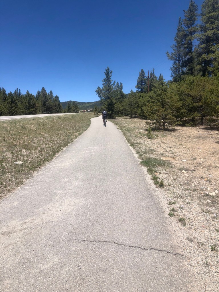 It was still about 8 miles to the top (I think I saw a sign), and I soon passed a mile marker along the highway, though I wasn’t sure whether the next mile marker would be 1 greater than, or 1 less than the one I just saw, so until I reached another, I was shooting for either of two numbers ascending or descending. Then I passed a sign that said 4 miles to the top and I decided I would stop every mile after that on way up. Take a drink, stretch the legs and then proceed. It was after starting again than who should I ride by but Paul, Po and Rick as they were doing the same thing. After pulling over again later they passed me again and I eventually found them at the top where we all took a break. It was downhill from here all the way into Breckenridge, so no real work left to get there. It was simply a matter of how fast you descend determining when you get in.