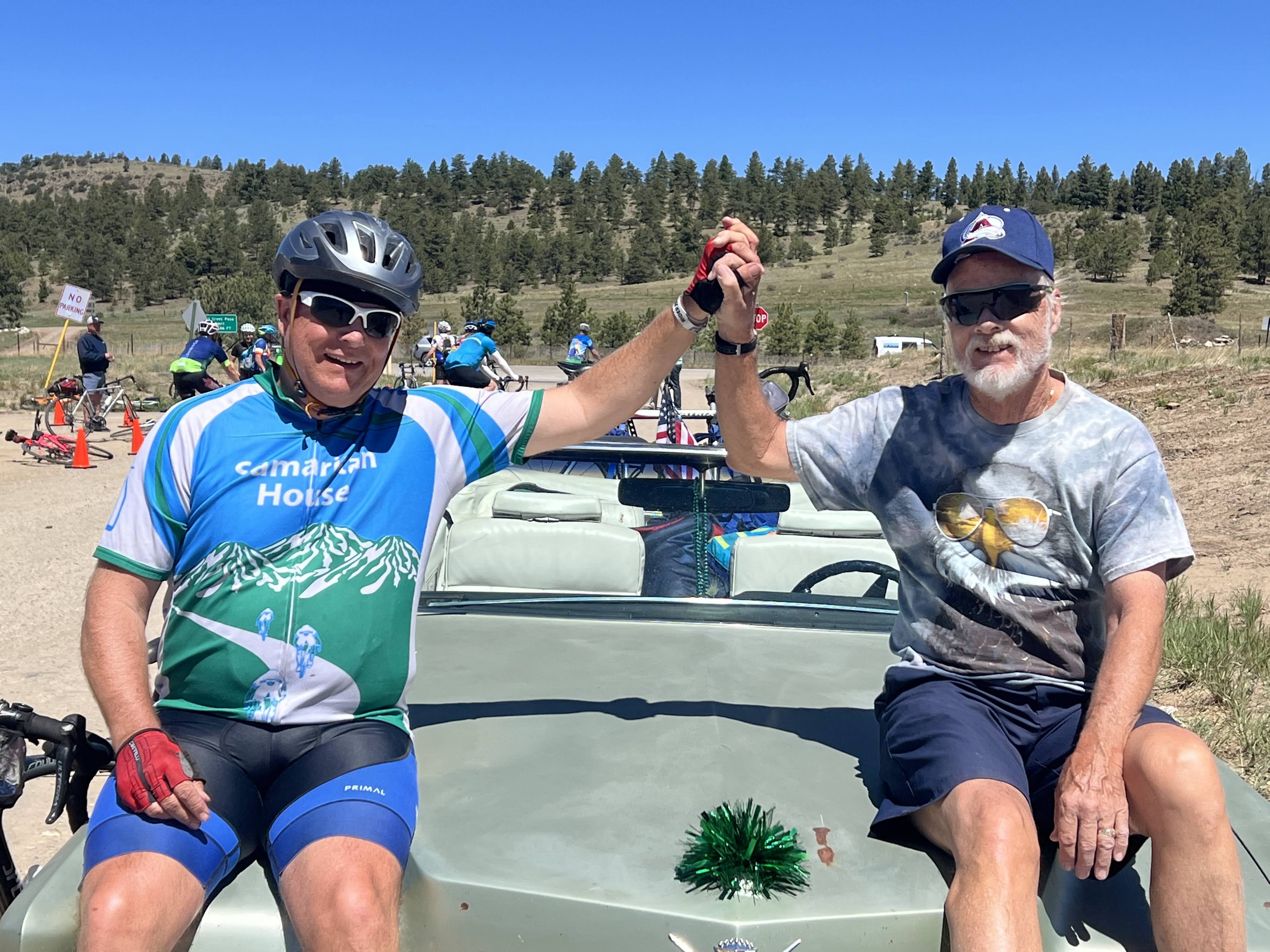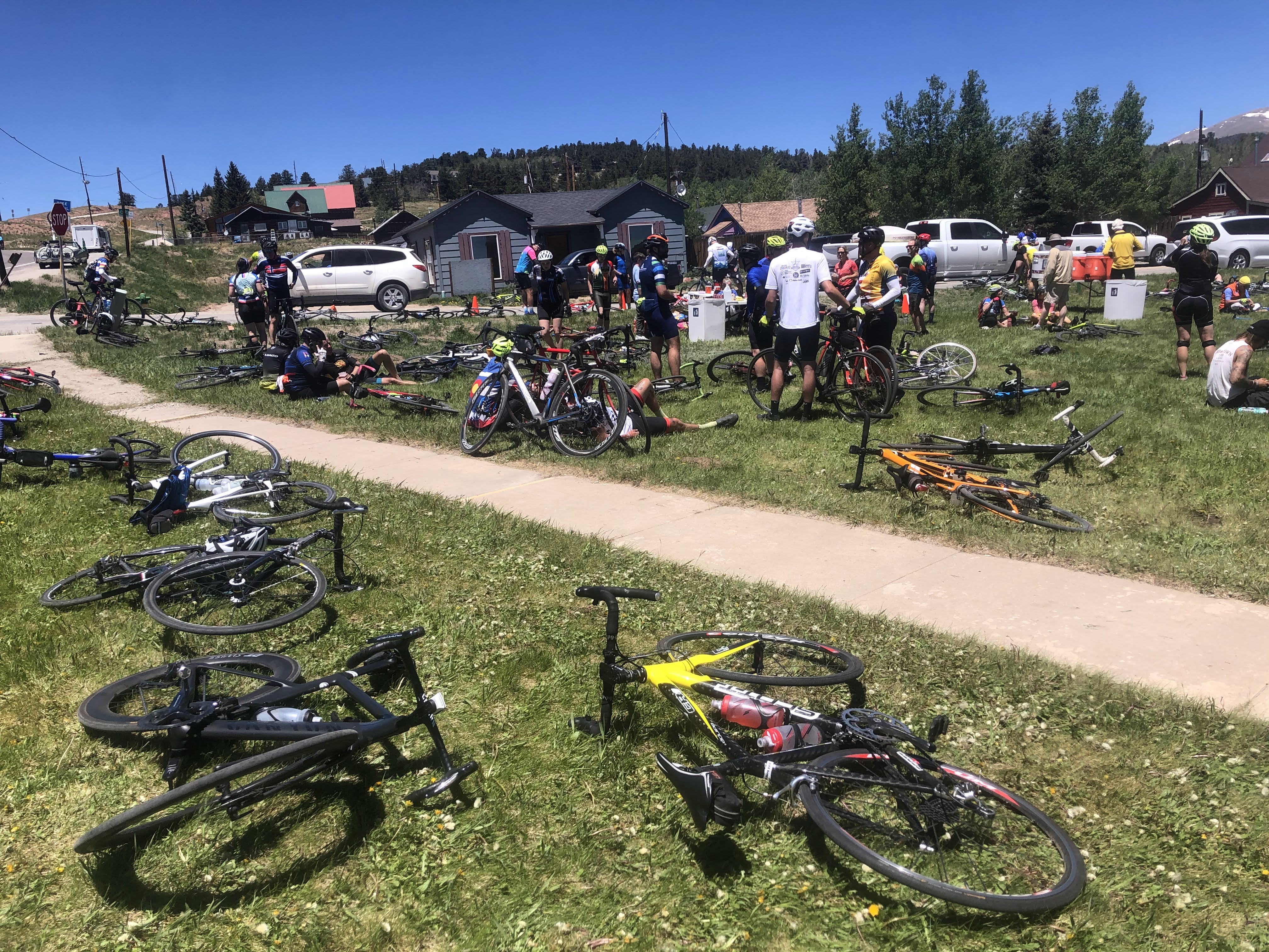 It stayed this way all the way into Fairplay where we finally egressed from 285 onto 9 which would mark the real climb to Hoosier, and our drop into Breckenridge. I was still moving, and to be honest I don’t think I got any worse as the day wore on. I was fatigued still, and the bad taste was still there. I spotted some Samaritan Cycling jerseys at a small shop in amongst an array of other various jerseys, and Ken was there, so I pulled in. He had downed a drink, and told me “the wait for food was looong”, and then checked to see how I felt and if I was going to stay or go. I chose to stay, and he went, but I didn’t stay long. The wait was indeed long, but that was for something cooked, so I bought a drink, and an energy bar and say outside talking to Roger while I refreshed. Again, I could taste the bar, so I am feeling like the whole day is just fatigue, and when I was done, I got back on and rode another mile when I ran into the 3rd Aid Station where I didn’t hesitate to get off the bike again. I found some pickle juice, topped off my water, used the facilities, and then set out.