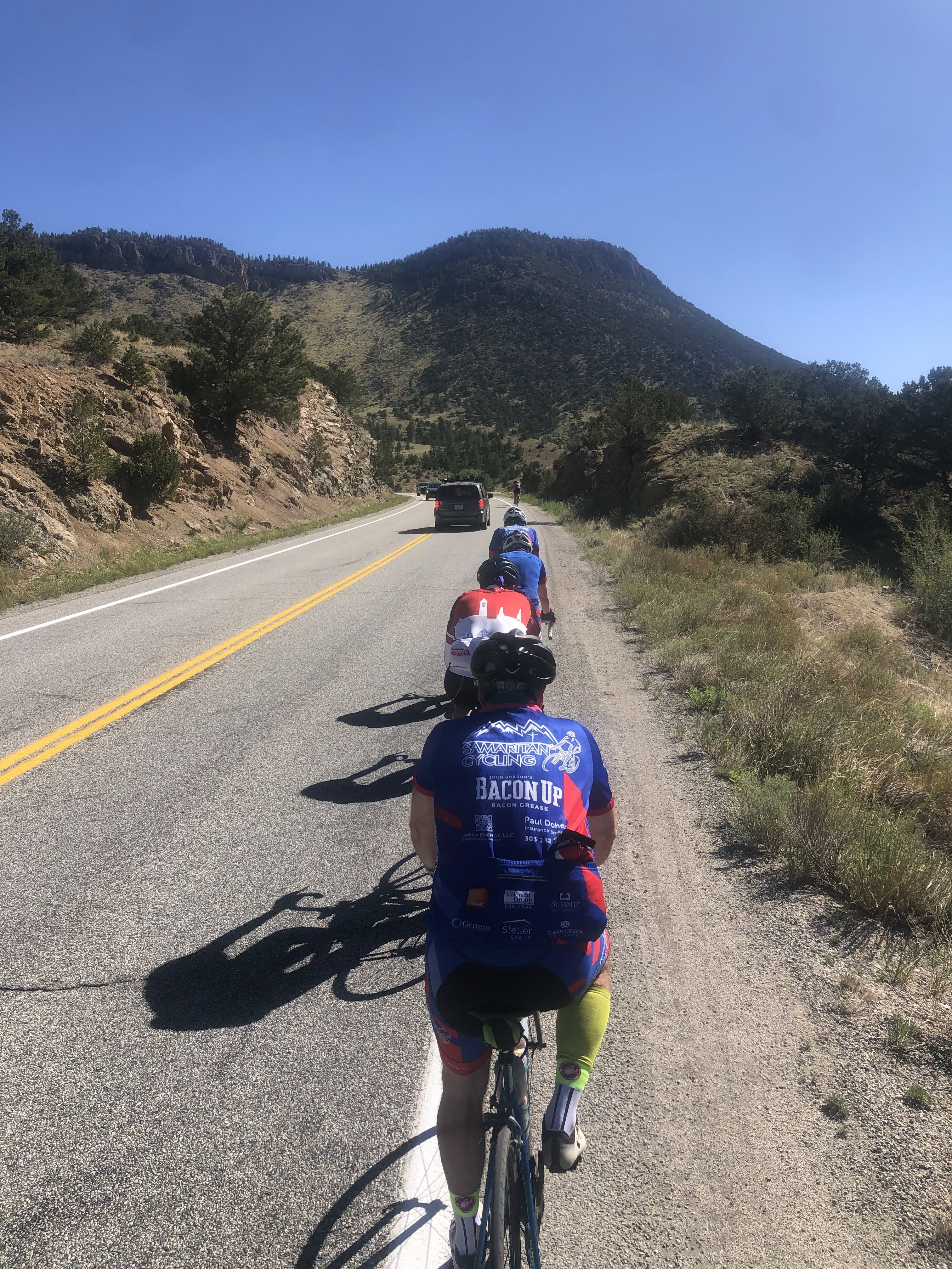 This is where the insanity of Route 285 hit us hard. Up till this point we had a nice wide shoulder that allowed plenty of room for us to rotate without needed the northbound lane, however when we went over the crest after the Aid Station, the nature of that should changed dramatically. Besides shrinking down to about 24″, rumble “Wake the fuck up!” strips were milled into the shoulder to alert anyone who was about to veer off the road. There is NO speed on a bike where “Wake the fuck up!” rumble strips feel okay on a bike. While we could manage our pace line in that small shoulder, you have to remember that we aren’t the only ones on the road. Riders moving faster than us passed in the lane of traffic, as we had to do when we were passing riders slower than us. The speed limit on 285 at this point is 65 mph, and very few drivers (trucks included) slowed their progress when they were overtaking riders. Worse still were the sections without an extra passing lane where passing was allowed. I wasn’t paying attention to that, and I don’t think anyone else was either, and then a passing car went past us in excess of 80 mph in the other direction that scared the “brown stuff” almost right out of me. That was absolutely crazy, but there was nowhere else to ride. The “wake the fuck up!” rumble strips did not end when the descent was over but continued with us. Remember also that those same rumble strips exist in the middle of the road too, and some drivers are nervous about crossing those. Fortunately some trucks did their best to give room, but they were still passing us very quickly. This is where the Route designers, and organization failed us. I get that there wasn’t an alternative route, so maybe until there is an alternative route, they shouldn’t use that road, but if they do, then they need to control it. North and Southbound traffic should have been limited to 30 mph speed limit with NO passing unless an additional lane existed, AND there should have been a heavy state trooper presence “slowing” the traffic while there were any RTR riders on that segment of road. Basically what was demonstrated to us, the riders, was that people basically didn’t give two shits about our safety. That goes for all those drivers, and some of that responsibility is on the organization as well.