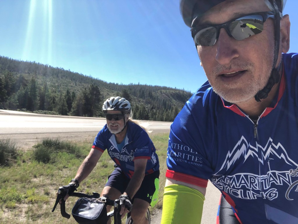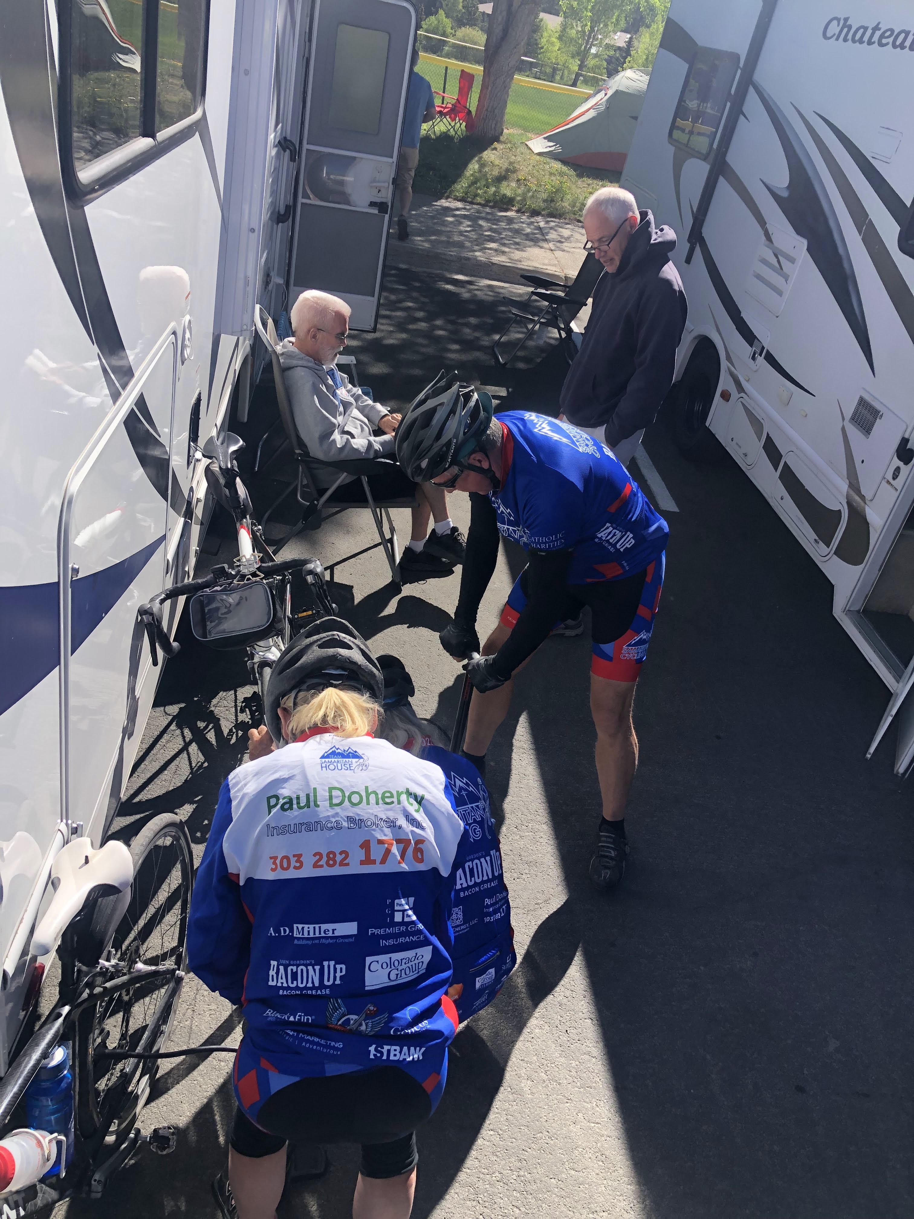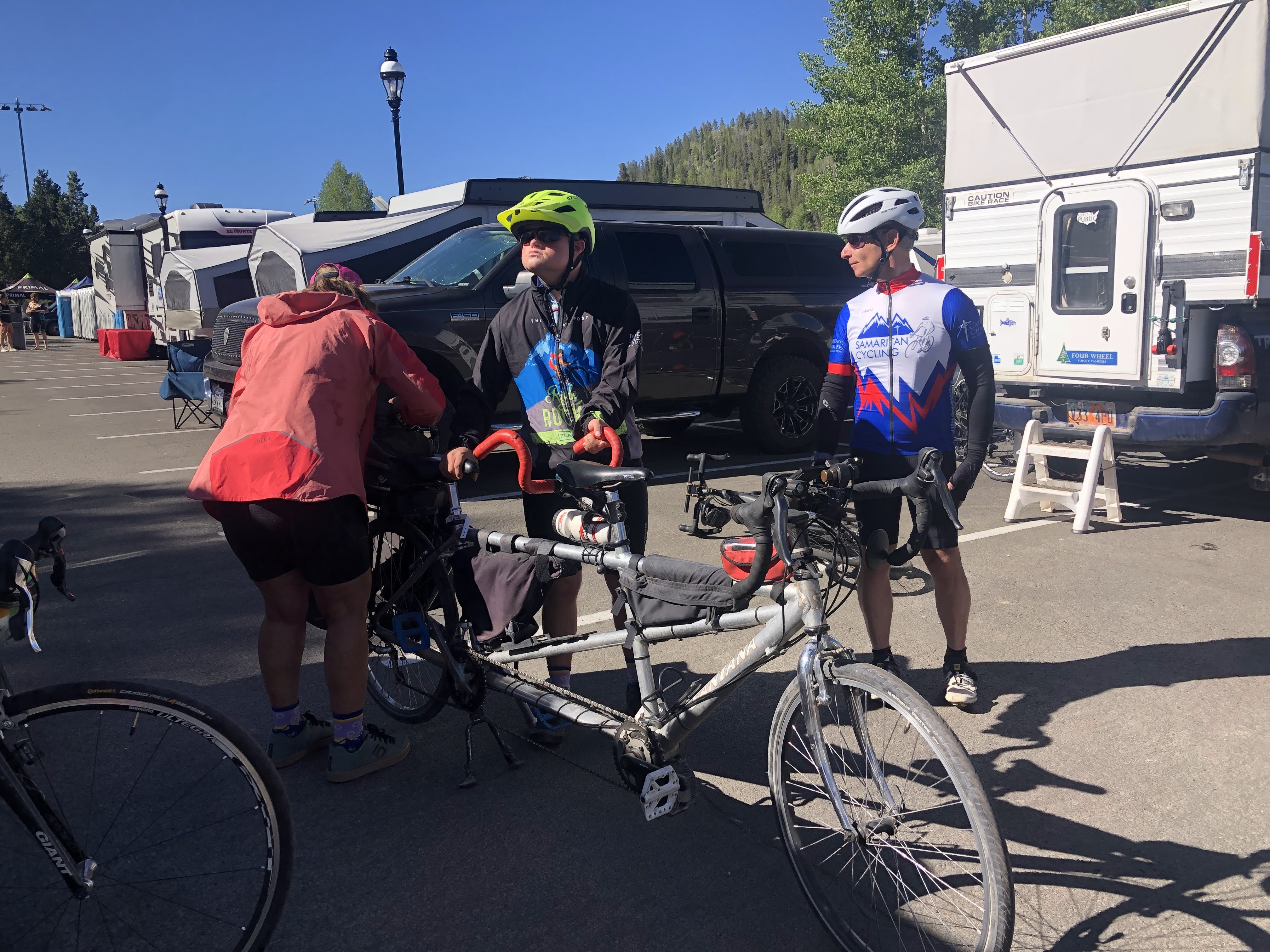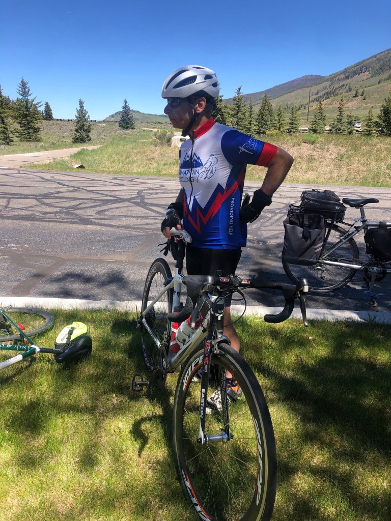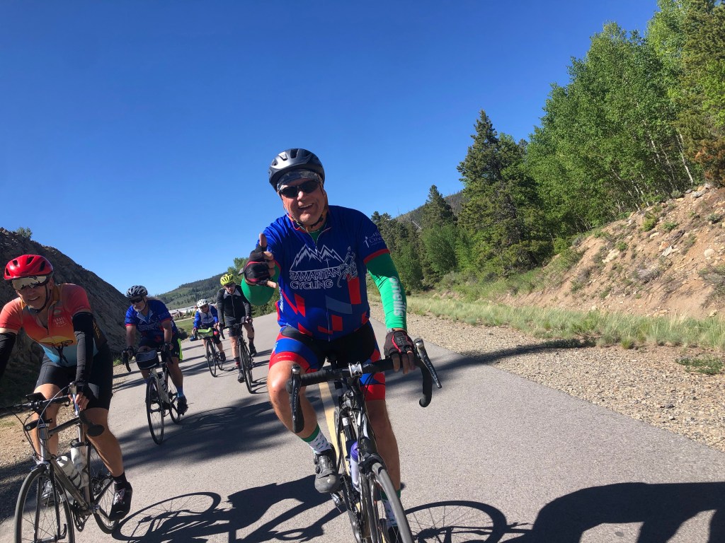 It became pretty clear that though we started as a large group we were going to finish as a bunch of smaller groups. I think that is simply because little things happened to break a group up, from simple things like stopping to take pictures, to some wrong turns, to perhaps some mechanicals, but Tommy Dea and I were still with a fair number of team members when we started up Swan Mountain with me learning that “No, other than turning around, there was no way to avoid Swan Mountain”. So, up Swan Mountain I went. Now Swan is not a big climb, but while it is often climbed by bikes, it doesn’t really have the full bike lane infrastructure that it should have. The shoulder shrinks as elevation is gained, and at some point a separate path does branch off to bring the rider to the apex of the climb and thus avoid the dodgiest section of roadway where the shoulder is near non-existent and the traffic behind possibly most annoyed. There was a course marshal guiding everyone onto that path, but Tommy Dea wanted to stay on the road, and so I followed him to keep him company to the top, and maybe provide either a bigger target for the vehicles trying to hit us, or a bigger obstacle for those trying to avoid us. Take your pick! Tommy and I reached the top and awaited on the others who took the bike path (which actually loses elevation before gaining it back). Apparently the bike path didn’t take you around the summit, it took you to the summit. All together again, we descended and all met up again at the Aid Station at the bottom. Did they need an Aid Station? I guess that depends on how many riders took in Ute Pass, then maybe “Yes”. We didn’t really need it, but it was an opportunity for us to regather again. Even though it was a short descent, that was enough to stretch it out again. I seem to recall that Tommy Dea found people he knew at this Aid Station where it always seemed like he was seeing people for the first time in years. “Everybody loves Tommy Dea” was a refrain I heard often from Paul spoken in his Irish brogue, and that is what it looked like to me.
